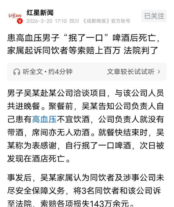 “讹天讹地讹空气!”陕西渭南,男子去一公司谈项目,告诉对方自己有高血压,吃饭时,无人劝酒,结束时男子主动抿了一口啤酒表示感谢,次日,男子竟在酒店意外身亡,家属将3名同饮者和公司告上法院,索赔143万,法院作出公正判决。   事情发生在2023年5月15日,男子吴某去渭南当地一家公司谈项目,毕竟是商务往来,谈完项目后,公司这边就组织了聚餐,一共9个人一起去了餐厅。   吴某一开始就很实在,主动跟公司负责人说,自己有高血压,不能喝酒,负责人听了也很上心,干脆就没带酒入席,全程都没提喝酒的事。   不过聚餐的时候,有公司的工程师自己要了三瓶啤酒,就三四个人分着喝,最后也没喝完,总共还不到两瓶,整个吃饭的过程,没人劝吴某喝一口酒,也没人向他敬酒,大家都记着他有高血压的事,刻意避开了酒这个话题。   眼看聚餐快结束了,吴某可能觉得人家热情接待,自己不表示一下不太好,就拿起一个小玻璃杯,倒了大概三分之一的啤酒,自己轻轻抿了一口,算是表达感谢,晚上8点多,公司安排车辆把他送回了提前订好的酒店,看着他安全进了房间,工作人员才离开。   谁也没想到,意外会来得这么突然,第二天下午1点左右,酒店工作人员查房,想问问吴某要不要续住,结果发现他躺在房间的地上,赶紧打了120,可送到医院后,还是没救过来,医院出具的死亡证明写着,死因是呼吸心跳骤停。   事后家属说“死者为大”,不愿意做尸体解剖,也排除了刑事案件的可能,亲人突然离世,家属肯定特别伤心,可接下来的操作,就让很多人不理解了。   他们认为,一起吃饭的3名同饮者和接待吴某的公司,没有尽到安全保障义务,把这4方都告上了法院,一开口就索赔143万。   说白了,这案子的关键就两点,一是同饮者和公司有没有过错,二是吴某的死和那一口啤酒有没有关系,法院查清楚后,一审直接驳回了家属的全部诉讼请求,家属不服上诉,二审还是维持了原判。   法院的道理其实很简单,吴某是成年人,自己知道有高血压,也清楚喝酒可能有风险,没人劝他,是他自己主动抿了一口。   而且公司已经做到位了,提前订酒店,饭后安全送他回去,同饮者也全程没劝酒,尽到了该有的注意义务,更重要的是,没有任何证据能证明,他的呼吸心跳骤停和那一口啤酒有直接关系。   这事传开后,很多人都有感触,不是说亲人离世不可怜,而是不能不管事实,随便找别人担责,成年人就得对自己的身体和行为负责,不能因为出了意外,就把责任都推给别人。   法院的判决也很公正,既没让无辜的人背锅,也给大家提了个醒,聚餐时尊重别人的身体状况,不劝酒是底线,而我们自己,更要守住对自身健康的责任。   整个事就是这样,没有夸张的情节,也没有复杂的弯弯绕,说到底就是一场因意外引发的纠纷,而法院的判决,也厘清了该有的责任边界,守住了公平。