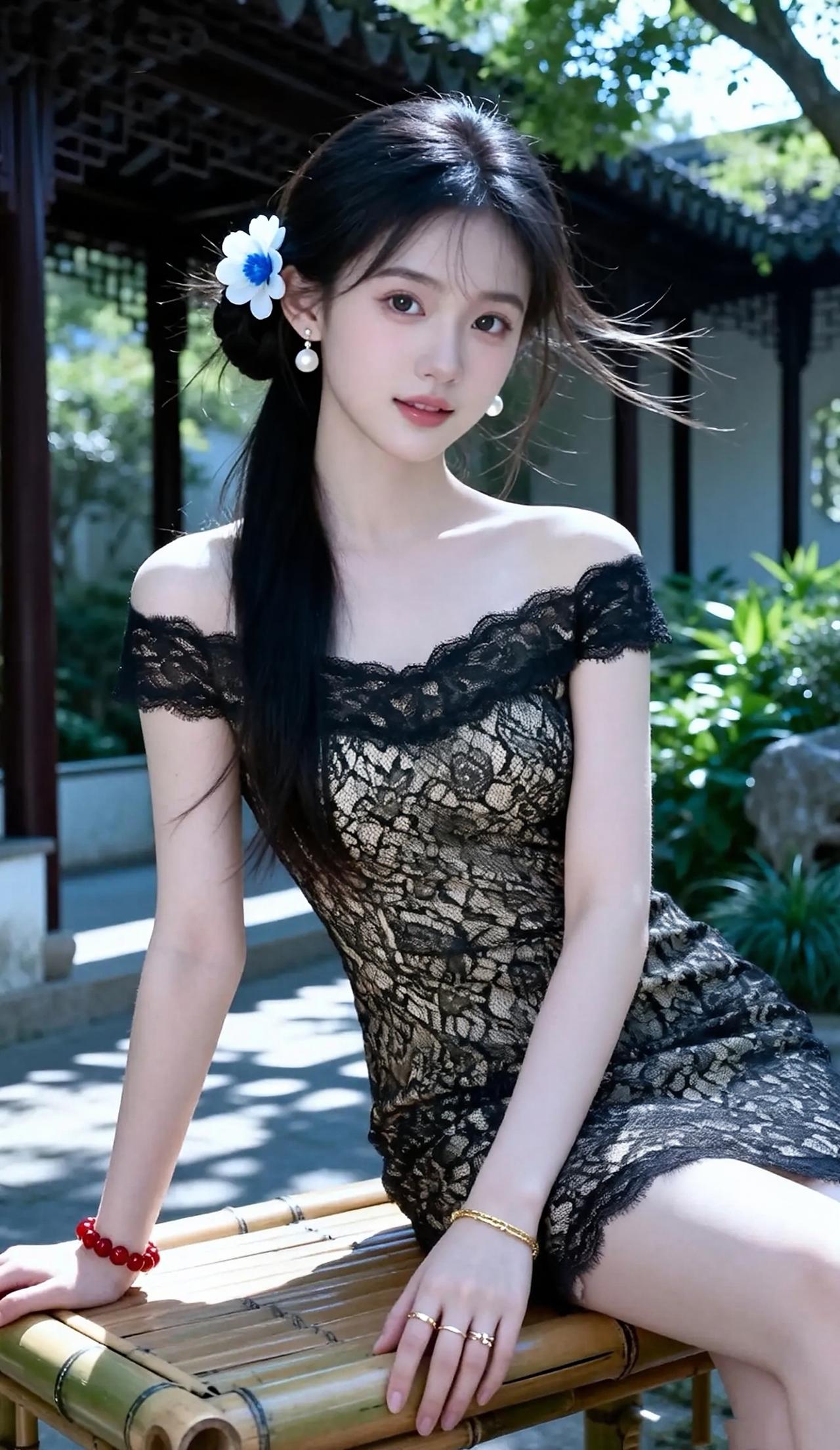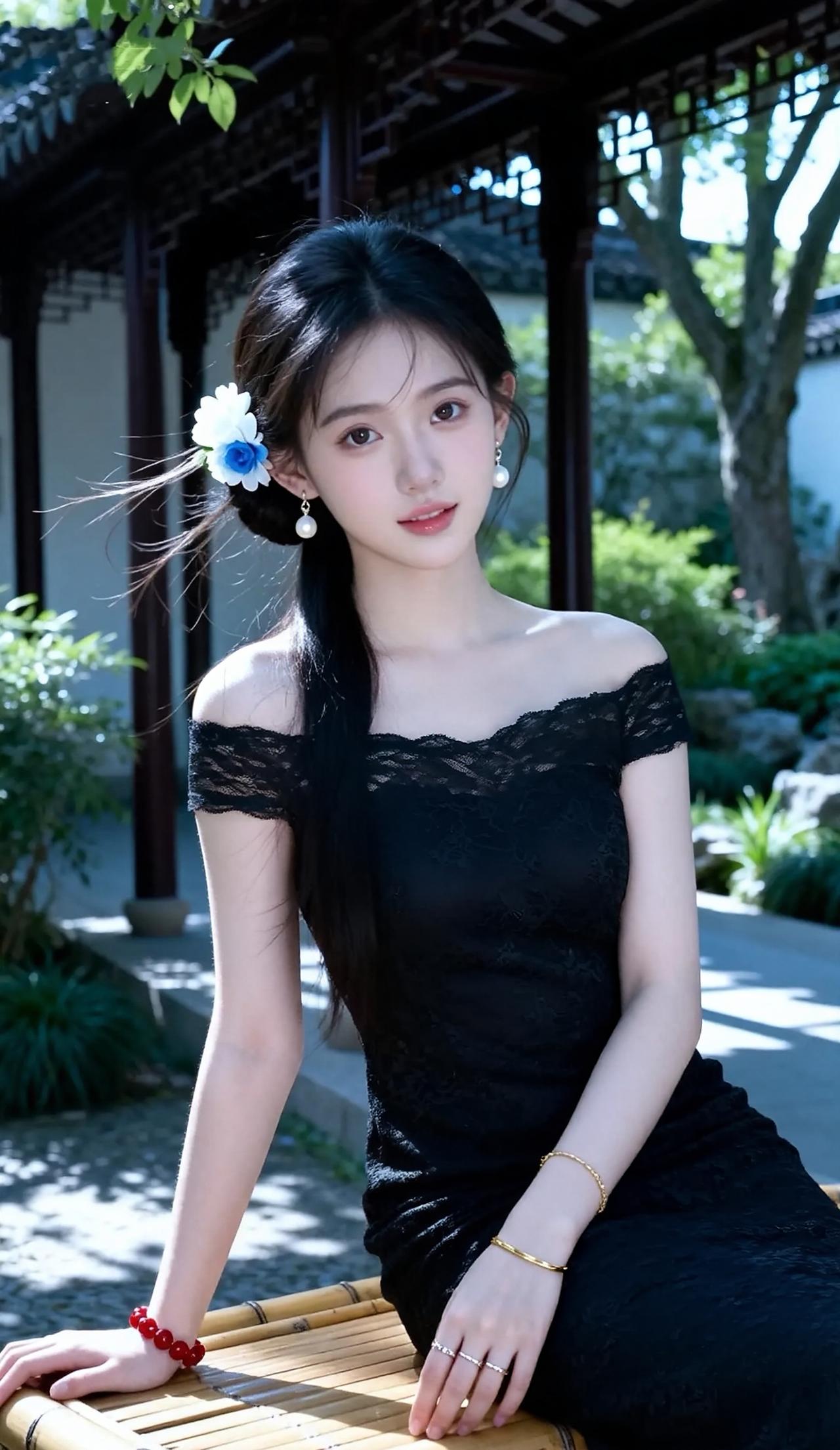 整体造型 她身着一袭黑色蕾丝修身长裙,采用一字肩设计,露出精致的锁骨与优美的肩颈线条,尽显优雅与性感。裙身的蕾丝花纹繁复细腻,勾勒出曼妙的曲线,高开叉的裙摆设计,增添了几分妩媚与灵动。 妆容与发饰 乌黑的长发被精心盘起,一侧垂下一缕青丝,发间点缀着蓝白相间的花朵发饰,与珍珠耳饰相得益彰。眉眼如画,唇色嫣红,肌肤胜雪,在光影下更显清冷脱俗。 场景与氛围 背景是雅致的江南园林,亭台楼阁、绿树成荫,阳光透过枝叶洒下斑驳光影。她轻倚竹椅,姿态慵懒又不失端庄,眼神清澈含情,一颦一笑间尽显东方女性的温婉与风情,氛围感拉满。