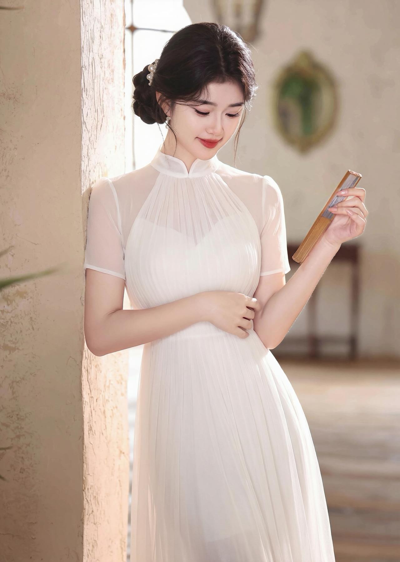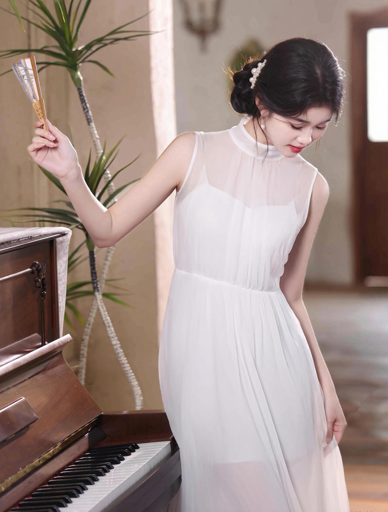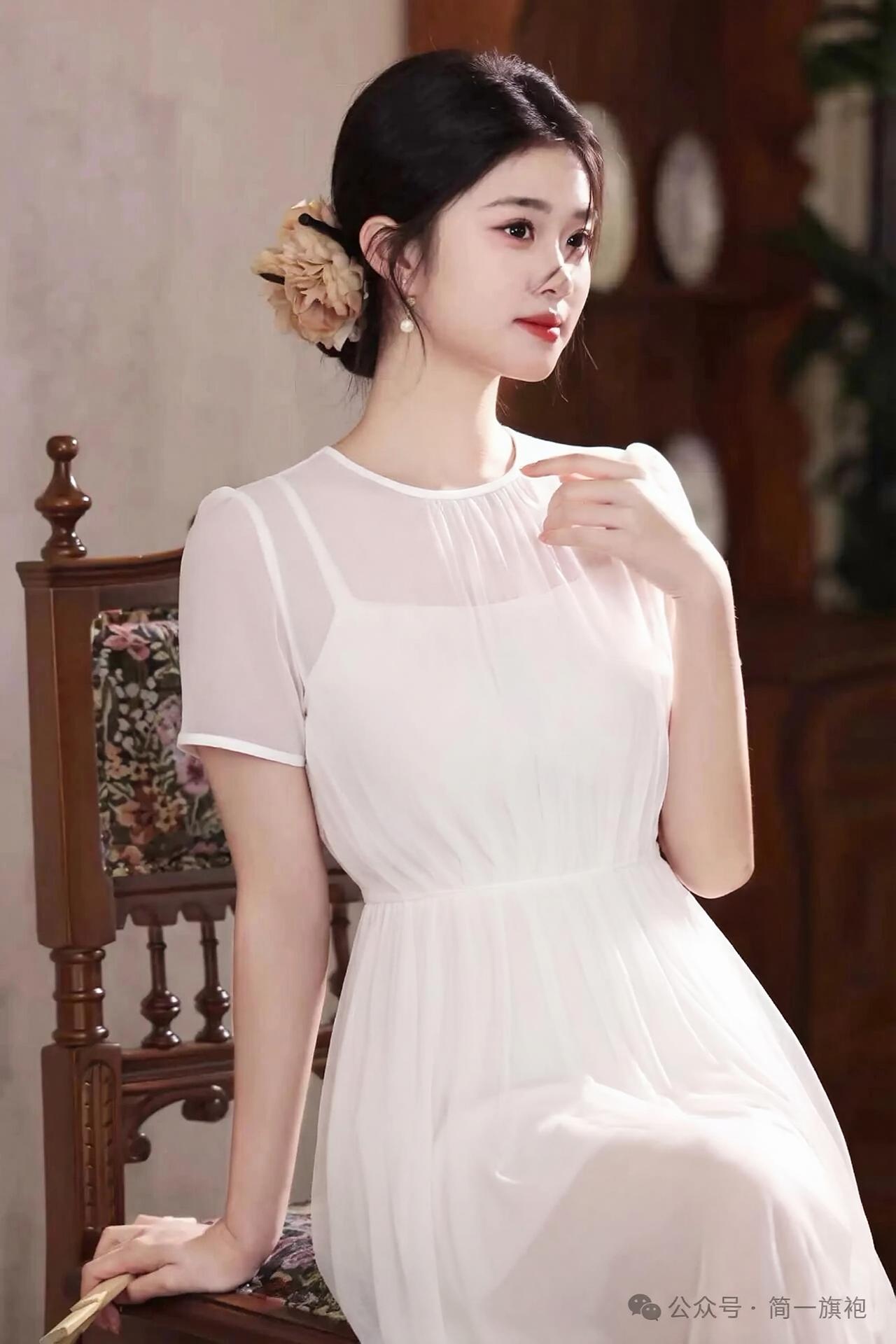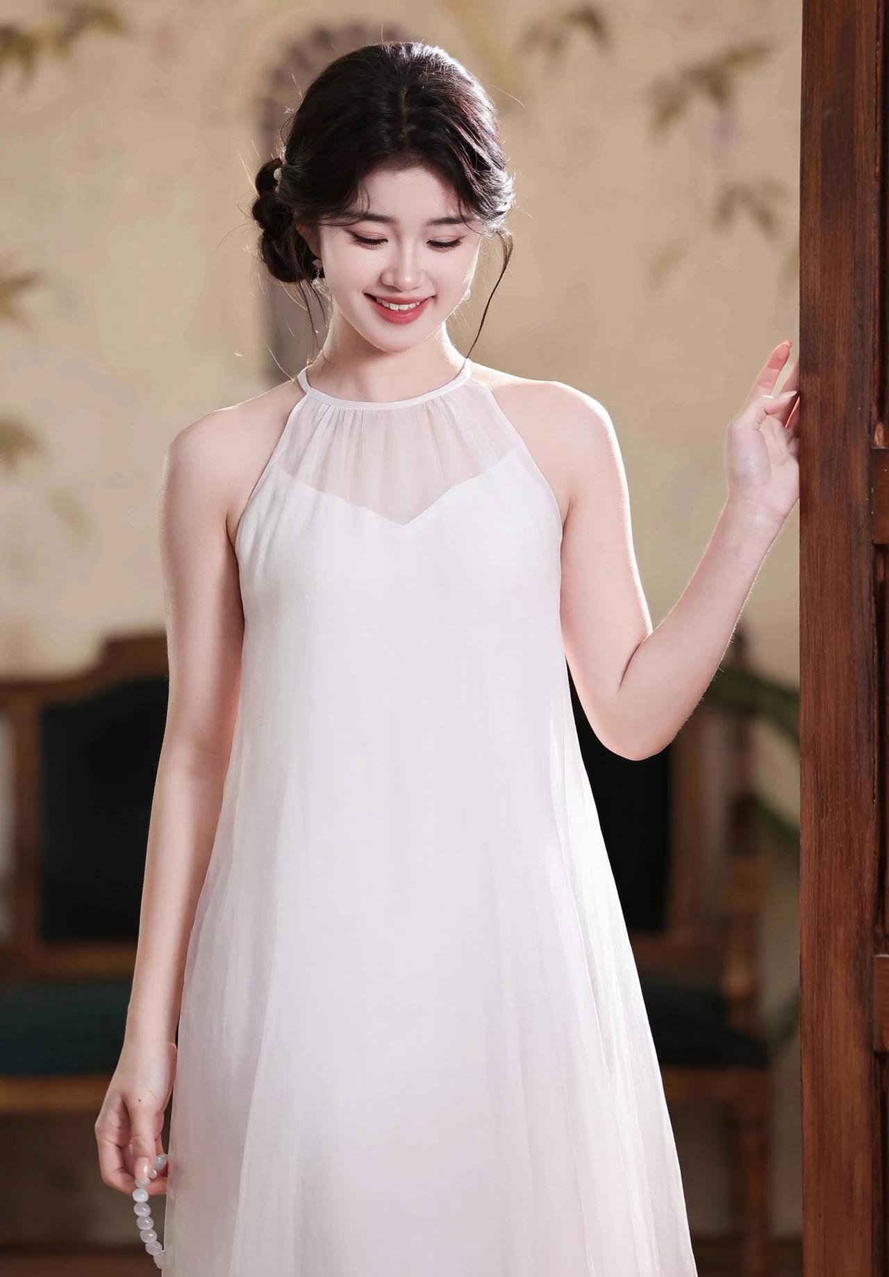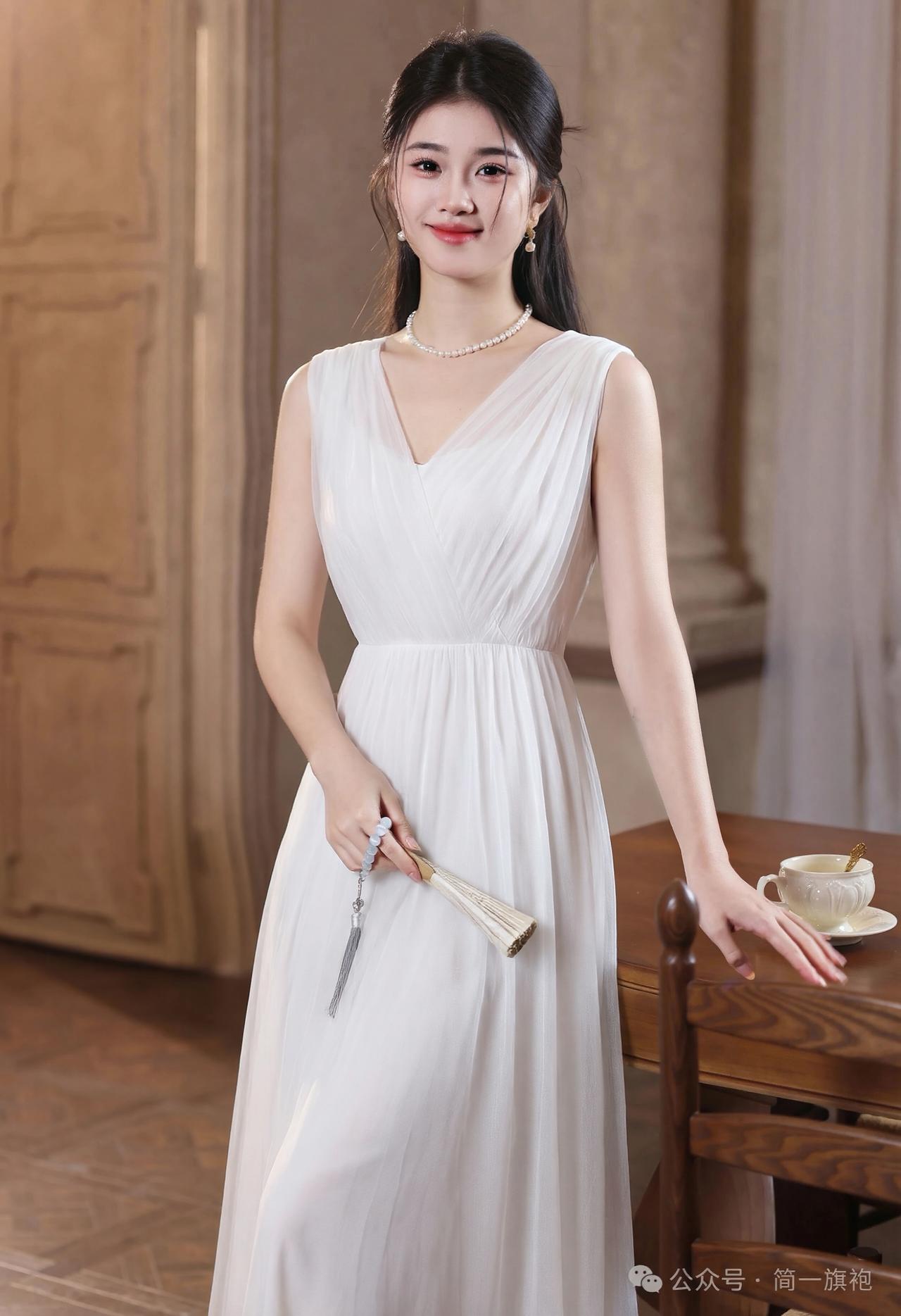 裙装细节 材质:轻盈飘逸的雪纺/网纱面料,自带朦胧柔光,行走间如流云拂动,仙气十足。 设计:多为无袖挂脖或V领剪裁,线条流畅,巧妙勾勒出优美的肩颈线条与锁骨,温柔又不失小性感。腰部自然收束,裙摆垂坠感极佳,尽显曼妙身姿。 风格:融合了新中式的雅致与法式的浪漫,简约大气,自带清冷高级感。 整体氛围 搭配精致的低盘发、珍珠耳饰与折扇,在复古木质家具与暖光的映衬下,宛如从画中走出的大家闺秀,一颦一笑皆是风情,温柔又治愈。