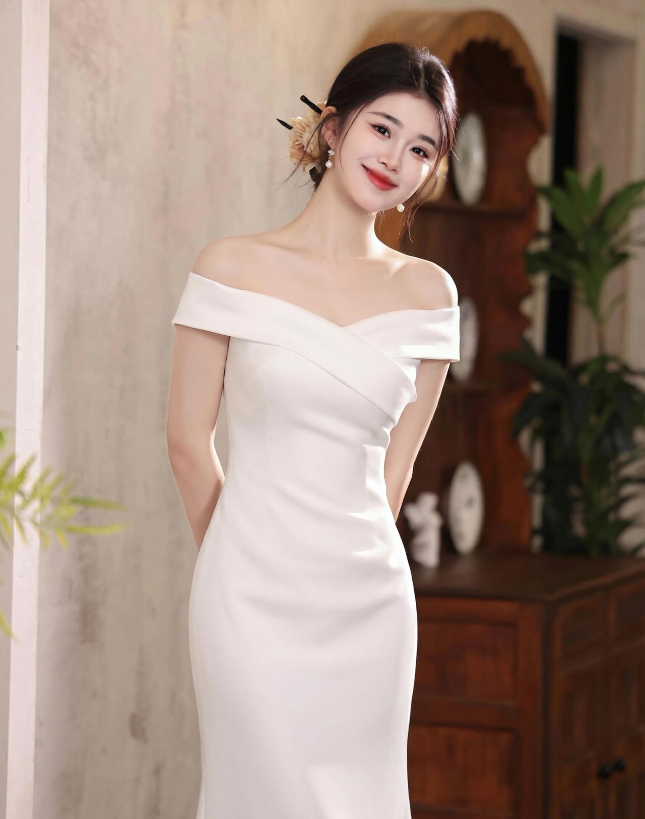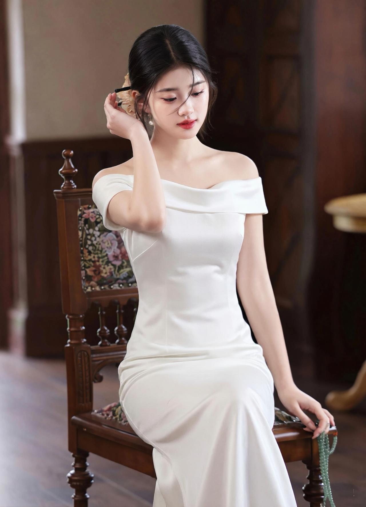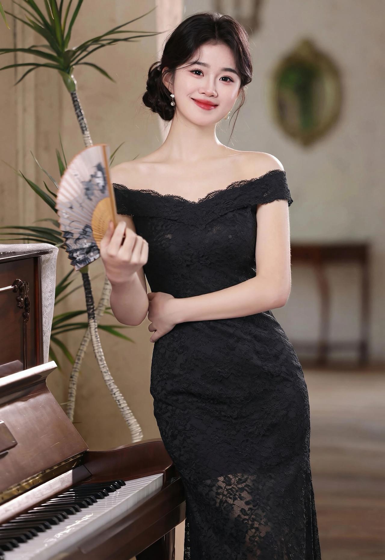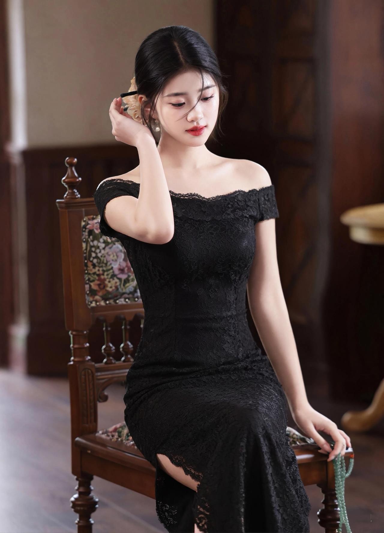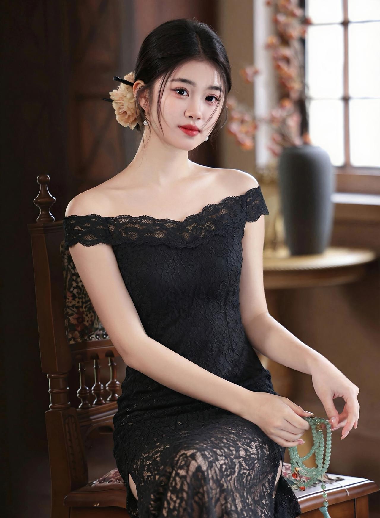这组照片中的女子,完美演绎了白月光与朱砂痣的极致反差,一黑一白,皆是风情。 【白色缎面 · 清冷高贵】 她身着一袭白色一字肩缎面长裙,面料丝滑垂顺,泛着高级的柔光。一字领设计露出优美的锁骨与天鹅颈,勾勒出曼妙的身姿。乌黑的秀发盘起,搭配精致的花朵发饰,眉眼清澈,气质清冷又高贵,宛如不食人间烟火的仙子,端庄大气,自带疏离的美感。 【黑色蕾丝 · 妩媚性感】 换上黑色蕾丝一字肩长裙,瞬间切换成妩媚风情的模样。精致的蕾丝花纹繁复细腻,勾勒出玲珑曲线,高开叉的裙摆增添了几分撩人气息。红唇点缀,眼神流转,在复古的光影下,尽显东方女性的神秘与性感,优雅中带着一丝慵懒的魅惑。 【整体神韵】 无论是纯白的圣洁,还是纯黑的魅惑,她都驾驭得游刃有余。一颦一笑,或端庄或妩媚,举手投足间皆是万种风情,美得极具冲击力。