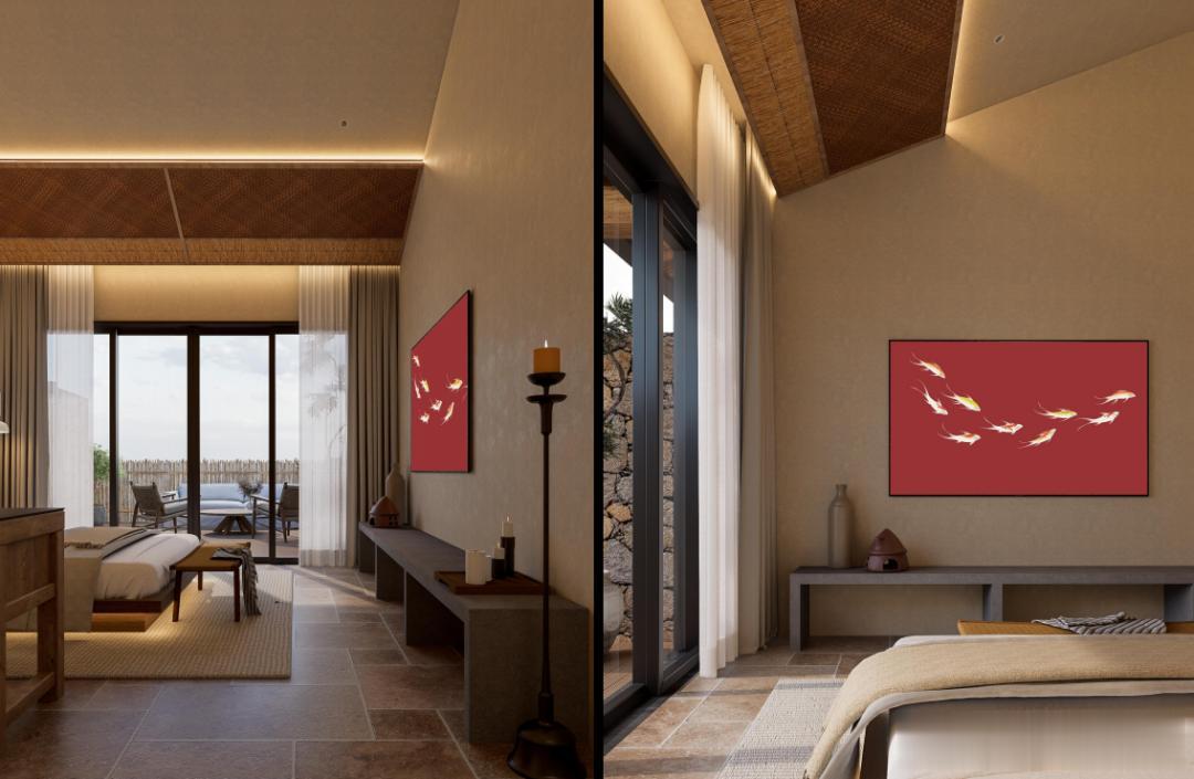 一期建成的民宿休闲区,绝非城市酒店的翻版。它们低伏于地,取材于自然,巨大的落地窗是活动的画框,将山、湖、林、田的四季变幻,无偿赠与每一位住客。