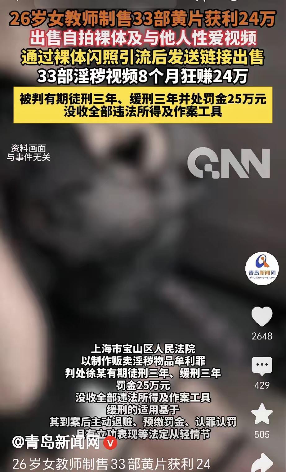 “想钱想疯了?”湖南祁东,一女教师嫌收入太低,为了挣钱,自己拍自己,她做成闪照发到群里,一些男子加她为好友,之后她把自己的各种视频,还有和其他男子拍的视频,以199元,299元的价格打包出售,一共卖了33部,挣了24万,可没想到,结果令她始料未及。 26岁的徐某,有很好的职业,是某职业中专的老师,她站在讲台上,令人尊重,教书育人。 1998年出生的徐某拥有正式教师编制,在当地职业中专任教,这份工作稳定体面,在当地算得上是让人羡慕的岗位。她日常站上讲台时,能完成基础教学任务,可内心始终对固定薪资抱有不满,总觉得合法收入无法满足自己的消费需求,便开始动起歪心思寻找快速赚钱的途径。 2023年9月起,她开始在各类男性社交群内发布本人的闪照,依靠这种低俗方式吸引陌生男性添加私人微信。成功添加好友后,她便向对方推销自制的淫秽视频,还搭配与他人拍摄的违规视频,设置199元、299元两档打包售价,依靠这种违法手段,短短数月售出33部视频,非法获利累计达到24万元。 她始终抱有侥幸心理,认为网络交易隐蔽性强,闪照阅后即焚不会留下痕迹,私下售卖视频也不会被外界察觉。她白天在校园里维持着教师的端庄形象,晚上躲在屏幕后进行违法交易,完全抛弃了教师的职业操守,也无视了法律的明确约束。 网络空间不存在绝对的隐蔽,她传播的低俗内容在扩散过程中被多名网友举报,相关线索很快被移交至警方。办案民警通过网络数据追踪、资金流水核对、账号信息取证,快速锁定徐某的真实身份,完整固定了她制作、贩卖淫秽物品的全部证据。 到案后的徐某无法抵赖,如实交代自己的全部违法行为,她坦言自己只是嫌弃教师收入偏低,想走捷径牟利,从未意识到行为已经触犯刑法。当地教育主管部门第一时间作出处理,开除徐某公职并永久撤销其教师资格,她彻底失去教育行业的从业资格。 司法机关审理后认定,徐某以牟利为目的制作、贩卖淫秽物品,行为已构成制作、贩卖淫秽物品牟利罪。结合其犯罪情节、到案后认罪认罚态度,法院最终判处徐某有期徒刑三年、缓刑三年,并处25万元罚金,扣押在案的违法所得与作案工具被依法全部没收。 24万非法收益被全额追缴,还要承担高额罚金,稳定编制与教师身份彻底丧失,26岁的人生留下终身刑事案底。她为一时贪念付出的代价,早已远超当初获取的非法利益。 教师岗位承载着立德树人的社会责任,职业底线与法律红线都不容触碰。合法增收的路径清晰明确,提升教学业务能力、参评专业职称、参与合规教学项目,都能实现收入稳步增长,她却选择触碰法律底线的违法方式。 这起案件清晰传递出司法态度,利用网络制作、贩卖淫秽物品的行为,无论身份如何都会被依法惩处。快钱诱惑的背后往往是不可逆的人生代价,守住法律底线、依靠自身努力获取合法收入,才是立足社会的根本。 职业身份不能成为违法的掩护,金钱追求不能突破道德与法律的边界,一步踏错的后果,往往是终身无法挽回的损失。 各位读者你们怎么看?欢迎在评论区讨论。
