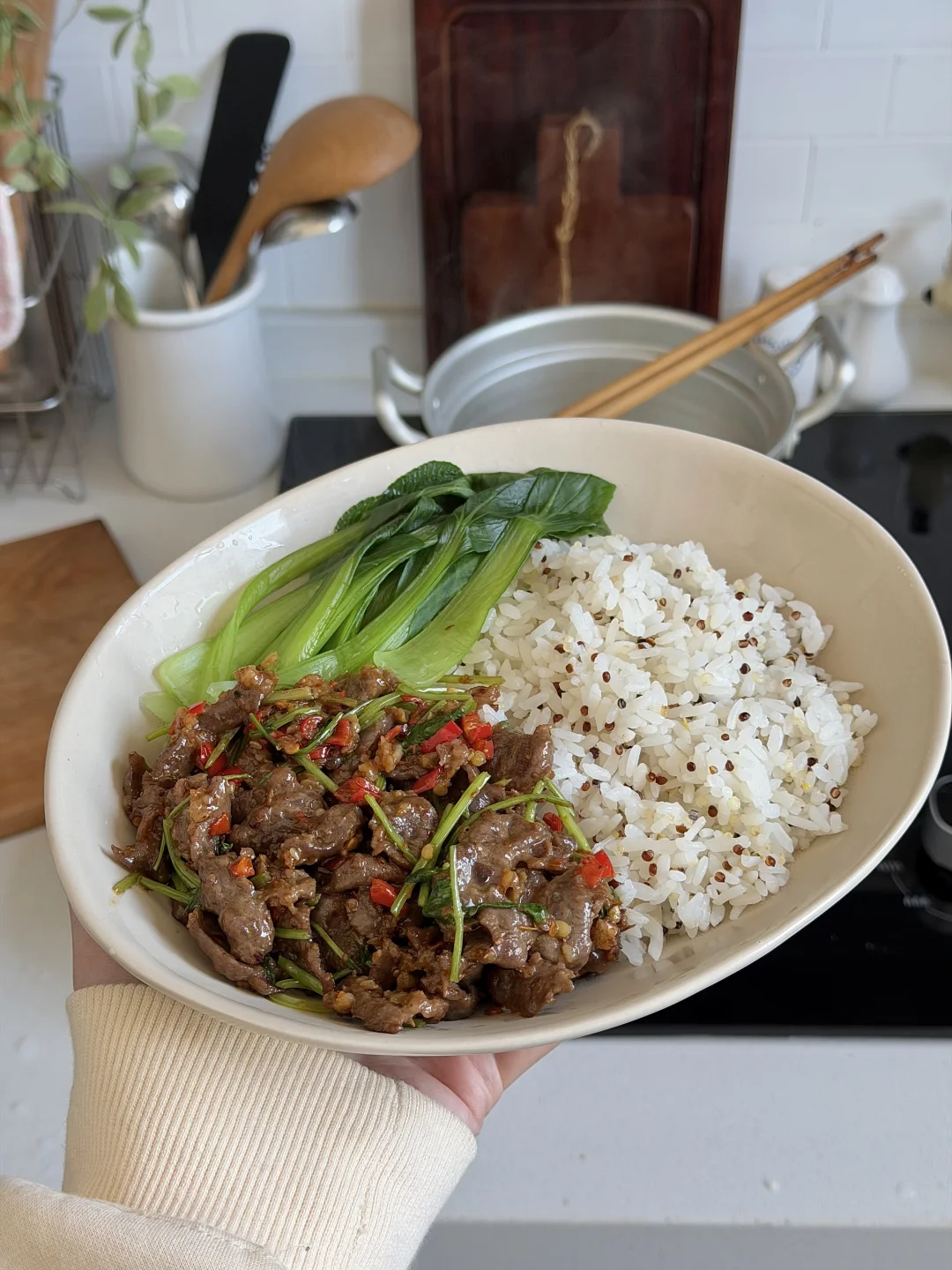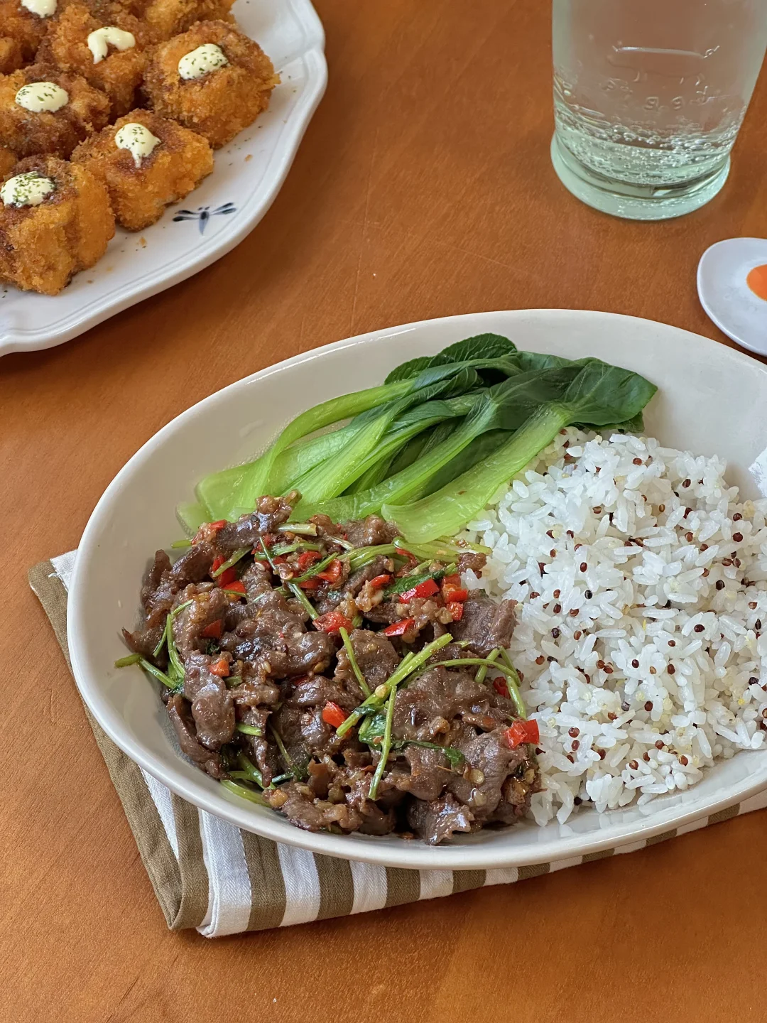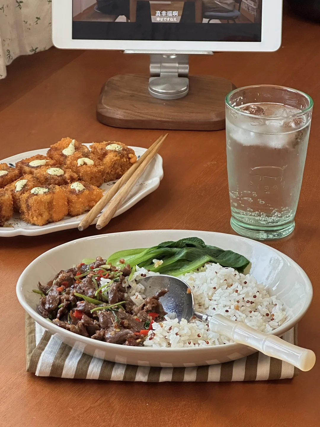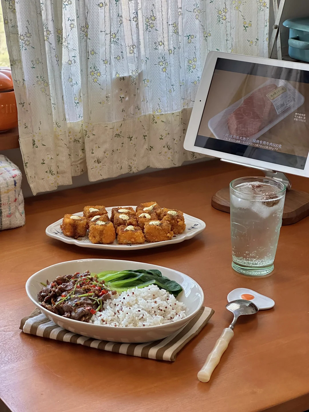 . 🍴今日菜单: 香辣牛肉盖饭 和风炸豆腐 话梅汽水 . 胃口很好的一天嘿嘿! 做了很下饭的辣炒牛肉 配上藜麦饭和水煮青菜 满足又不会太油腻~ 🥩 和风炸豆腐是看学的嗷 我腌制了挺久 很入味 外脆里嫩 配上酱汁实在美味~ 🍡 热衷于用各种饮品泡话梅 酸酸甜甜超爱喝! .