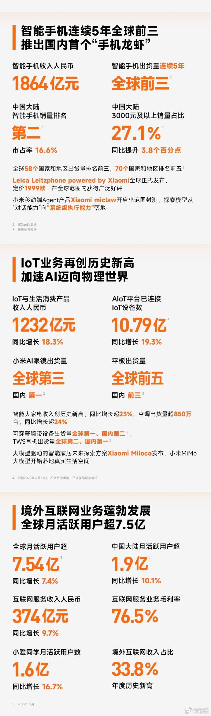 - 手机:智能手机收入为人民币1864亿元,位居中国大陆智能手机销量排名第二,市占率 16.6%。 小米2025年财报 小米汽车业务收入首超千亿