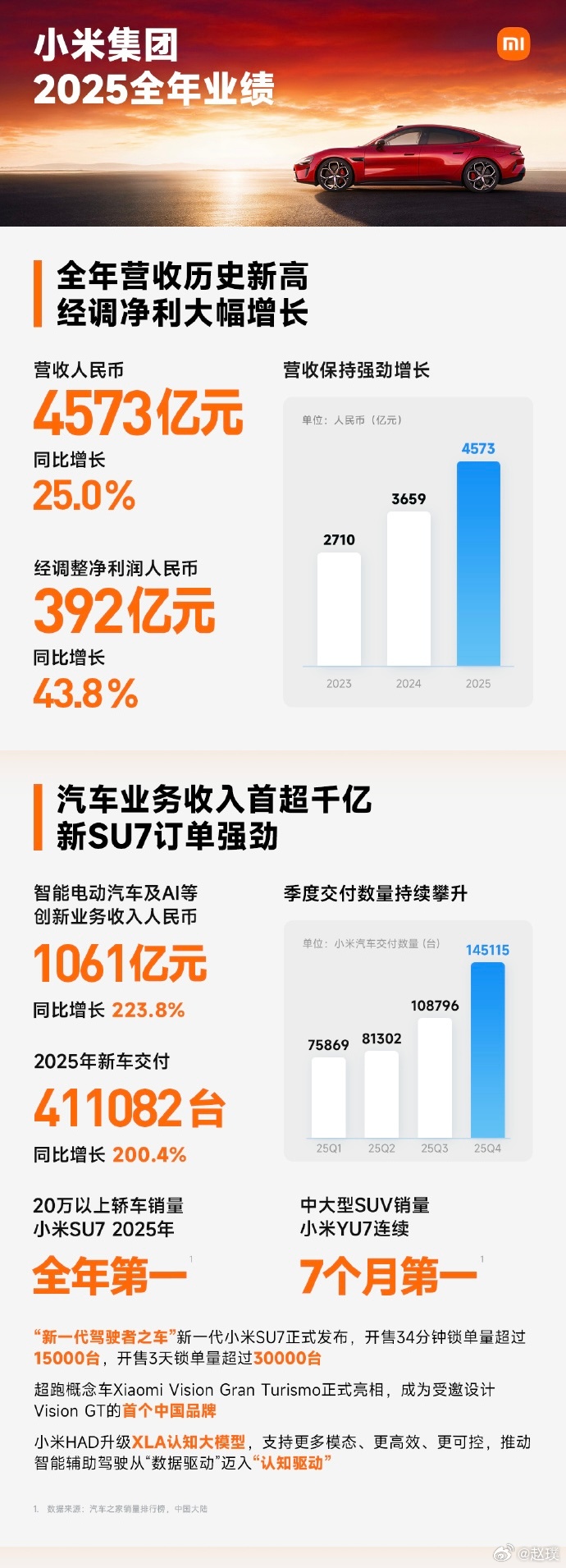 小米发布2025年财报,总营收4573亿元,同比增长25%,经调整净利润392亿元,同比增长43.8%。