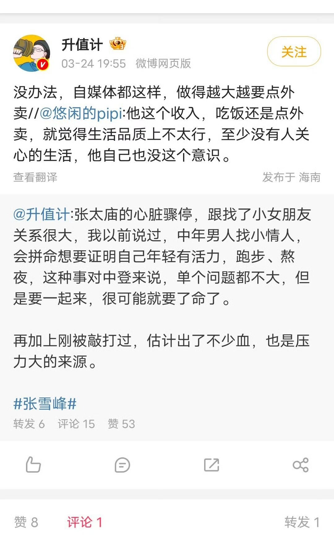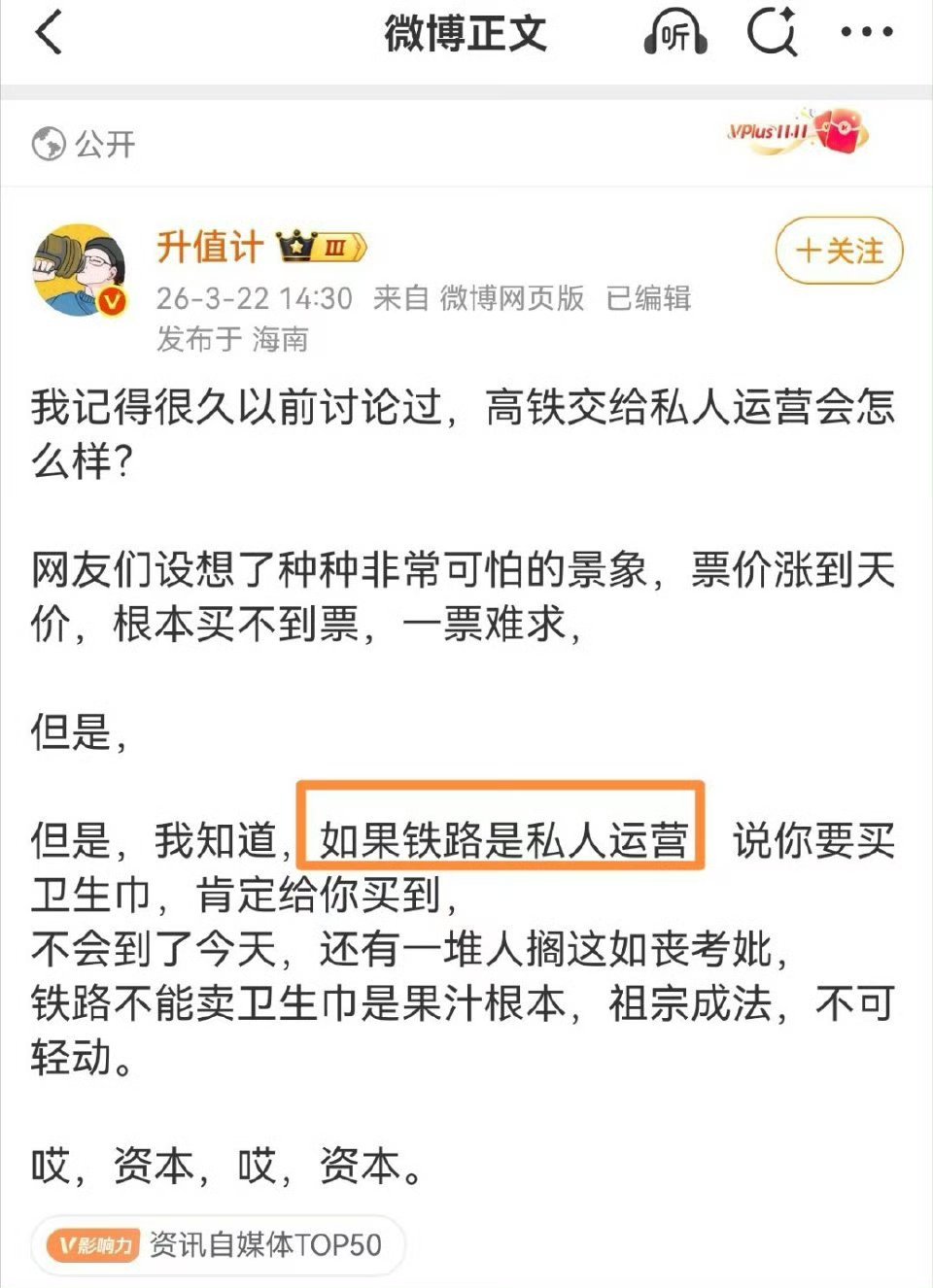 这位“升值计”,这几天不是一般跳,前脚要高铁私有化,后脚张雪峰去世就各种恶毒嘴脸。这还好意思说关心大众。