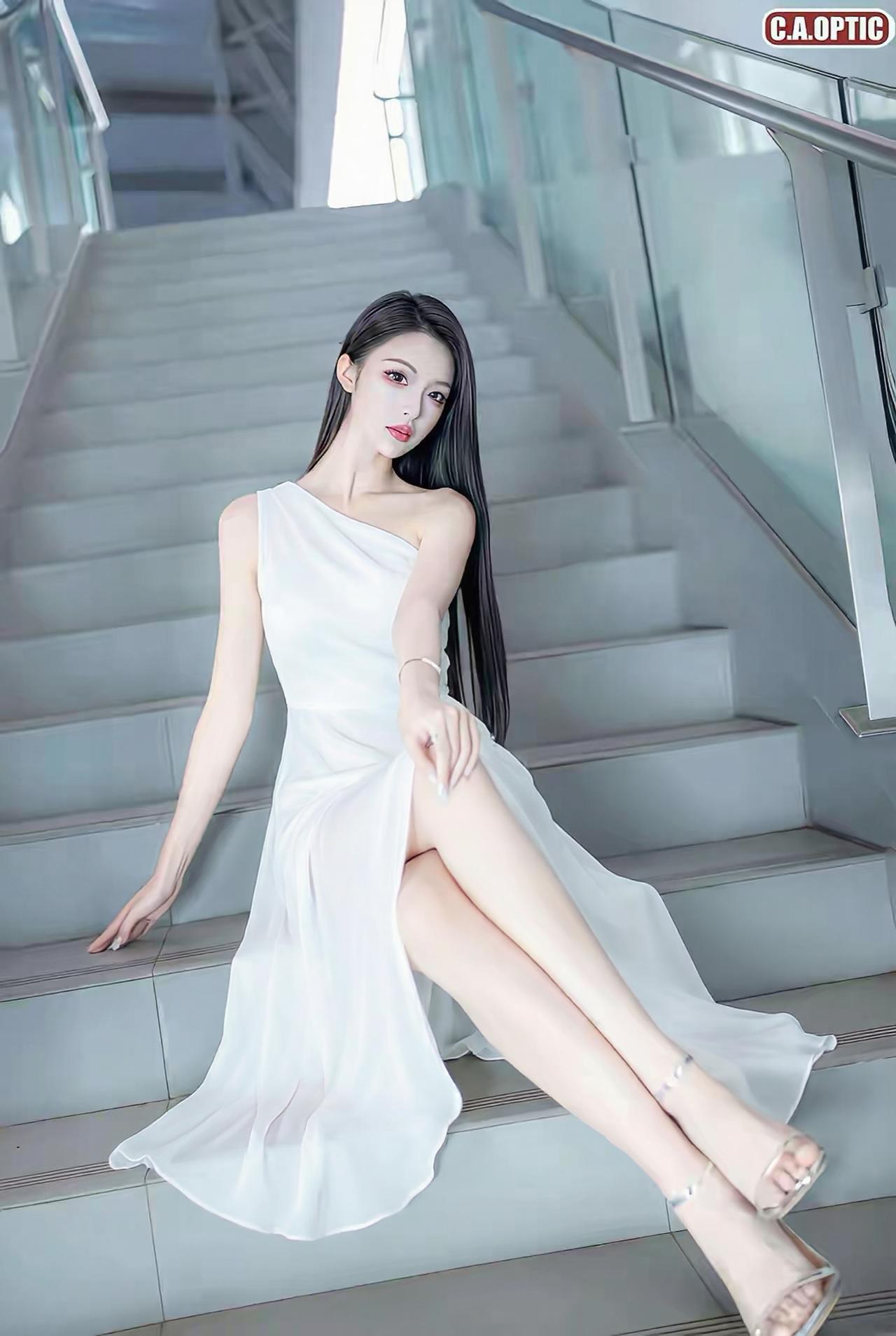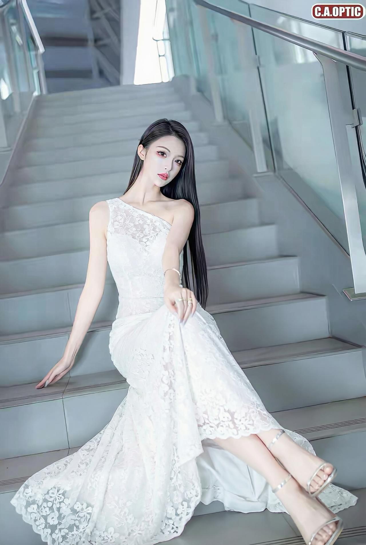 她拥有一头乌黑如瀑的长直发,垂顺地披在身后,衬得肌肤胜雪。五官精致冷艳,眉眼间带着一丝疏离的魅惑,红唇点缀,气场全开。 她身着多款不同设计的白色长裙,每一款都勾勒出曼妙身姿: 斜肩蕾丝长裙:单边镂空设计,蕾丝花纹繁复精美,鱼尾裙摆摇曳生姿,尽显高贵典雅。 抹胸蕾丝短裙:简约抹胸款,凸显优美锁骨,灵动俏皮。 一字肩蕾丝裙:露肩设计,温婉中带着小性感,勾勒出迷人肩颈线条。 斜肩雪纺开叉裙:轻盈雪纺面料,高开叉设计,大秀美腿,仙气飘飘。 吊带蕾丝开叉裙:细吊带搭配精致蕾丝,性感撩人,风情万种。 她姿态慵懒地斜倚在台阶上,长腿交叠,眼神魅惑,冷白的色调与通透的玻璃背景相呼应,营造出一种清冷又高级的氛围,将女性的柔美与冷艳完美融合。