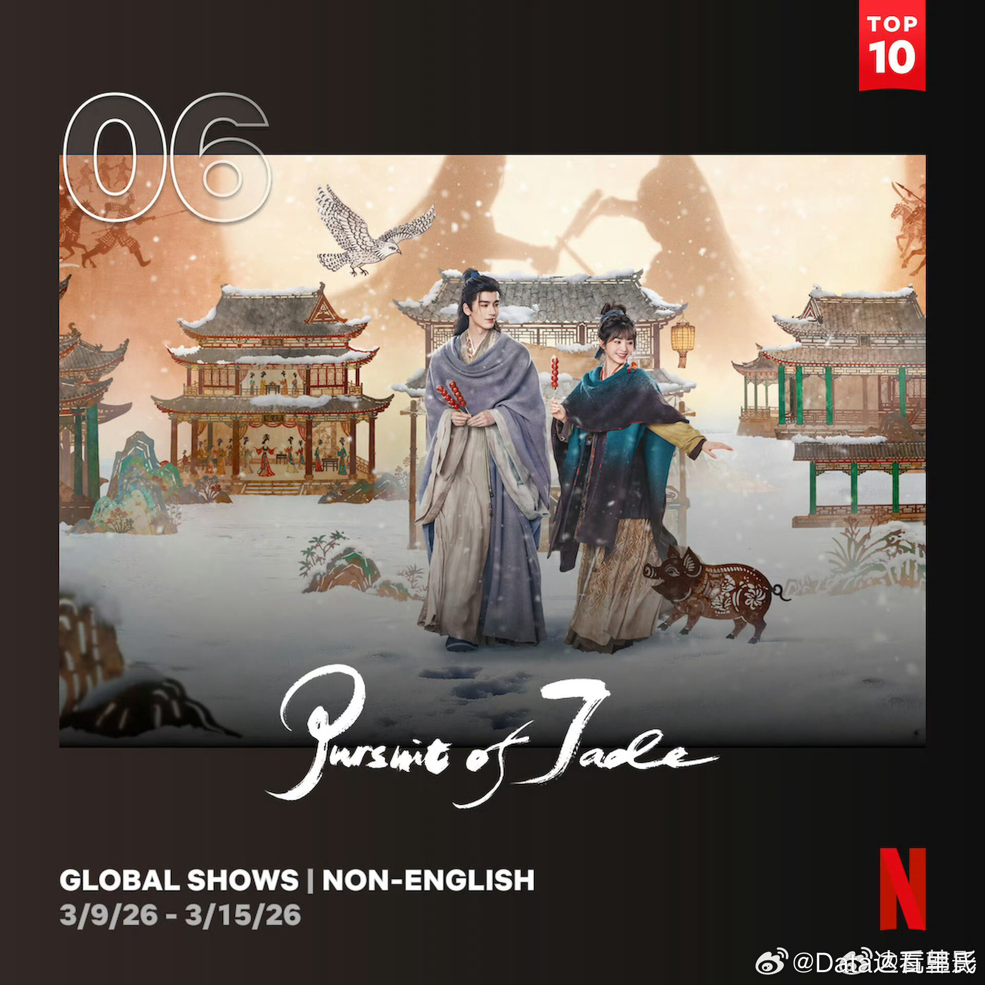 张凌赫、田曦薇逐玉创网飞国产剧新纪录国产古偶出海,连续两周登上网飞官方周榜,2026年第6周和第8周,两周累积370万观看次数,对比Netflix2025年华语剧集观看总排行的数据,已经超过《偷偷藏不住》的330万次观看,仅次于《难哄》的610万,位居第二。而且现在还没完结。
