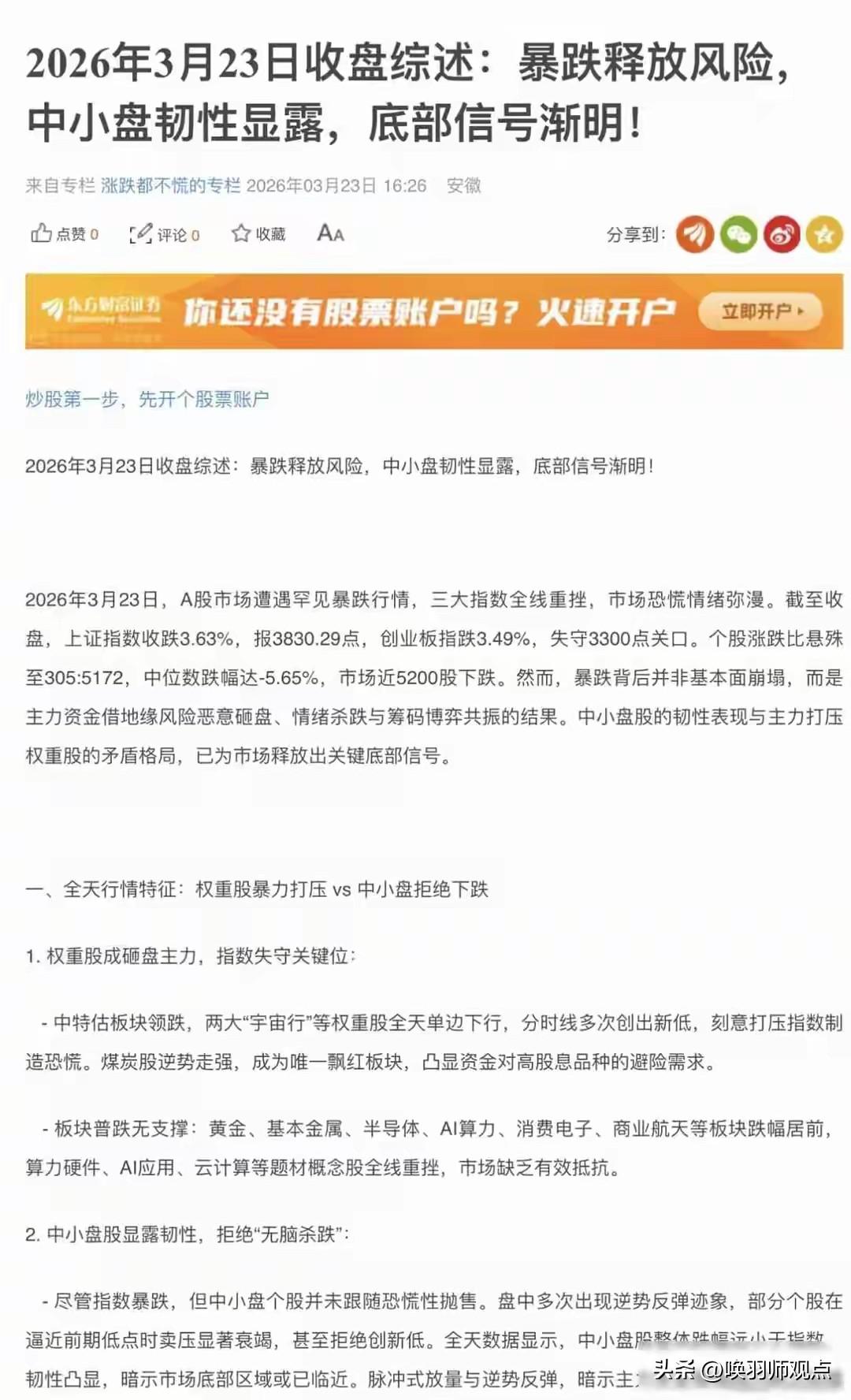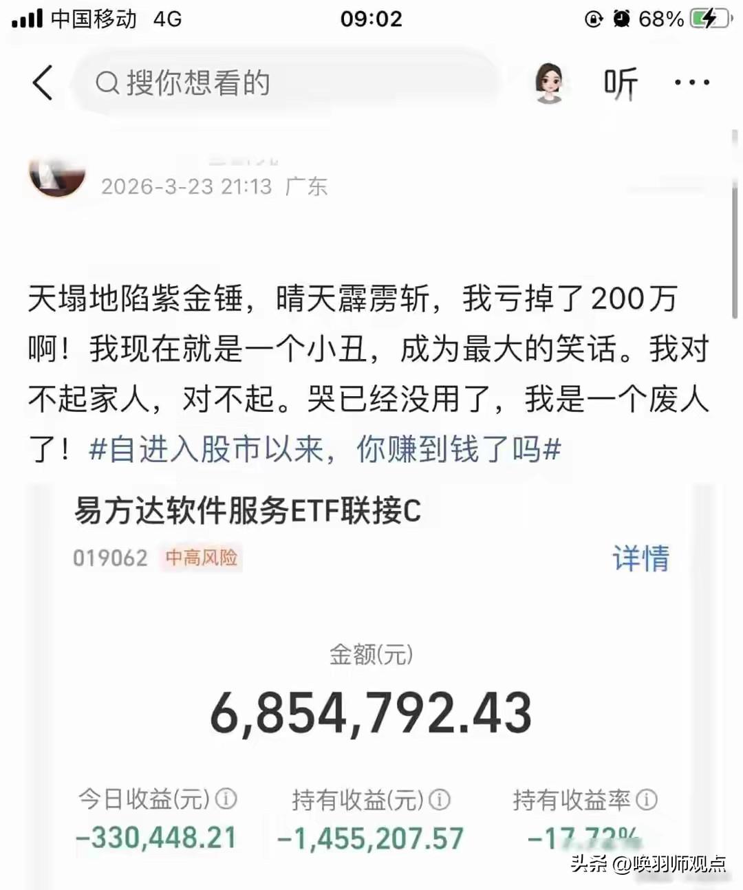 一夜亏33万,广东投资客痛哭:亏了200万,觉得自己是个废人 3月23日,广东一位网友发帖称自己亏损200万,单日跌33万,账户还剩685万。当天A股暴跌,沪指跌3.63%,5000多只股票下跌。帖子引发热议,有人安慰,有人嘲讽。 专家指出,此案暴露了个人投资者的三大风险:仓位失控、杠杆隐患、心态崩塌。更值得反思的是,为什么普通人能轻松买到这么高风险的产品?银行理财打破刚兑五年了,课本里还没教怎么面对亏损。 历史证明,每一次暴跌都在重复同样的故事。敬畏市场、闲钱投资、不加杠杆,是每个投资者必须记住的底线。 --- 互动话题: 你经历过股市大跌吗?如何看待“闲钱投资”和“押上全部家当”的区别?欢迎在评论区分享你的看法!负债千万打工人 投资崩盘 投资8亿打水漂 错失千万资产 投资感悟录