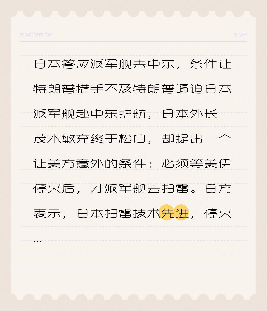 日本答应派军舰去中东,条件让特朗普措手不及 特朗普逼迫日本派军舰赴中东护航,日本外长茂木敏充终于松口,却提出一个让美方意外的条件:必须等美伊停火后,才派军舰去扫雷。 日方表示,日本扫雷技术先进,停火后若波斯湾水雷影响通航,可出手相助,但绝不参与战时护航。这一表态精准避开了特朗普的核心要求,既给足面子,又守住底线。 此前高市早苗访美,不仅没能拒绝出兵,还带着巨额投资“进贡”,被白宫发布“谄媚时刻”照片,颜面尽失。作为美国的“工具人”,日本不敢直接拒绝,只能委婉周旋。 高市政府一边在国内鼓吹修宪、扩军,推行军国主义;一边在白宫以宪法为由推脱出兵,言行不一。这种“脆弱性”,或将让美国重新评估对日本的支持力度。 外长的话术虽暂时缓和了美日矛盾,但日本的军国主义野心与对美依附的矛盾,早已埋下隐患。