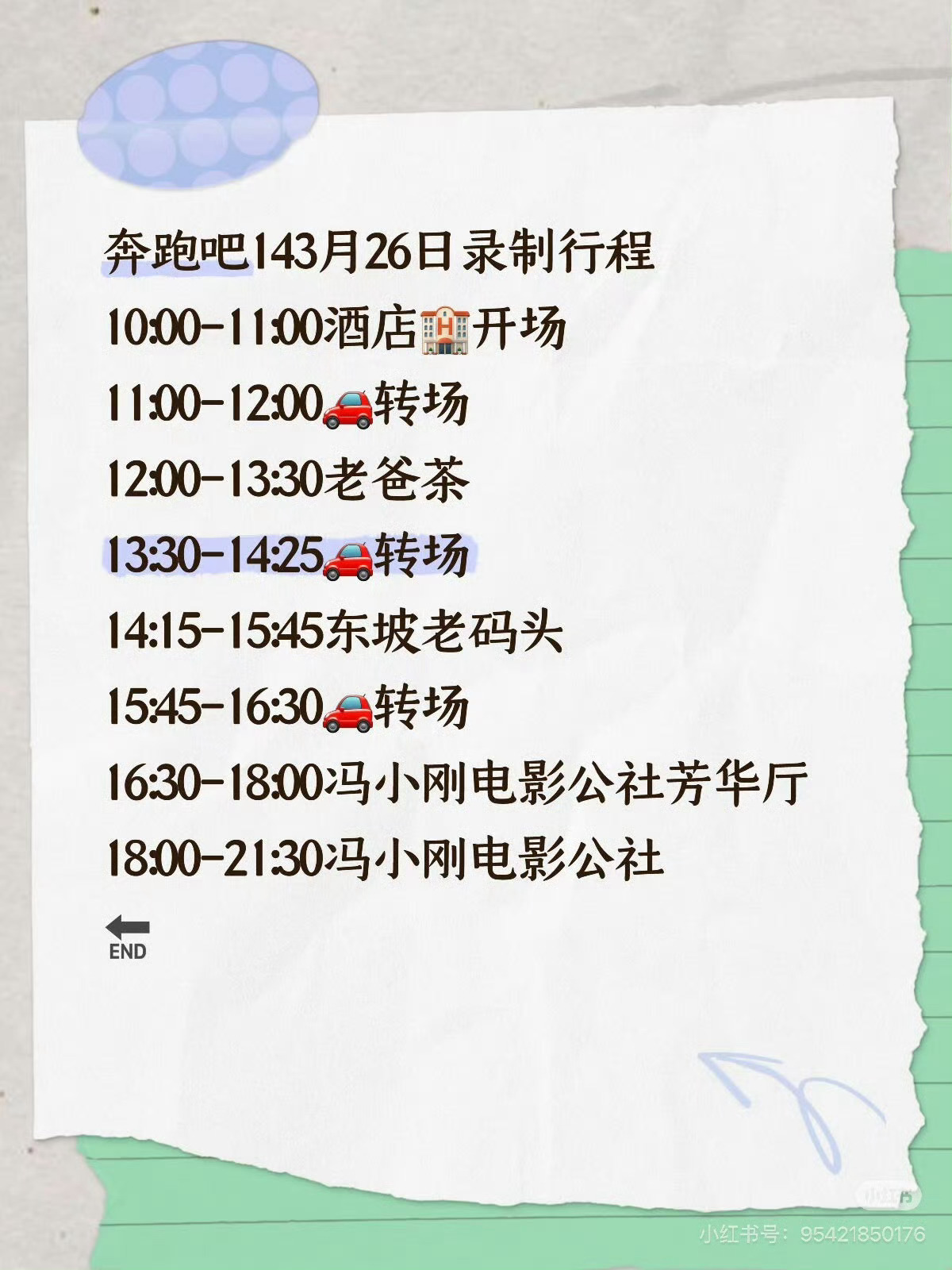 奔跑吧今日份录制行程🈶!10点开始开场,一直转场到晚上9点半,有去老爸茶和老码头的,我最期待的是冯小刚电影公社,不知道会让他们做什么,大家一起飙演技吗?奔跑吧今天录制行程奔跑吧录制行程表奔跑吧
