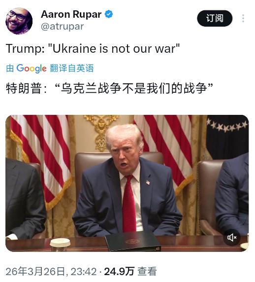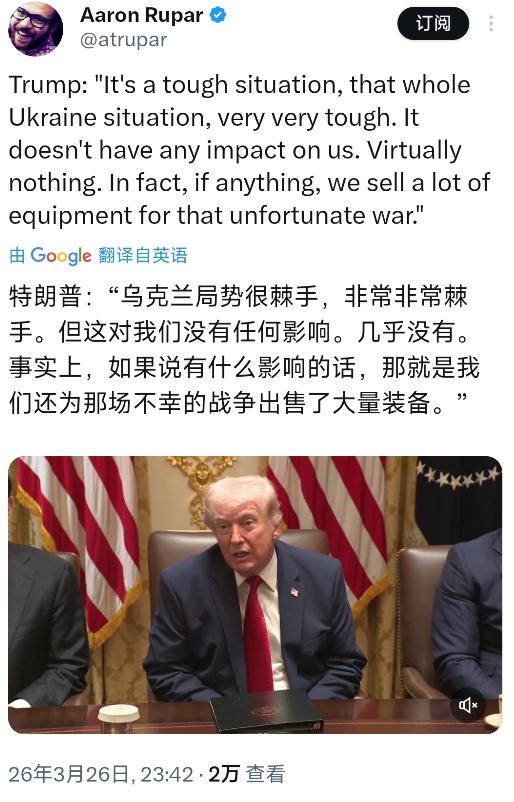 特朗普昨晚(北京时间3月26日晚)表示:“乌克兰战争不是我们的战争……乌克兰局势很棘手,非常非常棘手。但这对我们没有任何影响。几乎没有。事实上,如果说有什么影响的话,那就是我们还为那场不幸的战争出售了大量装备。” 特朗普同时承认乌克兰当前的局势陷入了棘手的境地,这种棘手的状态已经达到了非常严重的程度。特朗普强调这场冲突对美国本土没有产生任何实质性影响,这种影响的程度几乎可以忽略不计。 特朗普随后补充了自己的核心观点,他指出如果非要找出这场冲突对美国的正向关联,唯一的具体表现就是美国向乌克兰提供的各类装备实现了大规模的销售,美国从这场冲突中获得了实实在在的装备出口收益。 特朗普的这番表述直接呼应了他长期以来秉持的美国优先外交理念。特朗普在任期间以及后续的公开发言中,始终将美国本土利益放在国际事务处理的核心位置。 特朗普对海外军事介入的态度始终保持着功利性的判断标准,他不会为了其他国家的冲突牺牲美国的核心利益。特朗普在俄乌冲突中的立场转变,本质上是这种理念的延续,他不会将美国的资源投入到他认为与美国无关的争端中。 美国在俄乌冲突中的角色定位在特朗普的言论中被简化为装备供应方。特朗普政府调整了美国对乌克兰的援助模式,美国不再以无偿援助的形式向乌克兰输送武器,而是转向以商业销售的模式完成装备交付。 这种模式的转变让美国军工企业成为俄乌冲突中的直接受益者。美国军工企业凭借向乌克兰出售防空系统、坦克、弹药等各类装备,实现了营收规模的快速增长。美国军工企业的订单量在冲突期间持续攀升,企业的市场份额和利润空间都得到了显著提升。 特朗普的言论刻意淡化了俄乌冲突对美国的多重实际影响。美国政府为了维持对乌克兰的军事支持,投入了大量的财政资金。美国联邦政府的国防预算中,有相当一部分被用于对乌军援相关的支出。 这笔支出会间接影响美国国内的民生领域投入,美国民众会感受到公共服务、基础设施建设等领域的资源分配压力。美国的盟友体系也因俄乌冲突受到冲击,北约内部的成员国在对乌援助的责任划分上出现了分歧,盟友之间的协作效率有所下降。 美国的地缘战略布局也因俄乌冲突发生了调整。美国原本计划投入到亚太地区的战略资源,有一部分被分流到欧洲方向,用于应对俄乌冲突带来的安全挑战。 这种资源的重新分配,会影响美国在亚太地区的战略推进节奏。美国的能源市场也受到俄乌冲突的间接影响,国际能源价格的波动会传导至美国国内,影响美国民众的生活成本和企业的生产经营成本。 特朗普在言论中只强调军售带来的收益,却刻意回避了这些实际存在的影响。特朗普的这种表述方式,是为了迎合美国国内部分民众对海外战争的厌倦情绪。 美国民众在经历了多年的海外军事行动后,对投入资源到无关冲突的行为产生了抵触心理。特朗普抓住这种社会情绪,通过简化冲突影响、突出自身利益的方式,争取国内选民的支持。 特朗普的言论也反映了美国国内在俄乌问题上的政治分歧。拜登政府延续了此前对乌克兰的大规模援助政策,与特朗普的简化立场形成了鲜明对比。 美国两党在对乌政策上的分歧,会影响美国外交政策的稳定性。这种分歧也会让美国在国际舞台上的立场变得模糊,影响美国在全球事务中的话语权。 乌克兰局势的持续恶化,也让美国的外交信誉受到一定影响。美国频繁调整对乌政策,从大规模援助到转向商业销售,这种政策的变动会让其他国家对美国的承诺产生质疑。美国在国际社会中的盟友信任度,会因这种政策摇摆而受到削弱。 俄乌冲突的持续发展,也让美国面临着新的战略挑战。俄罗斯在冲突中的战略调整,会影响欧洲的安全格局,进而影响美国在欧洲的战略部署。欧洲国家的安全依赖度提升,会让美国在欧洲的影响力得到巩固,但同时也会让美国承担更多的责任和成本。这种战略平衡的变化,会让美国在处理国际事务时面临更多的权衡和选择。
