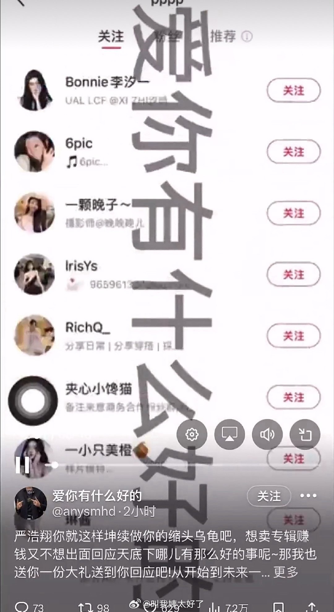 严浩翔中午上线发了专辑预告未对热搜上的事件进行回应,然后ss爆料了严浩翔的小号,把他偷偷关注的女网红列表发了出来…不是,这怎么证明是严浩翔小号的啊?