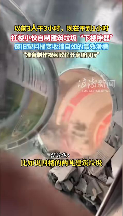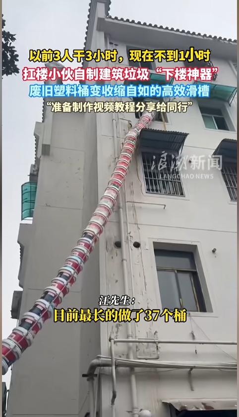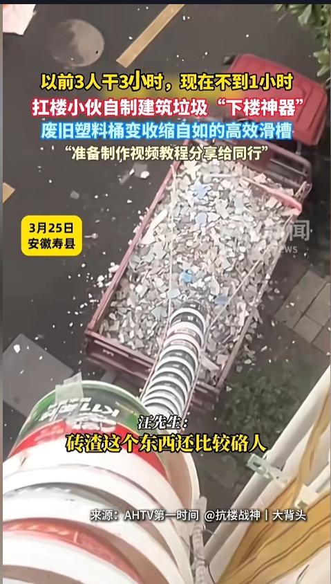 “高手在民间!”近日,安徽寿县,一位“扛楼小伙”在搬运建筑垃圾时用上了自制的“下楼神器”——一根用废旧塑料桶做的伸缩滑道。小伙说,直接用麻袋扛太伤人了,用上这个省时省力,正准备出教程给同行呢!网友:劳动人民的智慧是无穷的! 据媒体3月25日报道,汪先生是一位“扛楼小伙”,每天的工作就是从楼上把人家装修制造的建筑垃圾给扛走清理掉。泡沫沙子之类的还好,砖头石块这种就让人很难受了。直接用麻袋扛,不仅累,还硌人,肩膀脖颈都不堪重负。 为了解决这个问题,汪先生自己研制了一款神器。他找来废旧的塑料桶,把底用剪刀剪掉,然后挨个套在一起。两个桶之间用铁丝连接,还做成了滑动式的,伸缩自如。 用的时候,他就把神器压缩好扛到楼上,然后从上面展开,一端放在楼上,另一端接到自己的车斗上。然后将破碎的建筑垃圾,从顶端的口倒进去,在重力的作用下就滑到车斗里了。由于两个桶之间都有重叠部分,也不用担心在滑动的途中掉落出去,伤到别人。 汪先生说,自己目前做的最长的一个,展开有11米,能够到4楼,折叠后仅有2.8米,非常的实用。现在,他正准备出个教程,把自己的这项发明分享给同行呢! 网友看后表示,这个发明确实实用,可以在此基础上再优化一些,比如在尾部加装一个布袋,减少些落地时的扬尘,两个桶之间的连接处,也改用钢丝,这样能避免使用过程中铁丝疲劳崩断,减少些隐患! 信息来源:《以前3人干3小时,现在不到1小时。扛楼小伙自制建筑垃圾“下楼神器”,废旧塑料桶变收缩自如的高效滑槽》浪潮新闻