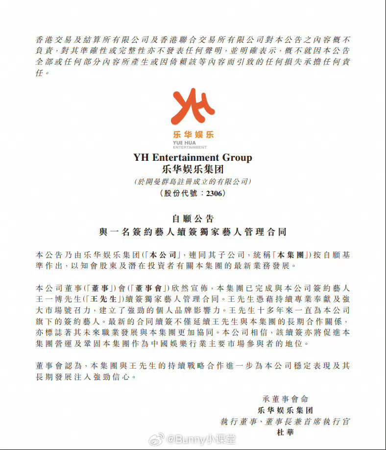 王一博乐华续约!乐华娱乐官网更新公告,宣布与王一博已完成续签独家艺人管理合同。粉