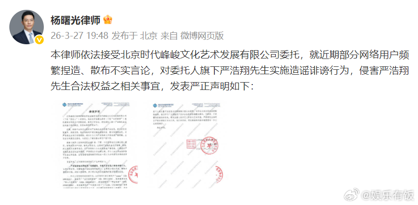 严浩翔方律师声明 针对近期传闻,严浩翔方律师发布律师声明回应,谴责相关网络用户恶意捏造、传播不实信息的造谣诽谤行为。