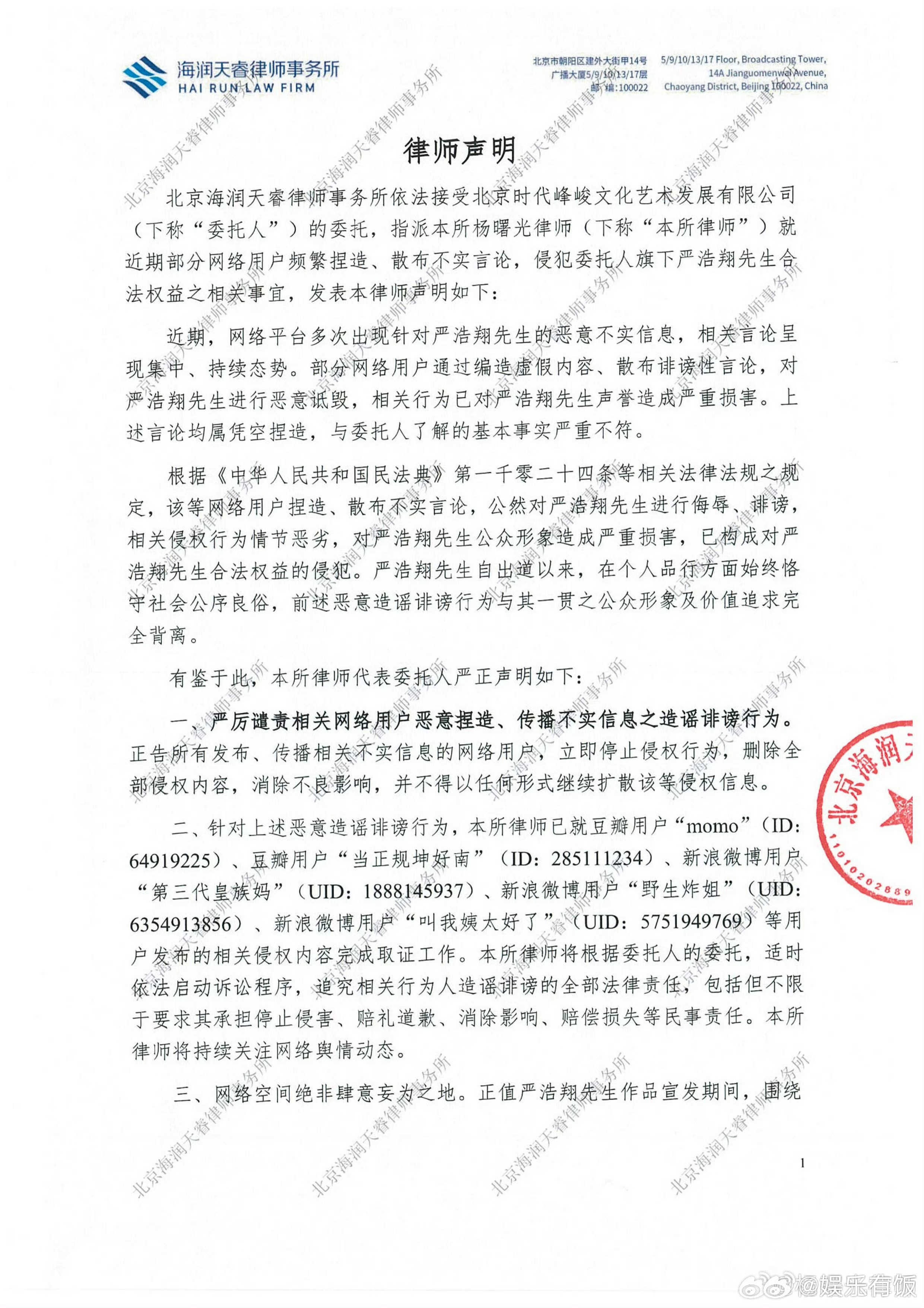 严浩翔方发布律师声明严浩翔方维权声明 3月27日,受北京时代峰峻文化艺术发展有限公司委托,发布律师声明。声明称近期部分网络用户针对旗下艺人捏造、散布不实信息,已构成造谣诽谤,对其合法权益造成侵害。目前,律所已对豆瓣及微博平台的多个相关侵权账号完成取证,将依法启动诉讼程序,追究相关行为人的民事责任,包括停止侵害、赔礼道歉、赔偿损失等。同时,声明呼吁公众保持理性,不信谣不传谣,共同维护健康网络环境。严浩翔