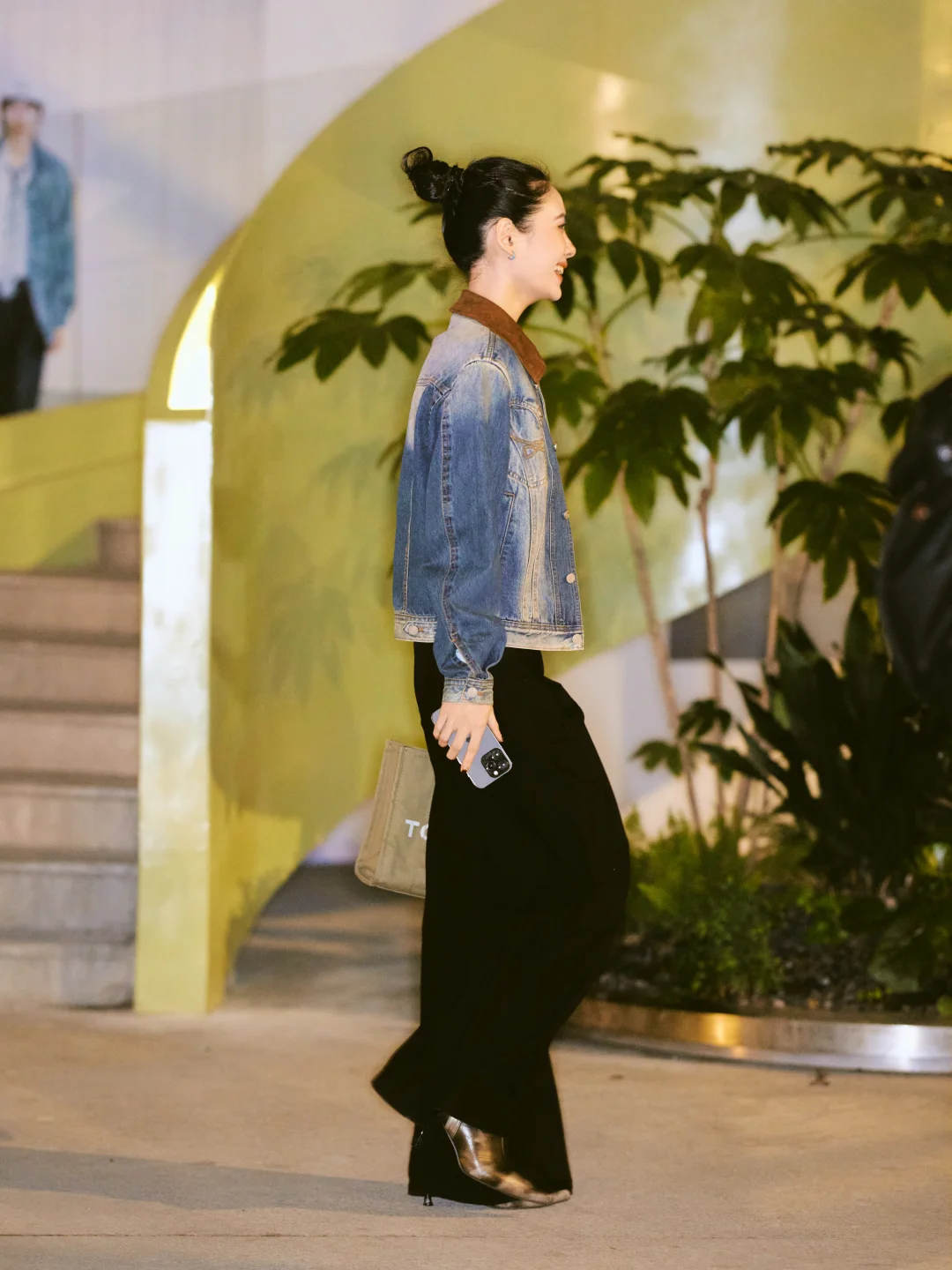 曾黎这状态真的绝了✨机场街拍一身黑皮衬衫+工装牛仔裤,又酷又飒,红色流苏耳坠一