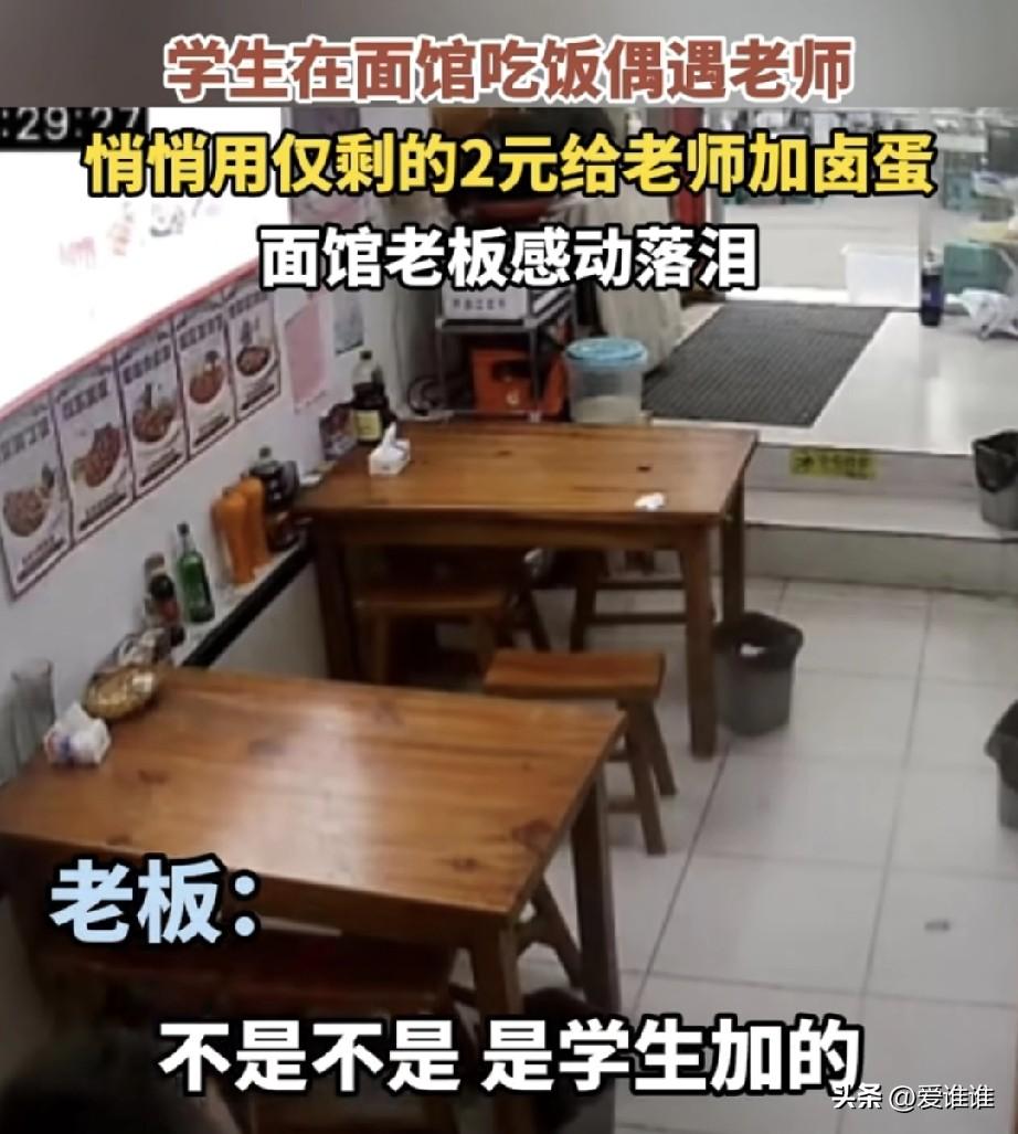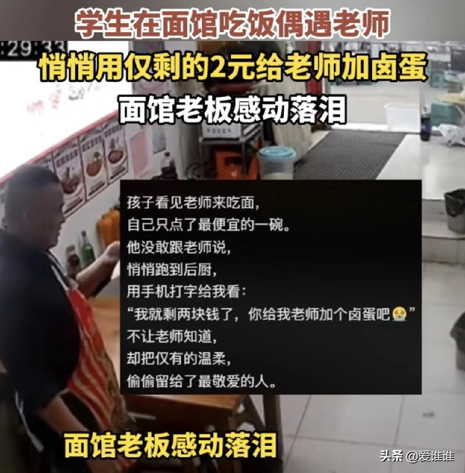 “一颗卤蛋的重量!”学生面馆吃饭偶遇老师,学生用身上仅剩的两块钱给老师偷偷的加了颗卤蛋,并特意叮嘱老板别让老师知道,学生走后老板如实相告老师,老师说有点想流泪的感觉,老板点头到:“我也是眼泪快流出来了!” 2026年3月26日,安徽临泉,一个学生走进面馆,兜里总共只有十几块钱,他看了看价目表,点了店里最便宜的一碗面,安安静静坐在角落里吃着,这时候,他的老师也推门进来吃饭,学生认出了老师,连忙起身打招呼,随后老师坐到了另一张桌子。 学生的面先端上来了,就是一碗清汤素面,他看了看老师那边,悄悄起身走到柜台前,把兜里剩下的最后两块钱掏出来,递给老板,小声说:“给我老师加颗卤蛋,别让他知道,”老板愣了一下,接过钱,从锅里捞出一颗卤蛋放进老师碗里。 学生吃完面后,起身后对老师打了个招呼就走了 老师吃面时发现碗里有颗蛋,问老板,今天的面里怎么加的有卤蛋,老板如实相告是刚才你的那位学生给你加的,老板又说:“我看他身上也就剩几块钱了,还舍得给自己的老师加个鸡蛋,看来你很受学生尊重!” 老板又说:“看到这个学生的举动,我刚才差点流泪,在这物质的时代这个行为太感动人了!” 老师红着眼眶一时说不出话来! 很多人被这颗两块钱的卤蛋打动,这孩子自己吃着最便宜的面,却把仅剩的钱拿来给老师加蛋。 网友纷纷留言,说这就是最好的教育,也是人心里最朴实的感恩,面馆老板后来说,他哭了不是因为那颗蛋值多少钱,而是那孩子掏钱时的样子,让他看到了人心最柔软的地方!