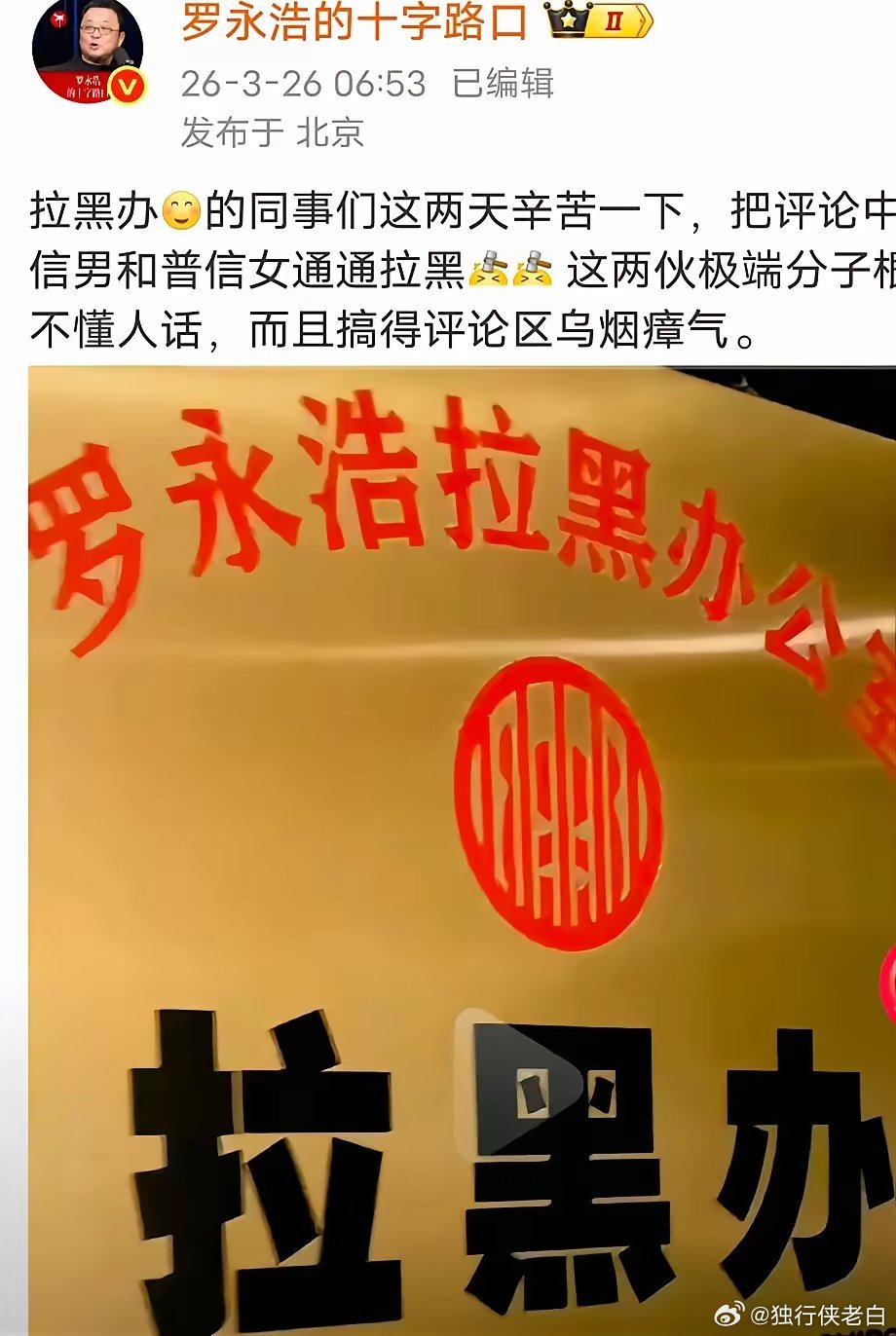 现在的网友确实是太有才了,给罗永浩和杨笠取名罗笠岛。因为遭到网友的抵制,罗永浩开始拉黑了,还配图拉黑办,并表示谁在乎。于是网友讽刺:钱赚够了,网友不重要了,欠钱的时候交个朋友,赚够了,成立了拉黑办。这过河拆桥的速度