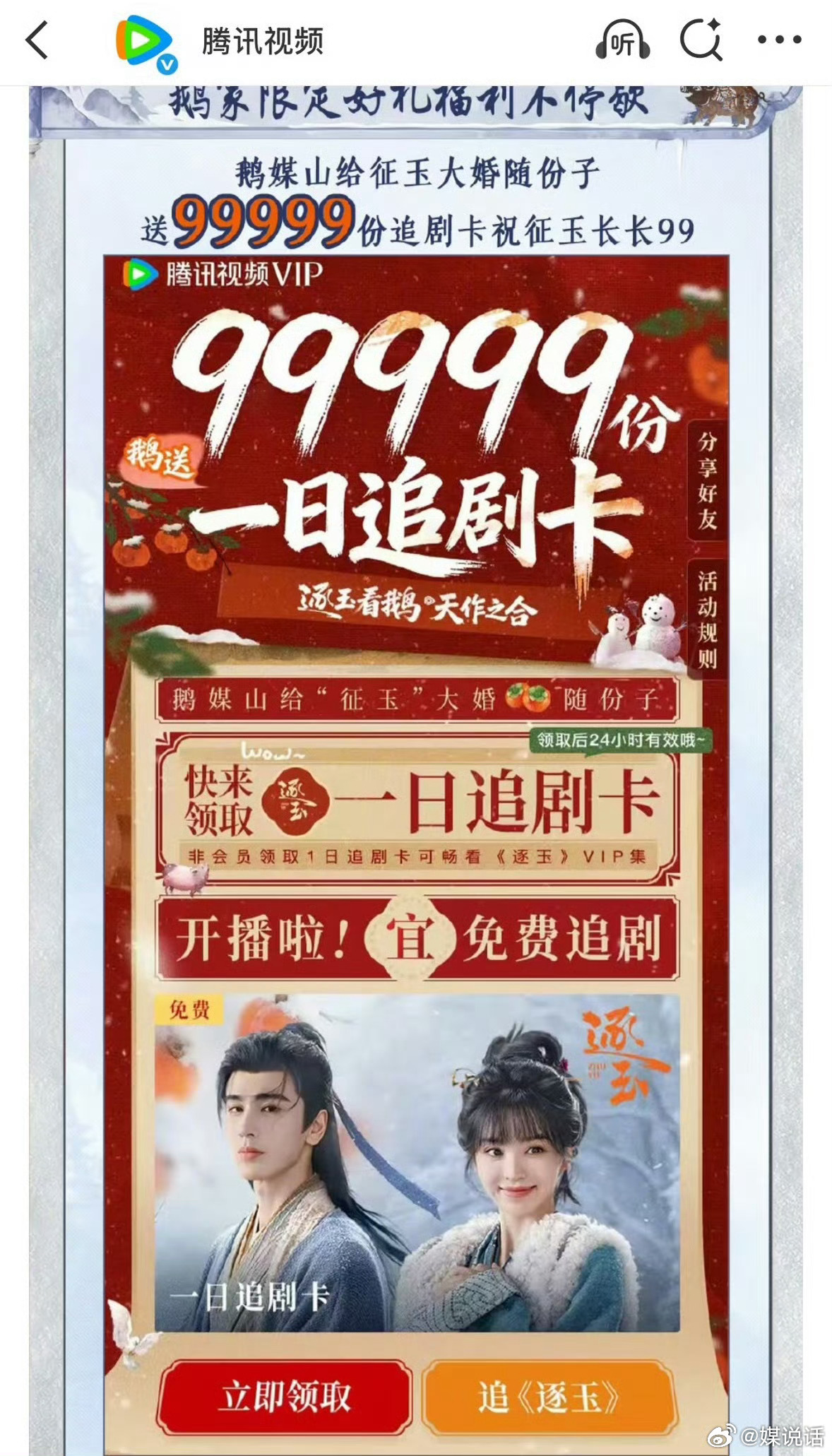腾讯给白日提灯99999份一日追剧卡 迪丽热巴 陈飞宇《白日提灯》今天开播,🐧也给了99999追剧卡,和张凌赫 田曦薇《逐玉》待遇一样,是要再造一个爆款吗?