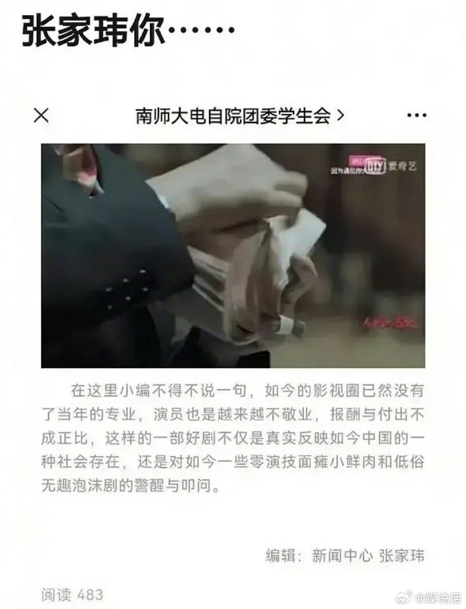 张凌赫多年前发文抨击影视圈 粉底液将军 高跟鞋女战士 这算回旋镖吗?当年张凌赫看