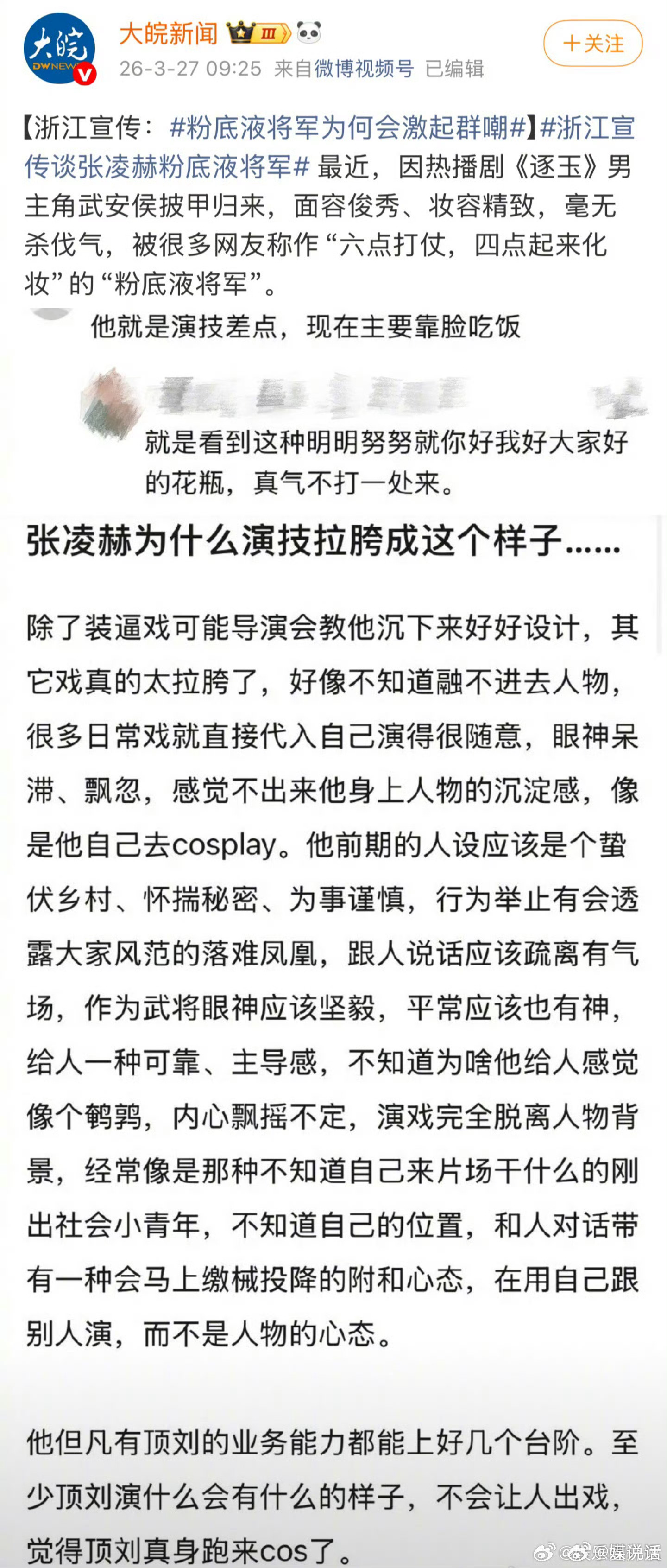 张凌赫多年前发文抨击影视圈 粉底液将军 高跟鞋女战士 这算回旋镖吗?当年张凌赫看不上的影视圈,如今自己演了《逐玉》却被官媒评价为“粉底液将军”……