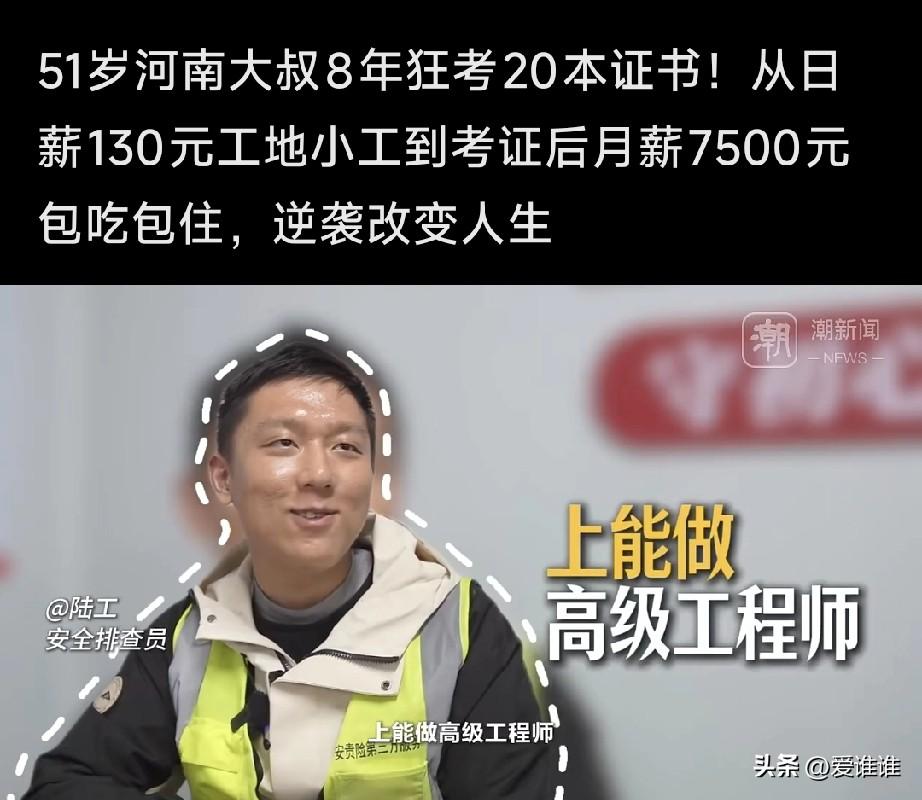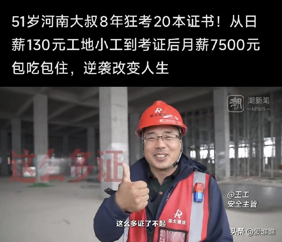 “逆袭!”51岁河南大哥8年考了20本技能等级证书,从刚开始的每天只能挣130块钱的小时工,干到现在每月7500的技术骨干,大哥说:“这些证书就是我的腰杆子!” 2017年春天,四十三岁的河南人苏小锋扛着编织袋到了杭州,他没读过什么书,初中毕业就在工地卖力气,一天一百三十块,住工棚,自己做饭,最怕下雨停工,一停工就没了收入。 在工地上,他看见有技术的工友活轻省、挣钱多,他心里头起了念头:光靠力气,翻不了身,那晚他躺在铁架床上想了一宿,决定去学门手艺。 他先考了建筑电工证,白天干活,晚上趴在床铺上就着节能灯看书,字认不全就一个字一个字查,他把知识点抄在小纸片上,搬钢筋、拌水泥的空档掏出来瞄两眼,熬了大半年,证拿到了,月薪一下子涨到七千五,还包吃包住,他头一回觉得,脑力比体力值钱。 从那以后,他像蚂蚁搬家,一本一本地考,八年下来,攒了整整二十本证,包括安全工程师、监理工程师、一级建造师这些硬骨头。学历也跟着往上长,从初中读到中专、大专,马上本科也要毕业了。 到了二零二六年春天,五十一岁的苏小锋已经是工地的安全排查员,每天跑两三个项目做巡检,他手里真正用得上的证只有两个,却多考了十几个,有人说他傻,他说:“多一个证书,就多一条退路。” 主管夸他业务能力强,连二十出头的助手都把他当榜样,他的故事传到网上,有人说他是“狠人”,也有人问AI这么厉害,考证还有用吗,可懂行的人都明白,他靠的不是那一摞本子,而是八年里一天天攒下的学习劲,那才是工地上摸爬滚打磨出来的真本事。 苏小锋还是那个习惯,口袋里揣着卡片,有空就翻两页,他说六十三岁退休,今年还打算再考两本,从日薪一百三的工地小工,到如今腰杆挺直的技术专家,他用一摞证书铺出了自己的路!