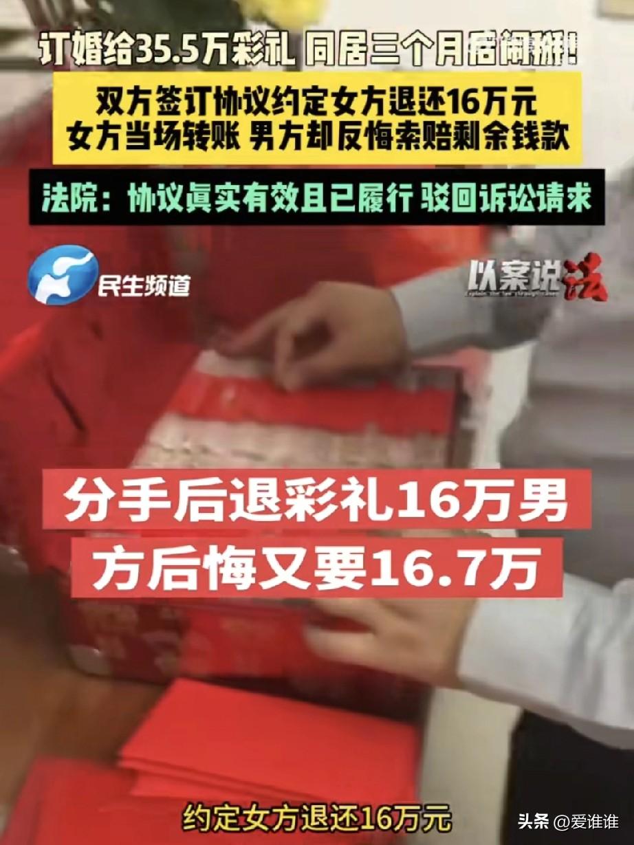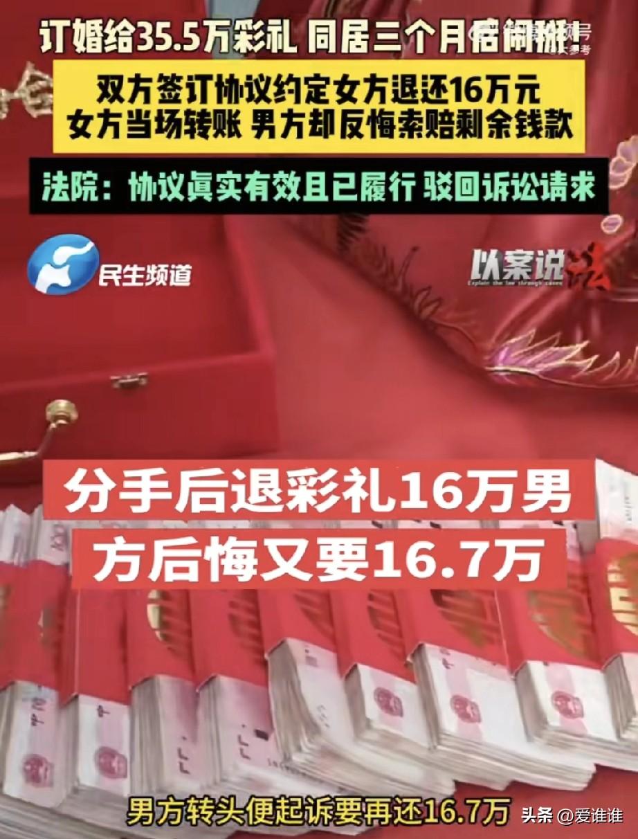 “不能变卦!”男子订婚后支付给女方35.5万元彩礼,随后两人同居,然而同居不到3个月两人就过不到一块去了,分手后女方按照协议退还给男子16万元彩礼,没过几天男子觉得钱退少了,又把女方起诉致法院要求再退还一部分,法院驳回了男子的诉讼请求! 2025年初,福建福清,当地一个年轻小伙陈某,经过媒人牵线搭桥,认识了姑娘林某,两人年纪相仿,见面后感觉也还不错,加上双方家长都催得紧,认识没多久就按照当地风俗匆匆订了婚。 订婚那天,男方家里很是重视,陈某的父亲东拼西凑,凑足了35.5万元作为彩礼,热热闹闹地送到了女方家里,女方家按规矩回了2.8万元礼金,还搭上一条价值一万一千多块钱的金项链,两家人都觉得这桩婚事算是板上钉钉了。 订婚后,陈某和林某就搬到一起,过起了同居生活,但真正朝夕相处了,两个人才发现彼此性格上合不来,生活习惯也差别很大,为了一点鸡毛蒜皮的小事,两人常常拌嘴,吵来吵去,感情不但没升温,反而越来越淡,就这么将就着过了大概两三个月,两人都觉得实在过不下去了,这桩婚事也就这么黄了。 分手归分手,但摆在两家人面前的还有一笔彩礼账要算清楚,毕竟35.5万元不是个小数目,男方家觉得这钱花得冤枉,女方家也觉得自家姑娘跟人住了几个月,名声上也受了影响,两家人的气氛一度闹得很僵,最后还是请了当初牵线的那位媒人出面,把双方家长叫到一起坐下来谈。 那天是在媒人家里,气氛说不上多轻松,但大家都想着尽快把这事了结,男方陈某当时因为在外地,没能赶回来,就委托了自己的母亲林某凤全权处理,女方这边也是林某的母亲出来谈,两位母亲坐在一张桌子前,媒人在旁边帮衬着说和。 谈来谈去,最后双方达成了一致,当场白纸黑字签了一份《协议书》,协议上写得明明白白,女方退还16万元彩礼给男方,这件事就算彻底结清了,以后谁也不能再找后账。 协议签完字,女方当场就把16万块钱转了过去,男方母亲收下钱,这事在当时看来就算翻篇了。 可谁也没想到,事情过去一阵子后,陈某越想越觉得这笔账划不来,他自己在心里盘算,当初给的彩礼是35.5万,但女方回了2.8万礼金,那自己家实际出的钱应该是32.7万才对,现在只拿回来16万,等于还差着16.7万。 他觉得母亲当时签那份协议太草率了,自己做儿子的又没在场,这份协议不能算数,这么一想,陈某心里就不平衡了,一纸诉状把女方林某告到了法院,要求对方再返还16.7万元彩礼。 案子到了法院,法官仔细审理了双方提交的证据,也把事情的来龙去脉摸了个清楚,法庭上,女方这边觉得男方简直是出尔反尔,协议签了,钱也收了,哪有转头就翻脸不认账的道理。 法院审理后认为,虽然当初签协议时陈某本人不在场,但他的母亲作为完全民事行为能力人,又是彩礼支付这个家庭事务的代表,签下的协议对全家都是有法律约束力的。 而且协议签完后,女方当场就履行了退款义务,男方母亲也收下了钱,这就说明双方当时对这个解决方案是认可的,这份《协议书》是双方真实意愿的体现,内容也没违反法律规定,合法有效。 既然女方已经按照协议履行完了,陈某再回过头来要求返还剩下的彩礼,就没有法律依据了。 最终,法院依法驳回了陈某的全部诉讼请求,法官在判决里也提到,做人做事要讲诚信,成年人在协议上签了字,就要为自己的行为负责。 有网友直言不讳地说:“这男的太不地道了,签了协议收了钱又去告,要是人人都这样,那社会还有什么契约精神可言?” 还有网友评论道:“法院判得没毛病,当时签协议的时候干嘛去了?这是把法律当儿戏,还是把法院当成讨价还价的地方了?” 也有网友从彩礼本身的角度感慨:“35万多的彩礼,在一起才住了两三个月就闹掰,说到底还是感情基础太薄了,这哪是结婚,简直像在做买卖。” 更有人提起前不久湖南有位老丈人在婚礼上当场退还18.8万彩礼的事,对比之下感慨道:“彩礼本来就是个心意,两家人在谈婚论嫁的时候多点真诚少点算计,也不至于最后闹到对簿公堂的地步。” 我觉得不管是谈婚论嫁,还是分手了结,一旦双方坐下来达成了协议,那白纸黑字就是承诺,该守的规矩就得守,该认的账就得认!