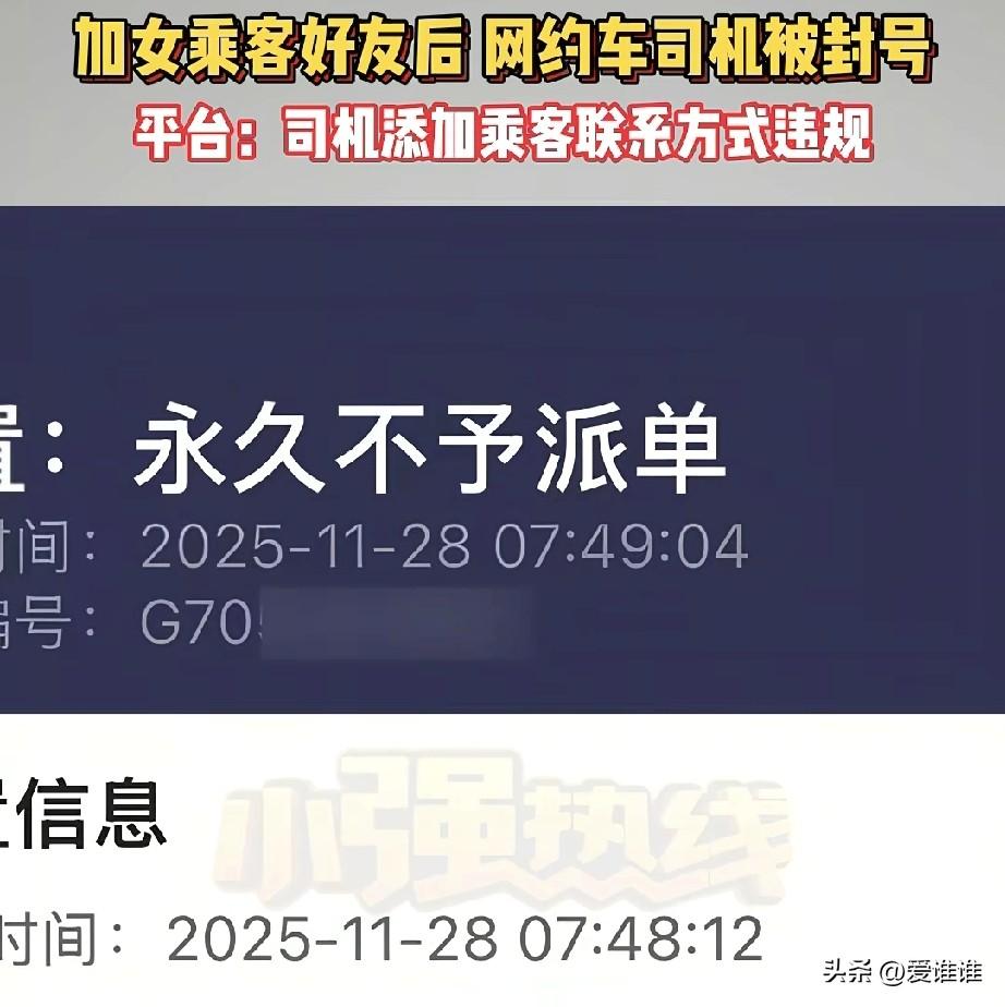 “怨谁那!”网约车司机接单了一位在KTV上班的女乘客,并且私下添加了该女乘客微信,被平台发现后封了他的平台账号,使他无法接单,男子找平台理论:“是女乘客主动要求添加的我,”平台回应:“对私下添加乘客联系方式的行为零容忍!” 杭州的钟师傅是一名网约车司机,从去年九月份开始一直在平台上接单,日子过得还算安稳。 前段时间的一个凌晨,大概十二点左右,他接到一位女乘客,对方性格开朗,在车上聊得很投机,说自己在一家KTV上班,钟师傅随口搭话,说自己也喜欢唱歌,偶尔会去KTV坐坐,一路聊下来,气氛挺轻松。 到了目的地,女乘客主动提出加微信,说以后如果想唱歌可以联系她,钟师傅觉得直接拒绝不太合适,就拿出手机加了对方好友,加完之后他也没多想,继续跑车,到点回家休息。 没想到第二天下午,他像往常一样打开软件准备接单,发现账号被永久封禁了,平台给出的理由是,通过录音核实,他有添加乘客联系方式的行为。 钟师傅一下子懵了,他知道平台不允许司机主动向乘客索要联系方式,但他觉得这次是乘客主动加的,自己只是没拒绝,他赶紧申诉,把经过说了一遍,结果申诉被驳了回来。 账号一封,他等于没了主要收入来源,只好转到其他网约车平台,但单量少了很多,收入大不如前,越想越委屈,他找到媒体,想请记者帮忙问问清楚。 记者先试着联系那位女乘客,结果电话打过去,对方已经把他微信删了,人也联系不上,接着记者又问了平台客服,客服解释说,司机注册时都要学习相关规定,里面明确写了不能以任何形式添加乘客联系方式,这是行业里一条很严格的底线。 这类行为的处罚标准跟辱骂、殴打乘客是一样的,一旦触犯就是永久封号,不单是在他们一家平台,整个渠道都没法再接单,这么做主要是为了保护乘客的隐私和安全,有什么事情都应该通过平台客服转达。 钟师傅还是觉得冤枉,他只是被动接受了好友申请,没有主动骚扰,也没有私下接单的意思,可平台还是给了他最严厉的处理,如今,他想再回到原来的状态,已经几乎不可能了!