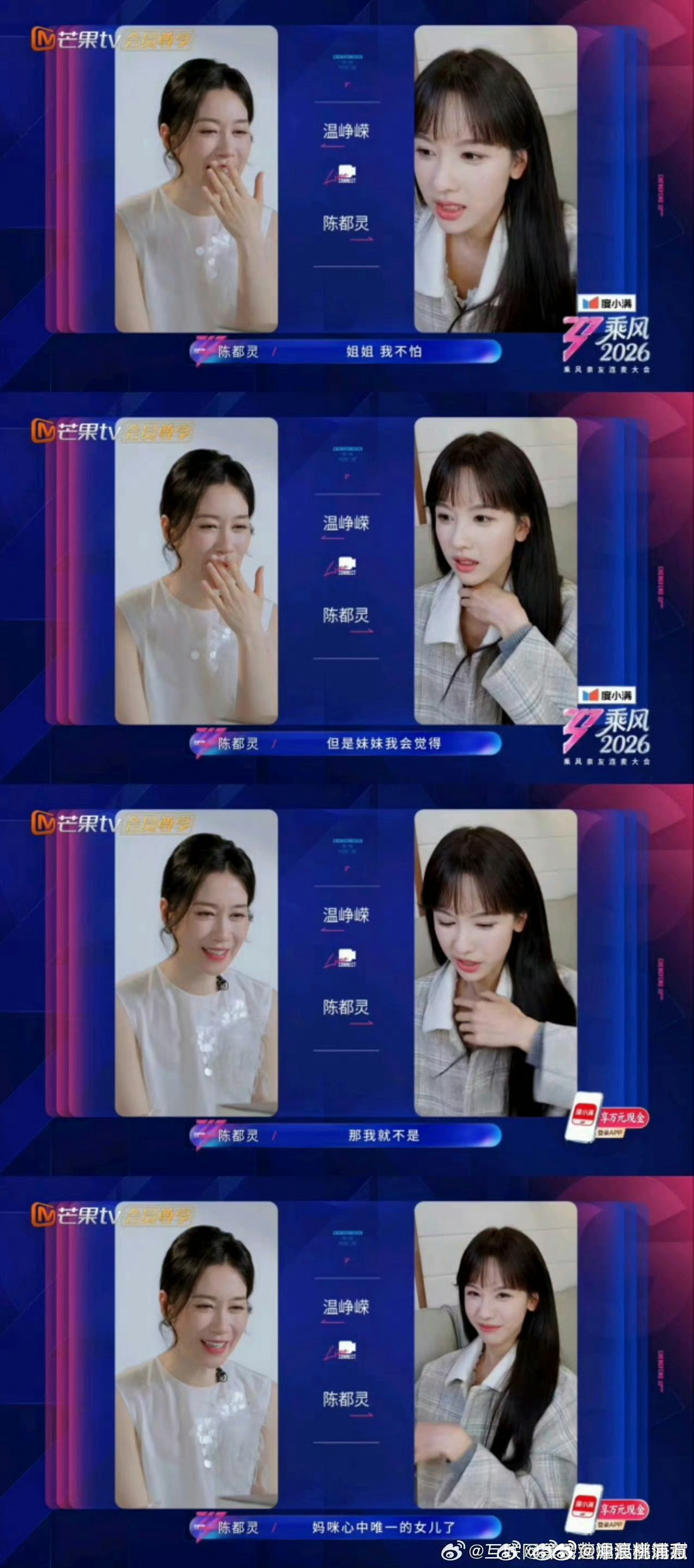 陈都灵是温峥嵘一号女儿温峥嵘和陈都灵同框聊选歌、聊舞台风格,温柔又认真,嘟嘟还撒娇问自己是不是一号女儿,好暖的二位!温峥嵘说陈都灵是她的1号女儿乘风2026