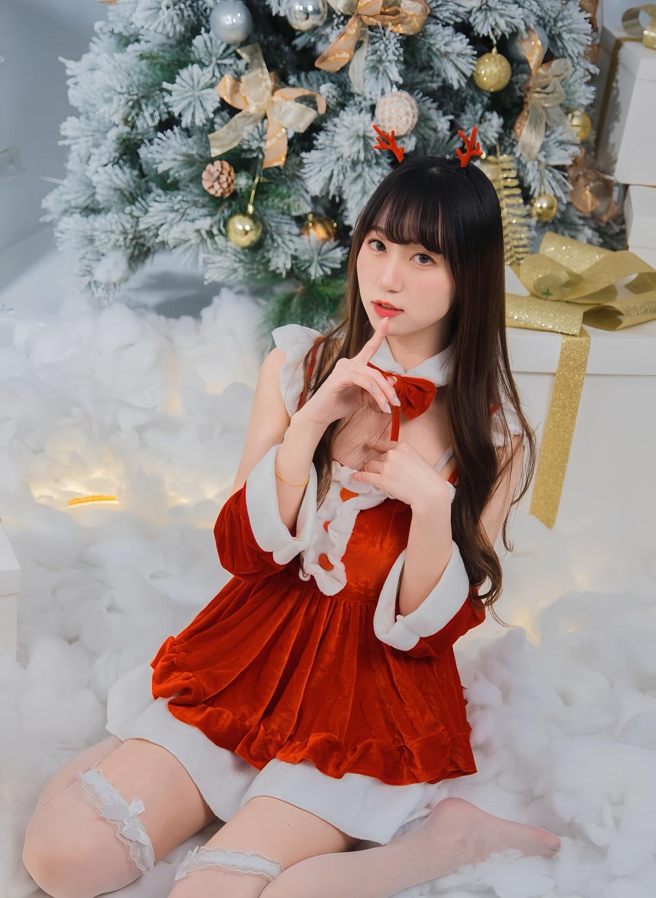 圣诞氛围浓厚的少女,坐在雪地里的圣诞树旁,甜美可爱!🎄💄💕