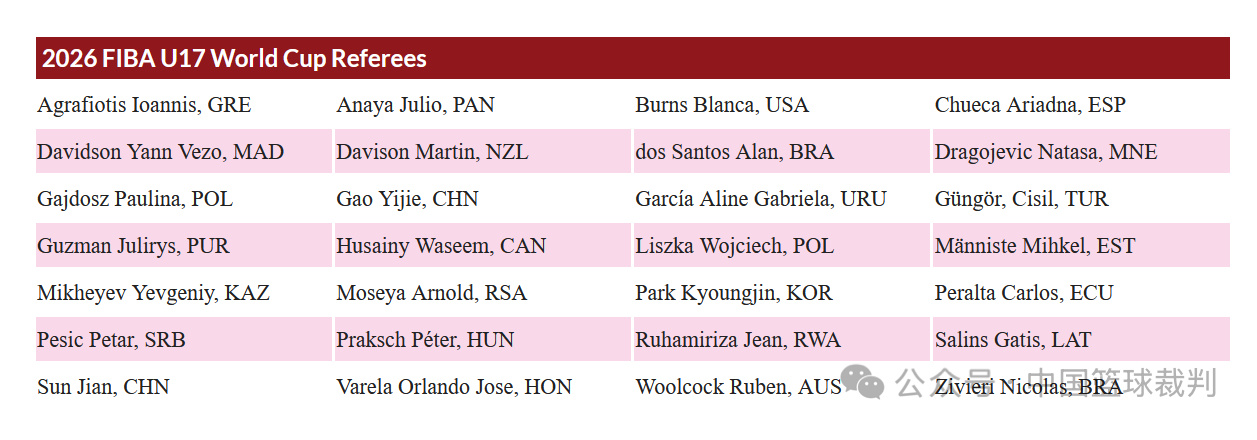 2026年国际篮联U17男篮世界杯将于6月27日至7月5日在土耳其伊斯坦布尔举行。中国国际裁判孙健、高昳杰成功入选本届赛事裁判名单,将代表中国站在国际赛场上执裁。