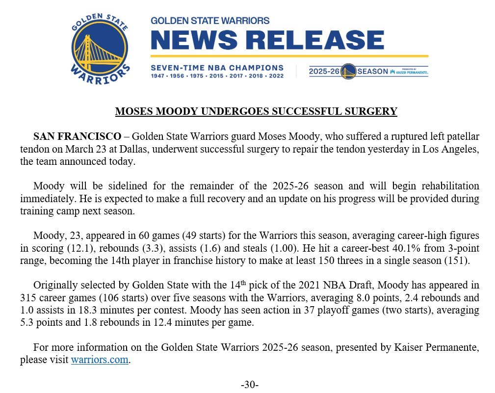 勇士官方:moody在洛杉矶手术成功,确认赛季报销,即将开始康复治疗!