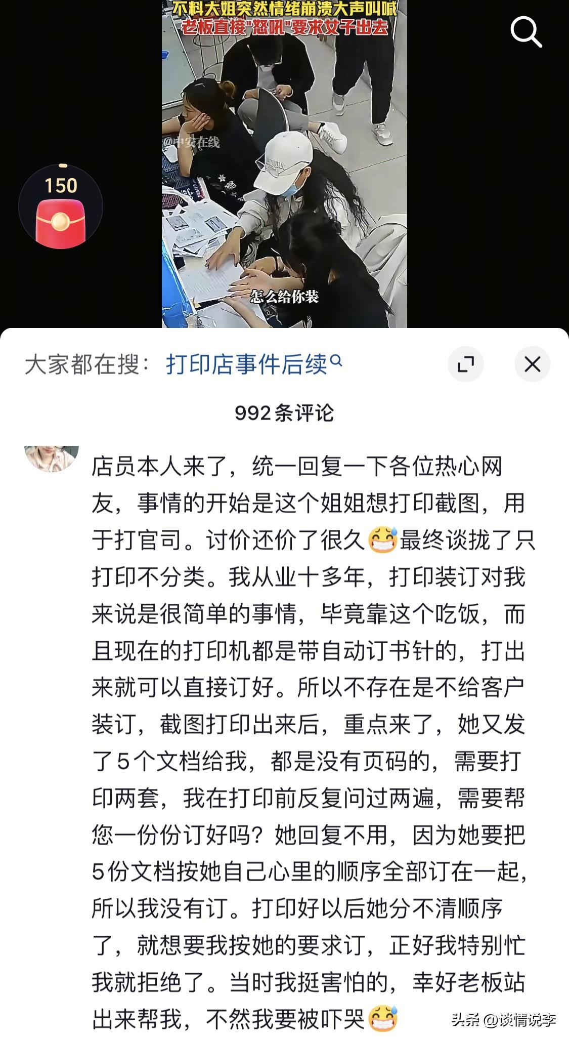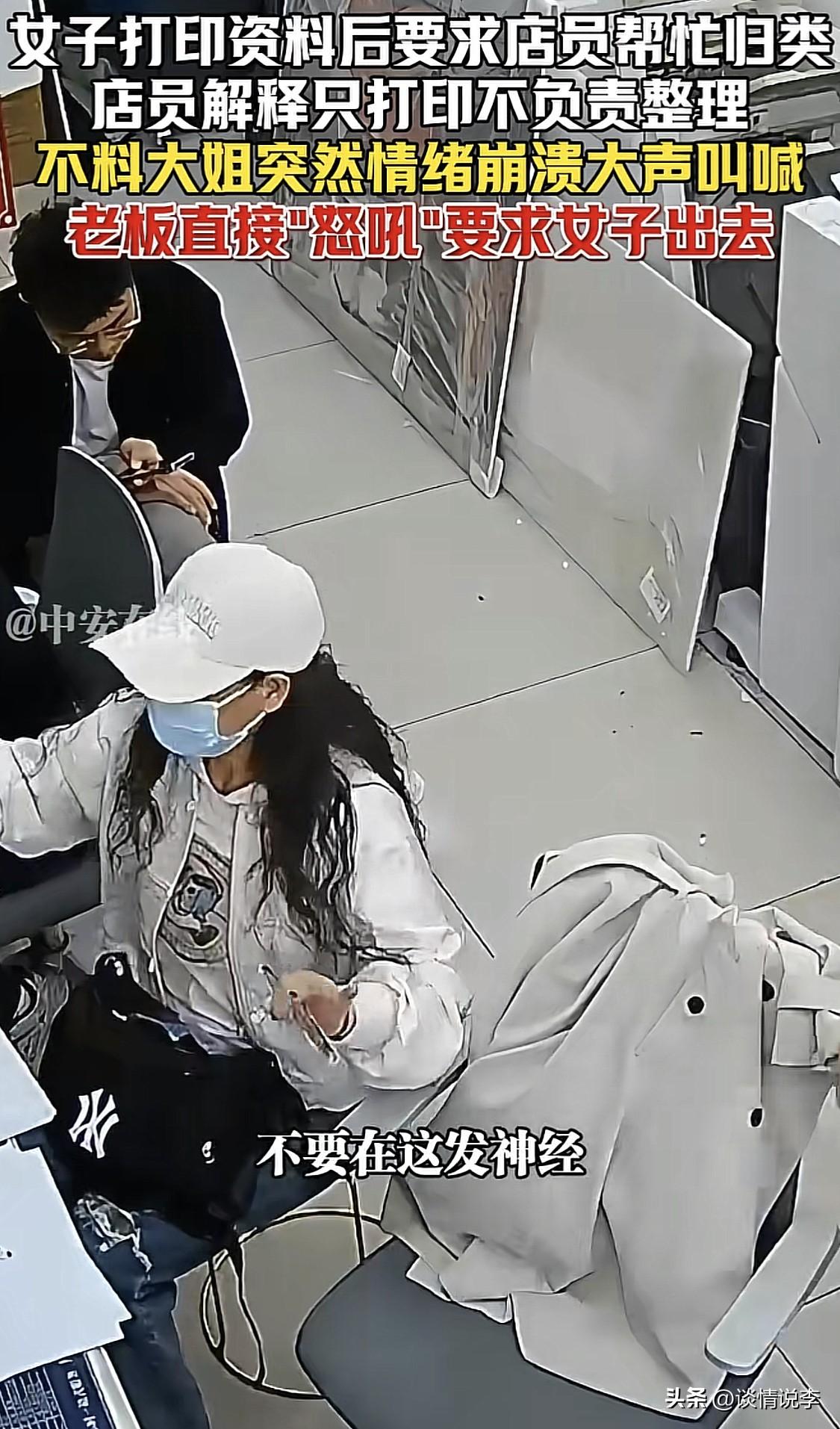 我刚贴好的面膜都要笑裂了。老板一声怒吼“出去!”这位大姐一下子乖了。 一件非常简单的事情,大姐去打印店打印材料,打印之前沟通好了,只负责打印,不负责归类。说好了才开始打印。 打印完毕后,大姐又要求工作人员给她归类并装订,工作人员表示不能归类,因为不知道哪个跟哪个装订到一起。大姐说:“乖乖,你就给我归类一下嘛。”工作人员再次表示不能。 大姐一边吐槽“烦死了”,一边突然崩溃大喊“啊啊啊啊啊”,两只手也在空中胡乱挥舞,感觉非常难受的样子。 开始的时候老板还好声好气地告诉她,打印店只负责打印,不负责归类,你自己弄。看到大姐崩溃大喊,老板也忍不了了,直接怒吼一声:“出去!” 大姐一下子愣了,她万万没有想到老板会吼她。估计心情非常不好了。老板说完“出去”,还加了一句“不要在这里发神经”,大姐委屈地说“我没有发神经。” 这位大姐真的是,打印好的材料自己分类,才不会分错,如此强词夺理让店员归类,被拒后还崩溃大喊,情绪控制能力也太差了。幸好老板那一声吼,不然店员都要被整哭了。再说,自己去店里打印材料,都要仔细过一遍,看看顺序会不会错,如果错了很麻烦,这些事情就不要麻烦店员了,店员怎么知道你的材料是什么顺序? 后续是这样的,店员也就是黑衣服姑娘说,大姐来打印截图,用于打官司,讨价还价很久,说好了只打印不分类。截图打印出来后,大姐又发了5个文档给店员,重点来了,这些材料是没有页码的,让店员打印两套,说她自己按她心里的页码进行装订。打印完之后,她分不清顺序了,于是让店员帮忙分类,店员很忙就就拒绝了,她就崩溃了。 最后,为这位维护员工的老板点赞!