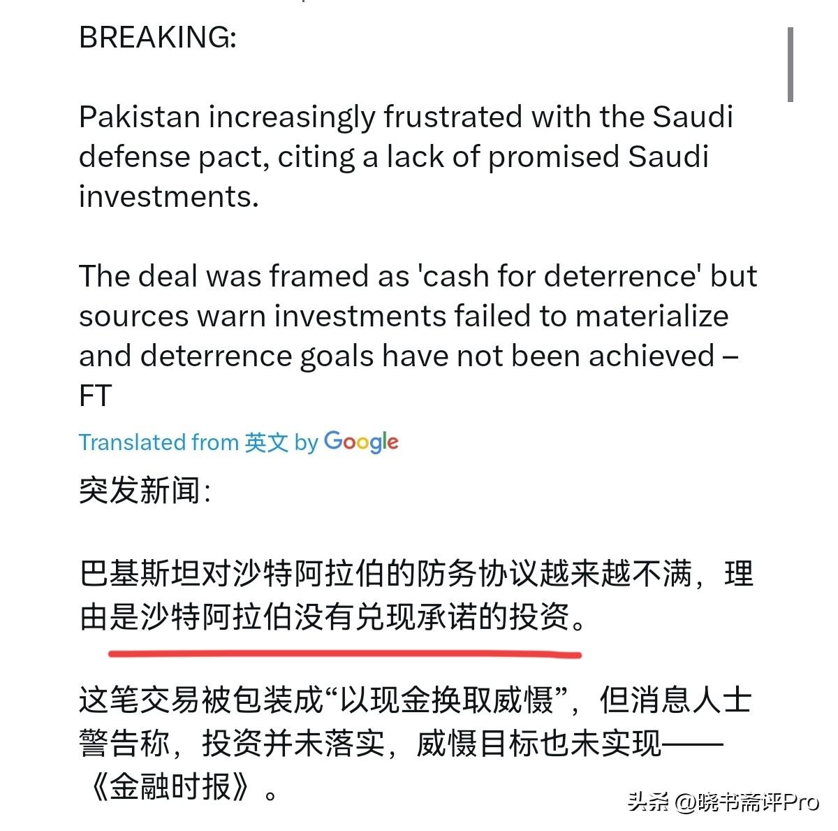 没想到,局面会发展到这一地步,巴基斯坦对沙特不满了!3月29日,外媒报道称,巴基斯坦对沙特的防务协议越来越失望,理由是沙特没有承诺投资。外媒称,这笔交易的框架是“现金换威慑”,但如今巴基斯坦期待的投资没有到位,而沙特想要实现威慑的目标也没有实现。 去年9月,巴沙两国签署共同战略防御协议。没想到协议刚生效,中东就出了这么大的事情。伊朗攻击沙特,按理说巴基斯坦有出兵保护沙特的义务,但是巴基斯坦明显有自己的顾虑。一方面,钱没有到位不说。更重要的是,巴基斯坦与伊朗是邻国,而巴基斯坦的背后还有印度。如果巴基斯坦加入战局,那真可谓是牵一发而动全身。 巴基斯坦当然明白兹事体大,不能贸然行动。以至于现在,去年签的协议,这么快就成为了一场纸面上的同盟。当然,从沙特的角度来讲,沙特也很难。最主要的就是沙特国内财政压力持续加大,对外援助和投资早已不像从前那般阔绰,沙特既要维持对也门、黎巴嫩等传统势力范围的投入,又要应对伊朗方面的军事压力。 因此,沙特根本拿不出当初承诺的真金白银去兑现给巴基斯坦的经济红利。巴基斯坦觉得自己被当成廉价打手,只被要求尽义务却拿不到实惠;沙特则埋怨巴基斯坦在关键时候态度暧昧、威慑不力。很显然,协议刚签,结果就等同于作废,事实再次证明,军事同盟关系,真的要慎重。否则,国家信用都因此而大打折扣。