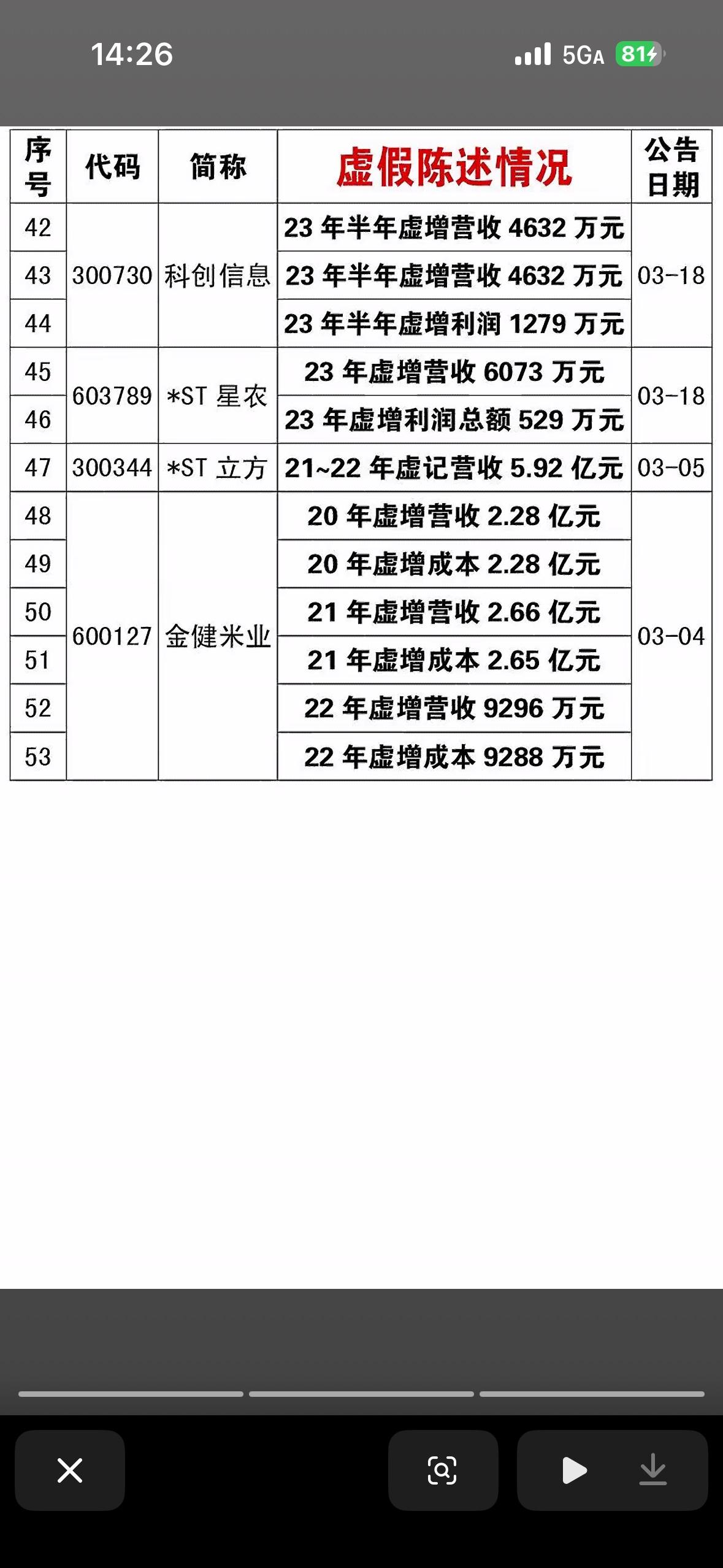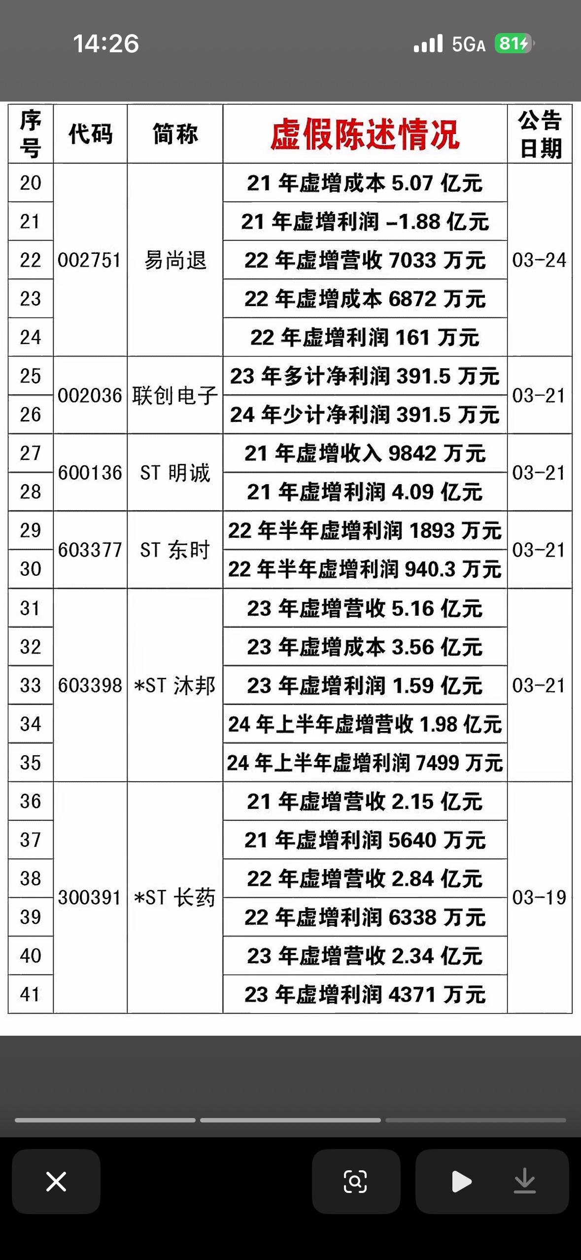 3月财务“排雷”名单曝光!53条造假记录触目惊心,这些公司你踩雷了吗? 3月收官之际,A股市场迎来一场“财务打假风暴”!从老牌药企到科技新锐,从电子制造到农业龙头,18家公司、53条虚假陈述记录密集曝光,涉及虚增利润超50亿元,少计成本超20亿元。监管重拳之下,这些“带病”公司正面临退市、索赔双重风险,投资者如何避坑?一图看懂核心风险点! 一、造假手段“花样百出”:从“虚增利润”到“系统性财务舞弊” 1. ST百灵(002424):四年财务“大挪移”,利润调节超10亿 - 造假手法:2019-2021年连续三年“多计利润”,累计虚增超6亿元;2023年“少计利润”4.59亿元,上演“利润过山车”。 - 风险警示:从“美化财报”到“业绩大洗澡”,公司财务真实性存疑,当前已戴帽ST,退市风险加剧。 2. 易尚退(002751):三年虚增营收超10亿,退市边缘的“最后挣扎” - 造假手法:2018-2022年连续五年虚增营收,2020年单年虚增营收3.26亿元,虚增利润超9000万元;2021年甚至出现“虚增成本5.07亿元、虚减利润1.88亿元”的矛盾操作。 - 风险警示:公司已进入退市整理期,“财务造假+退市”双重利空下,投资者血本无归风险极高。 3. *ST沐邦(603398):虚增利润1.59亿,光伏转型背后的“数字游戏” - 造假手法:2023年虚增营收5.16亿元、成本3.56亿元,虚增利润1.59亿元;2024年上半年继续虚增营收1.98亿元。 - 风险警示:公司试图通过“虚增业绩”支撑光伏转型故事,但财务造假暴露后,转型前景蒙上阴影,股价已腰斩。 二、行业“重灾区”:医药、电子、农业集体“爆雷” 1. 医药行业:从“虚增收入”到“成本造假” - ST明诚(600136):2021年虚增收入9842万元、利润4.09亿元,通过“虚构赛事版权交易”美化业绩; - *ST长药(300391):2021-2023年连续三年虚增营收超7亿元,虚增利润超1.6亿元,从“药企”沦为“造假典型”。 2. 电子行业:营收“注水”成风 - 联创电子(002036):2023年多计利润391.5万元,2024年少计利润391.5万元,“精准”调节利润; - 科创信息(300730):2023年半年虚增营收4632万元、利润1279万元,通过“虚构软件销售合同”造假。 3. 农业行业:成本与利润“双虚增” - 金健米业(600127):2020-2022年虚增营收超5亿元,虚增成本超5亿元,“营收成本同步注水”掩盖真实盈利; - *ST星农(603789):2023年虚增营收6073万元、利润529万元,通过“虚构农产品交易”美化财报。 三、监管“零容忍”:造假公司面临“退市+索赔”双重打击 1. **退市风险:易尚退、*ST长药等或成“首批”** - 易尚退:已进入退市整理期,造假金额巨大,投资者索赔诉讼已启动; - **ST百灵、*ST沐邦**:连续多年造假,触及“重大违法强制退市”红线,退市倒计时开启。 2. 索赔进行时:投资者可依法维权 - 典型案例:*ST东时(603377)2022年半年虚增利润超2800万元,投资者已发起集体索赔; - 维权路径:受损投资者可登录证监会官网或委托律师,依据《证券法》提起民事诉讼。 四、投资者避坑指南:三招识别“财务造假”公司 1. 看“营收成本匹配度” - 异常信号:营收增长但成本不增(如易尚退2020年虚增营收3.26亿、成本仅虚增2.35亿),或成本增长但毛利异常(如金健米业“营收成本同步虚增”)。 2. 看“利润调节痕迹” - 异常信号:连续多年“精准”调节利润(如联创电子2023-2024年利润“多计少计”完全对冲),或“虚增利润”与“虚增资产”同步(如司尔特2021年虚增资产4580万、虚增利润4580万)。 3. 看“监管处罚历史” - 预警信号:公司曾因信息披露违规被监管问询(如*ST立方2021-2022年虚记营收5.92亿),或高管频繁变动(如ST明诚2021年造假后高管集体离职)。 结语:财务造假“零容忍”时代,价值投资才是王道 3月这波“财务打假”风暴,既是监管层“零容忍”的体现,也是市场出清的开始。对于投资者而言,远离“造假公司”、拥抱“真成长企业”,才是穿越牛熊的唯一路径。你手中的股票是否在“排雷名单”中?评论区留言,帮你避坑! 风险提示:本文基于公开资料整理,不构成投资建议。股市有风险,投资需谨慎。