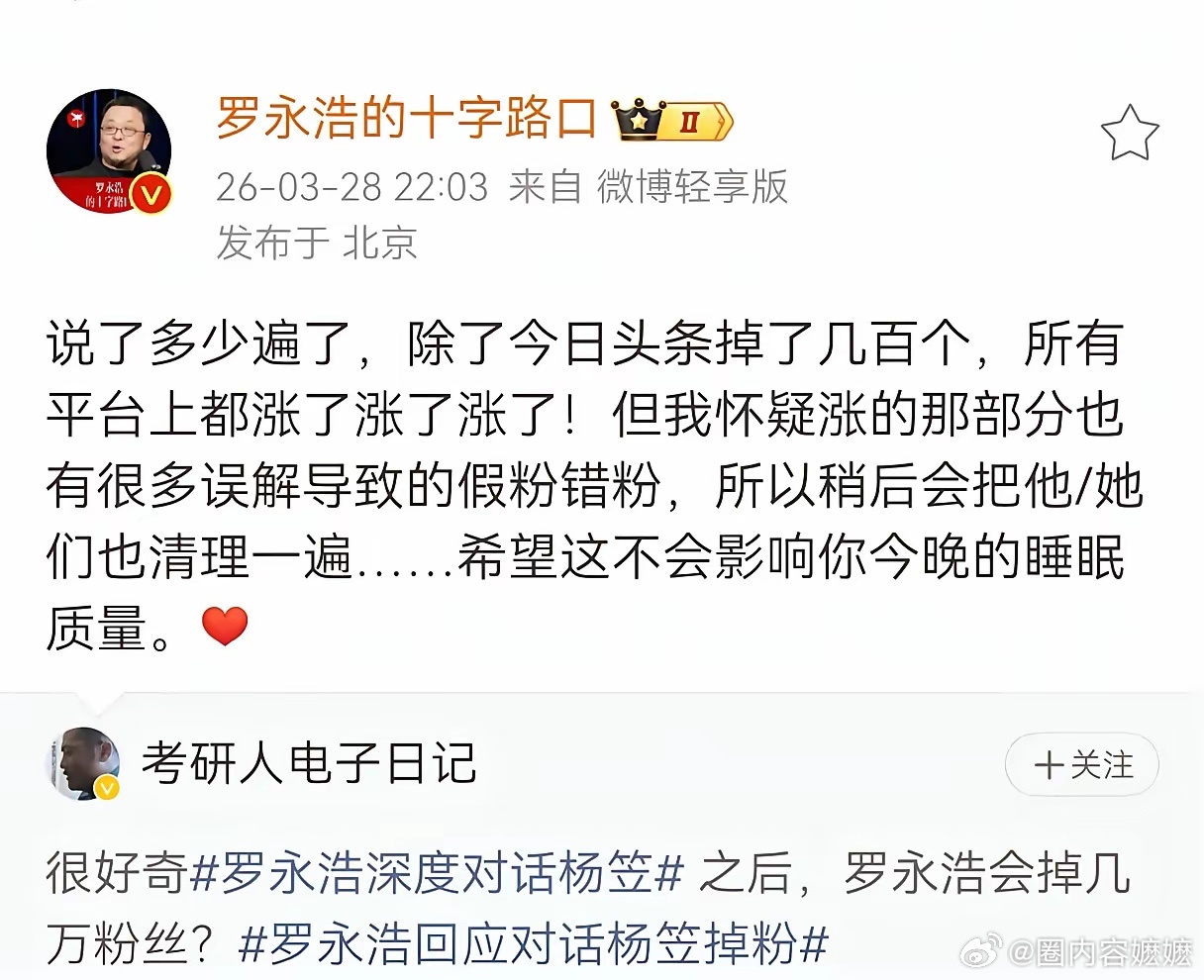罗永浩和全网杠上了,粉丝变化惊人,但我觉得他在走贾国龙的路。早上一起来先是刷到不