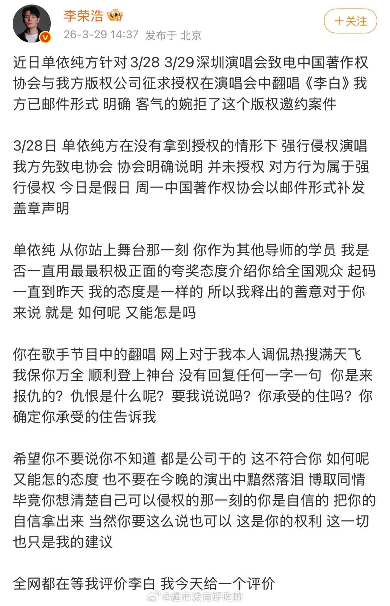 李荣浩喊话单依纯强行侵权演唱《李白》好大的🍉壶坛好热闹,都是本人亲自下场啊有一
