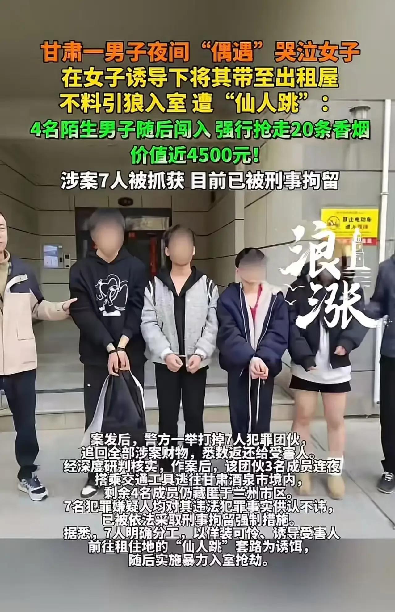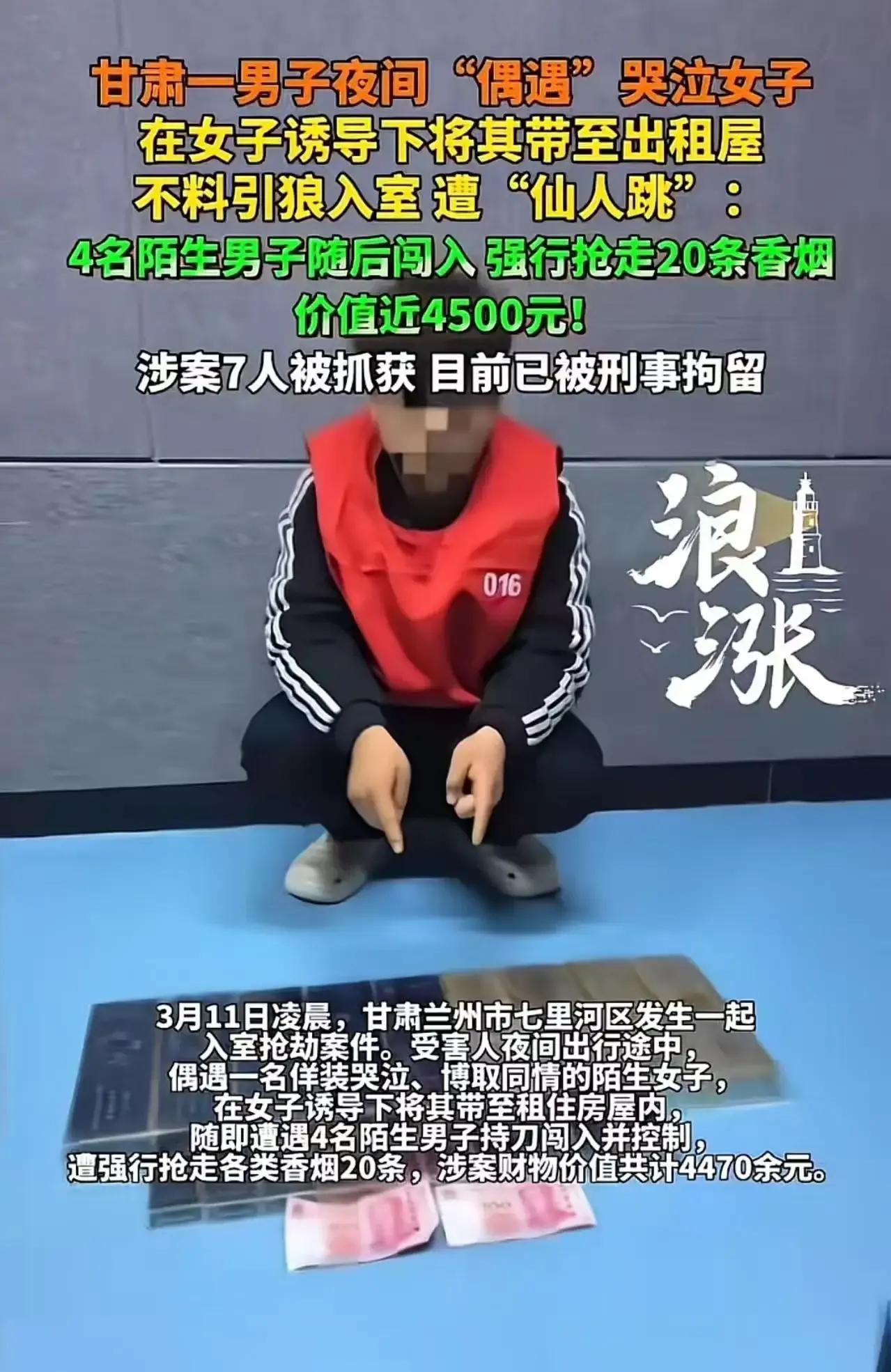 甘肃一男子深夜“桃花运”变“桃花劫”,本以为邂逅美女是好事,没想到却引狼入室,遭遇了“仙人跳”!这究竟是怎么回事呢? 据悉,该男子在夜间偶遇了一位哭泣的美女,美女以求助为名,诱导男子将其带至出租屋。男子本以为自己走了桃花运,不料却陷入了一场精心设计的骗局。随后,4名陌生人突然闯入,强行抢走了男子20条香烟,价值近4500元。男子报警后,警方迅速展开调查,最终将涉案的7人全部抓获,目前他们已被刑事拘留。这起事件引起了网友的广泛关注,大家纷纷表示,当“美女求助”变成了“持刀抢劫”,当“英雄救美”变成了“引狼入室”,以后谁还敢在深夜对陌生人释放善意?这不仅仅是一起简单的抢劫案,更是对社会信任的一次严重冲击。这7个人抢走的,不仅仅是受害者的财物,更是人与人之间那点仅存的信任。 这起事件给我们敲响了警钟,深夜对陌生人释放善意时,一定要多留个心眼。大家对此有何看法呢?快来评论区留言讨论,一起分享你的观点吧!仙人跳套路 桃花梦境 仙人跳强奸 Ktv艳遇 艳遇陷阱