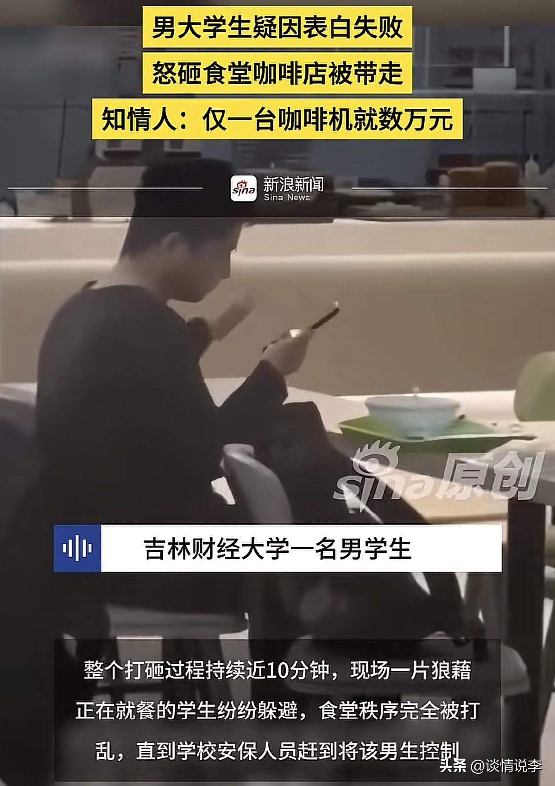 这个表白失败的男生,他的父母要哭晕在厕所里了。 满心欢喜地抱着一束鲜花跑到食堂,向喜欢的女生表白,结果没想到被女生拒绝了,心理落差肯定是非常大,怒从心中来,当场砸了库迪咖啡店,据现场视频,这位男生打砸食堂持续了近10分钟,大量的一次性筷子和饭菜被他疯狂地扔在地上,桌椅倒地一片狼藉,最重要的是他破坏了一台咖啡机。 不要以为这是小事儿,知情人介绍,这台咖啡机价值超过了10万元,其他设备、食材和公共设施大概5万元。也就是说,这位男生破坏了公共财产15万元。 事件发生在吉林财经大学的食堂,打砸的这个男生被学校安保人员当场带走。据后续爆料,已经被移交警方。 视频中可以看到,这位男生身着黑色衣服,坐在一张桌子前,桌子上摆放着一束鲜花,表白前的他激动地手舞足蹈,手里拿着手机,脚一直在抖动…… 这位男生情绪控制能力太差了,人格偏执,典型的输不起,接受不了挫败,这个女生万幸当场拒绝了,假设以后结婚,有她的好果子吃。 不知道这是谁家的孩子,父母辛辛苦苦培养的大学生,还没等到毕业走上社会,就先进去了。父母估计做梦都想不到会发生这样的事情。 涉嫌故意毁坏财物罪、寻衅滋事罪,并非简单的治安违法,有可能面临3到7年的刑期。只能说,冲动是魔鬼,他的一时冲动把自己完全毁了,拿不到毕业证,有了前科考公考编都不可能。父母还要赔钱,15万只是一个开始,咖啡店停业装修,估计都得算在他的头上。 最后,甚至有点可怜这个男生,不知道他的心理是否健康。