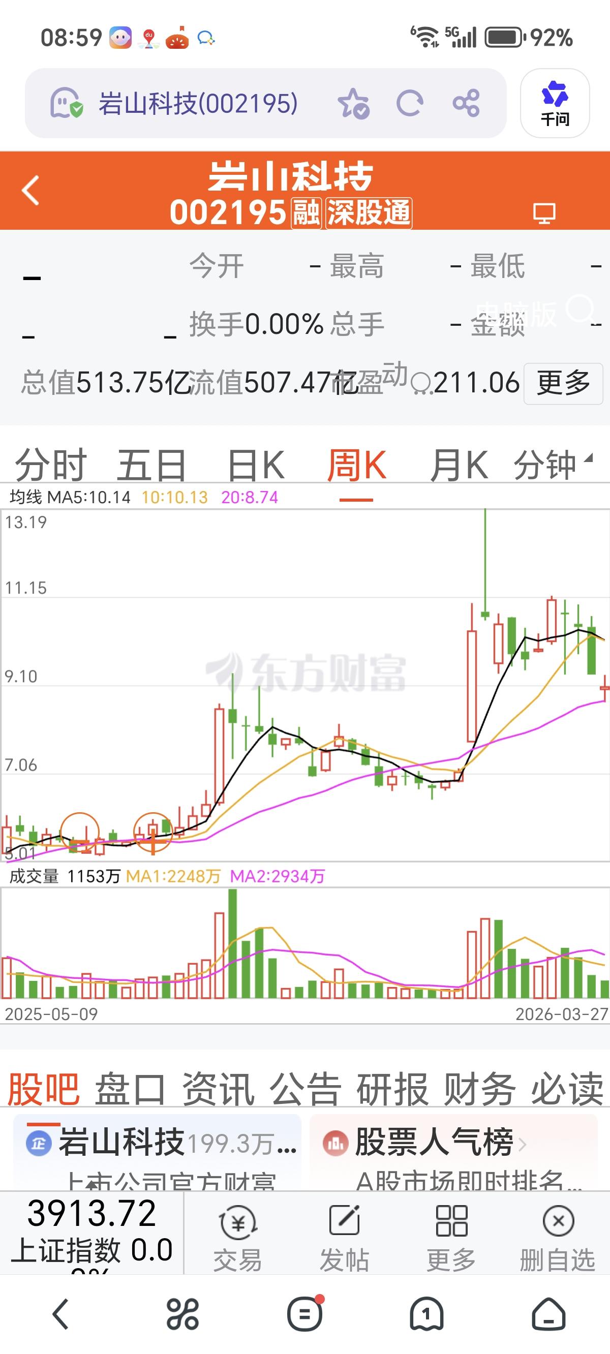 开盘前预测,岩山科技(002195)多条均线压制,即使大阳线收盘,也是反弹。 话不多说,看日K线。 大涨首先必须站到10元以上。 当然,现在是短线最佳良机。 涨3—5%就是机会; 跌3—5%也是机会。 看谁能把握机会?