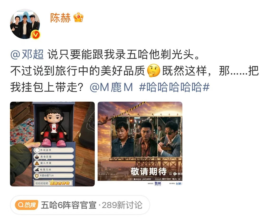 陈赫五哈团旅游吉祥物 五哈团旅游吉祥物陈赫上线,只能说简直不要太适配,会吃会唠会避坑,还能随时调节气氛,方圆五米内emo概率下降80%,旅行幸福感直接翻倍,我也想拥有同款旅行搭子 陈赫让鹿晗把他挂包上带走