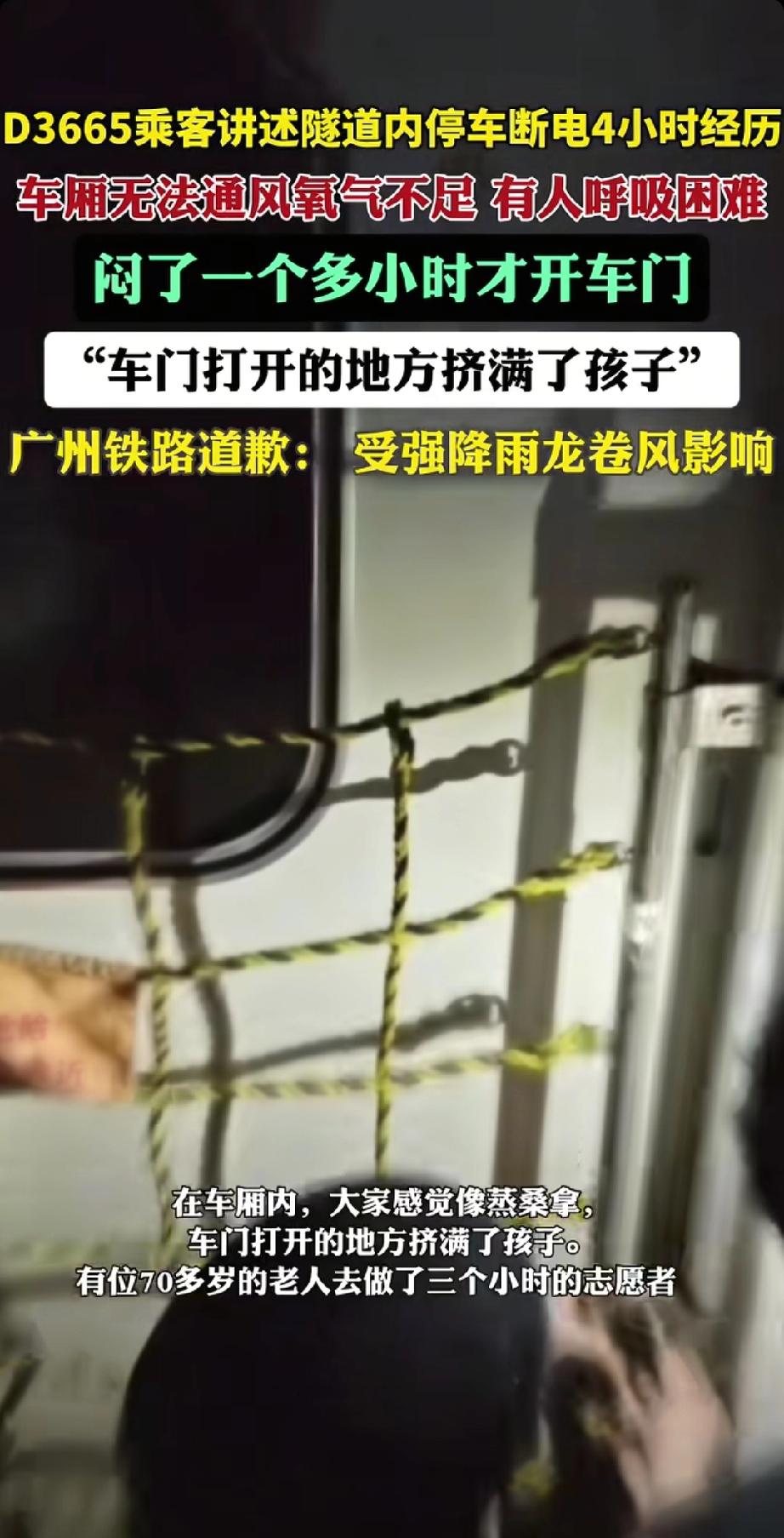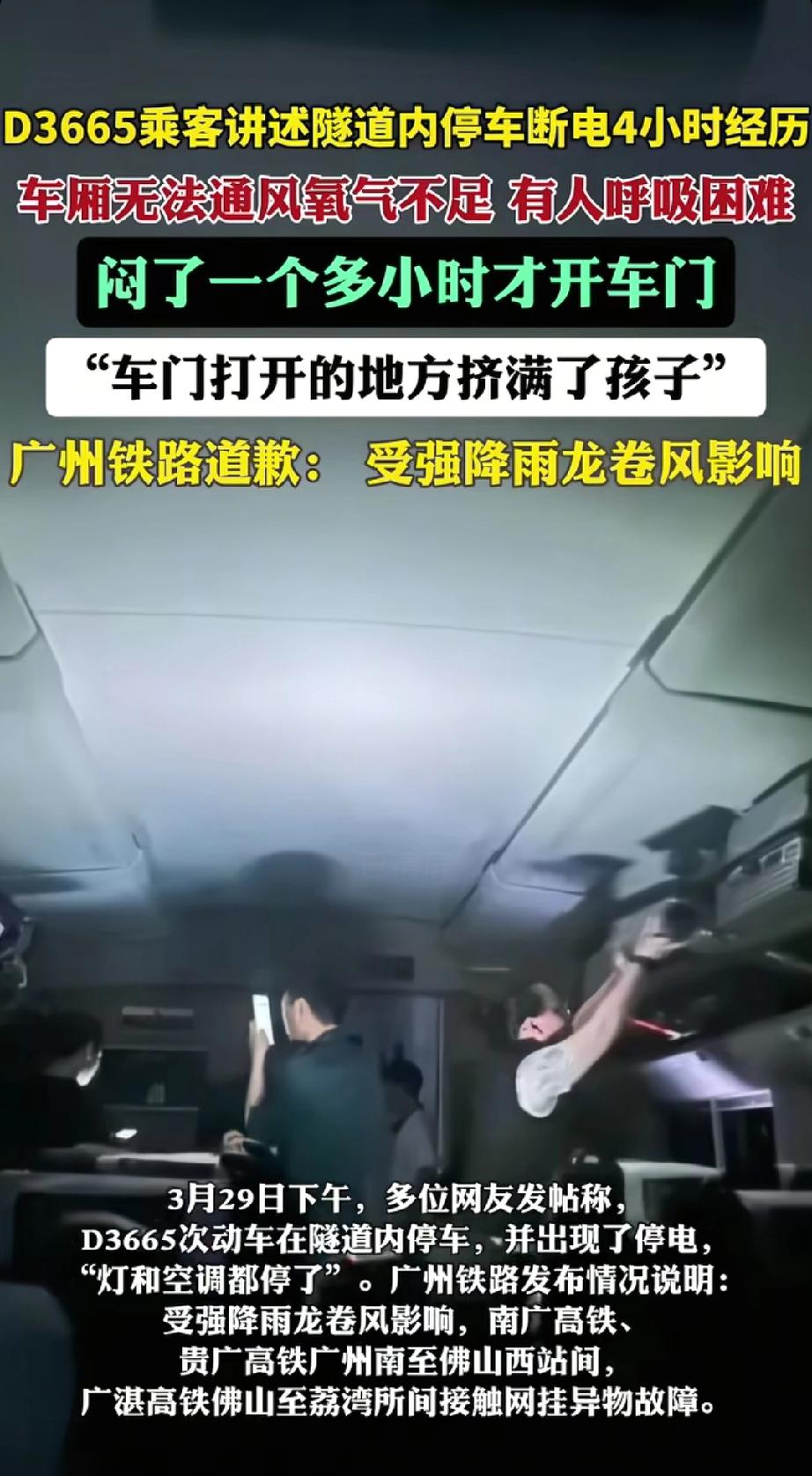 突发!D3665次列车全车断电被困隧道3小时,乘客称“小孩热哭了但不让窗”,众人用手机灯光照明,广州铁路回应。 3月29日下午,D3665次列车可真是让乘客们遭老罪了!这趟从桂林北开往珠海的列车,在佛山至广州南站间的隧道里被困了3小时。14时许过佛山站进隧道后突然停车,接着全车断电,空调也停了,车厢里闷热得不行,小孩都热哭了。 乘务员不让下车也不让砸窗,说列车长在请示。乘客只能用手机灯光照明。12306客服说列车滞留是广州暴雨闹的,当天好多去广州的列车都晚点。广州铁路公告是强降雨龙卷风让接触网挂异物故障。希望以后能多些应急预案,别让乘客这么煎熬啦。 D3665次列车