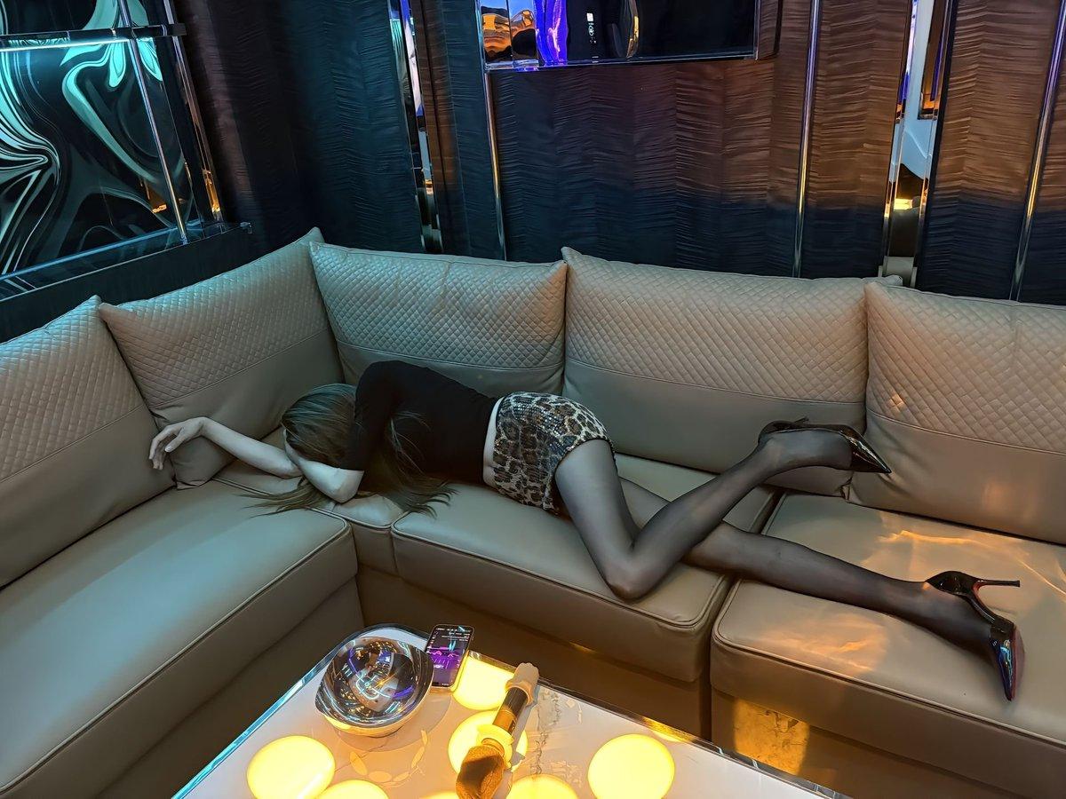 根据沙发的长度,测算该女生的身高。 KTV的沙发一般长度跨度为70-80cm,取中间值75cm,该女子横跨2.5个沙发, 长度大约是180cm, 再去除高跟鞋的高度5-7cm, 综上,该女子的身高在173-175cm。 属于是非常标准的美女身材了。