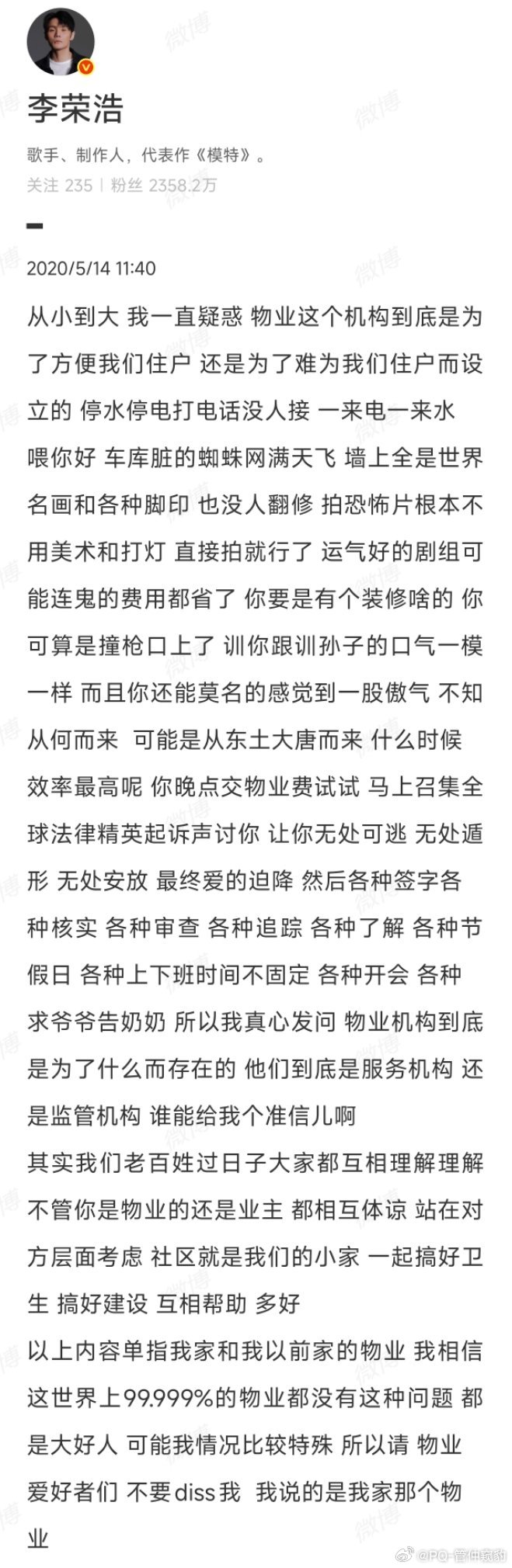 李荣浩骂物业 传世经典 物业该骂有没有发现李荣浩似乎不会用标点符号