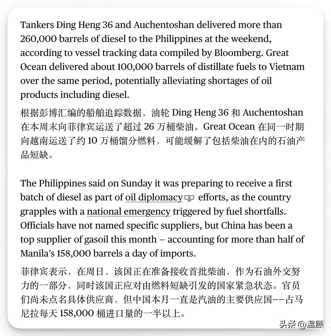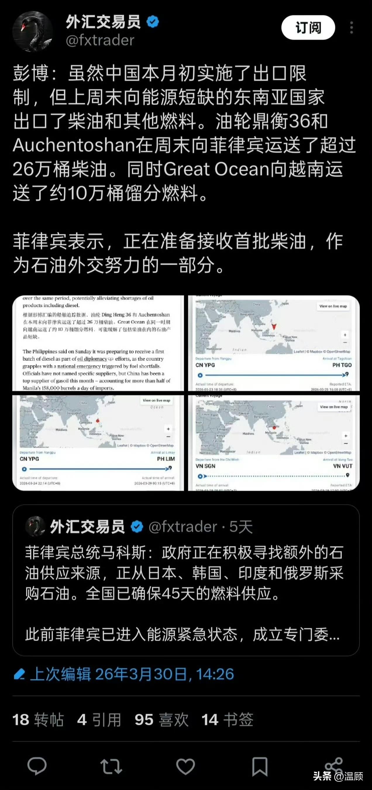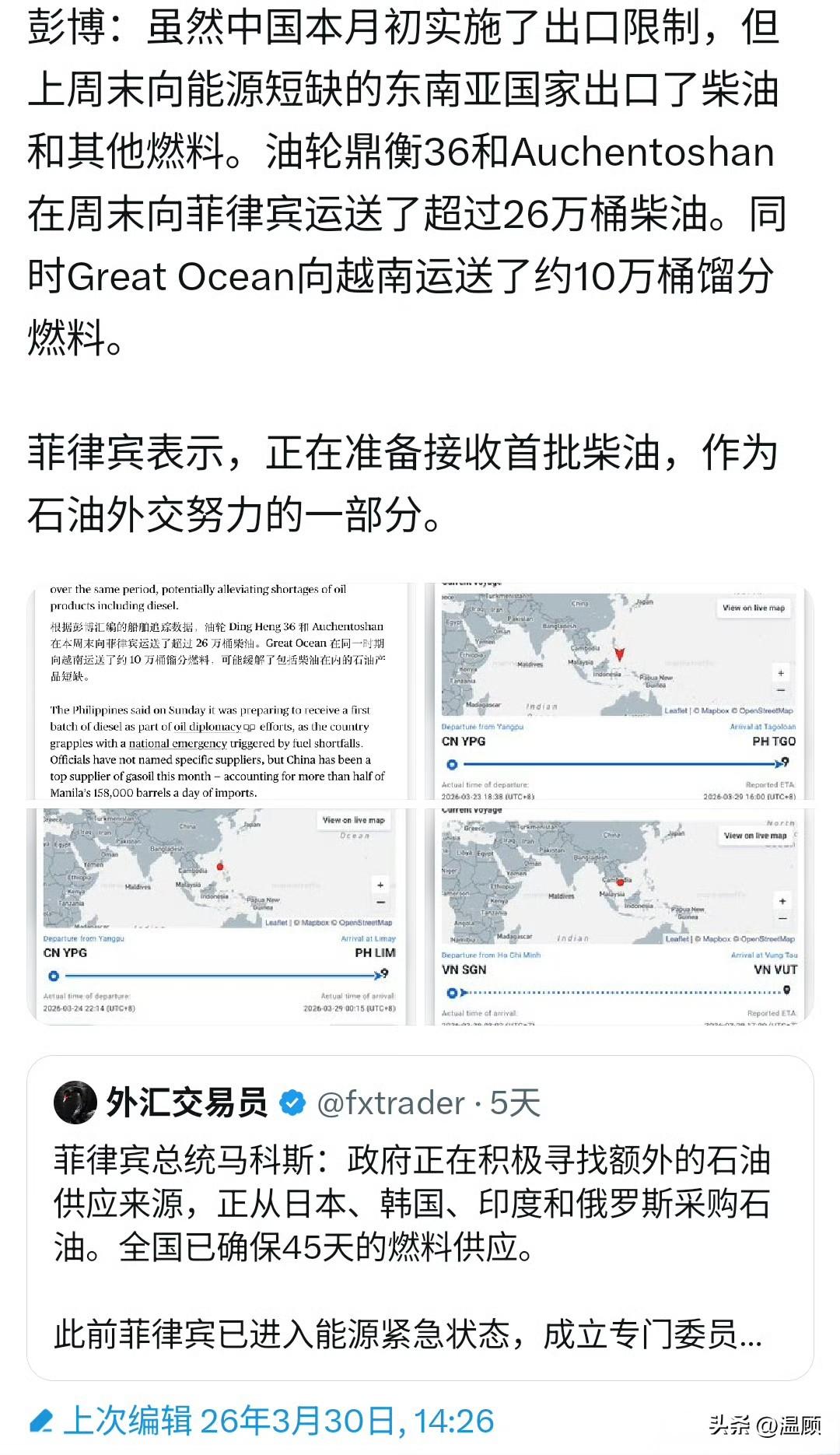 中国向菲律宾运送26万桶柴油……综合船只追踪数据显示,本周末,中国两艘油轮向菲律宾运送超26万桶柴油并顺利交付,有力稳定菲律宾能源市场,缓解当地燃油供应紧张,保障民生与交通用油。 值得关注的是,本月初中国曾实施成品油出口限制,此次针对菲能源紧急状态特事特办,尽显务实相助。 除能源外,中方也持续支援菲农业刚需,近期首批15万吨尿素已发货,4月初将全部运抵,填补春耕化肥缺口。