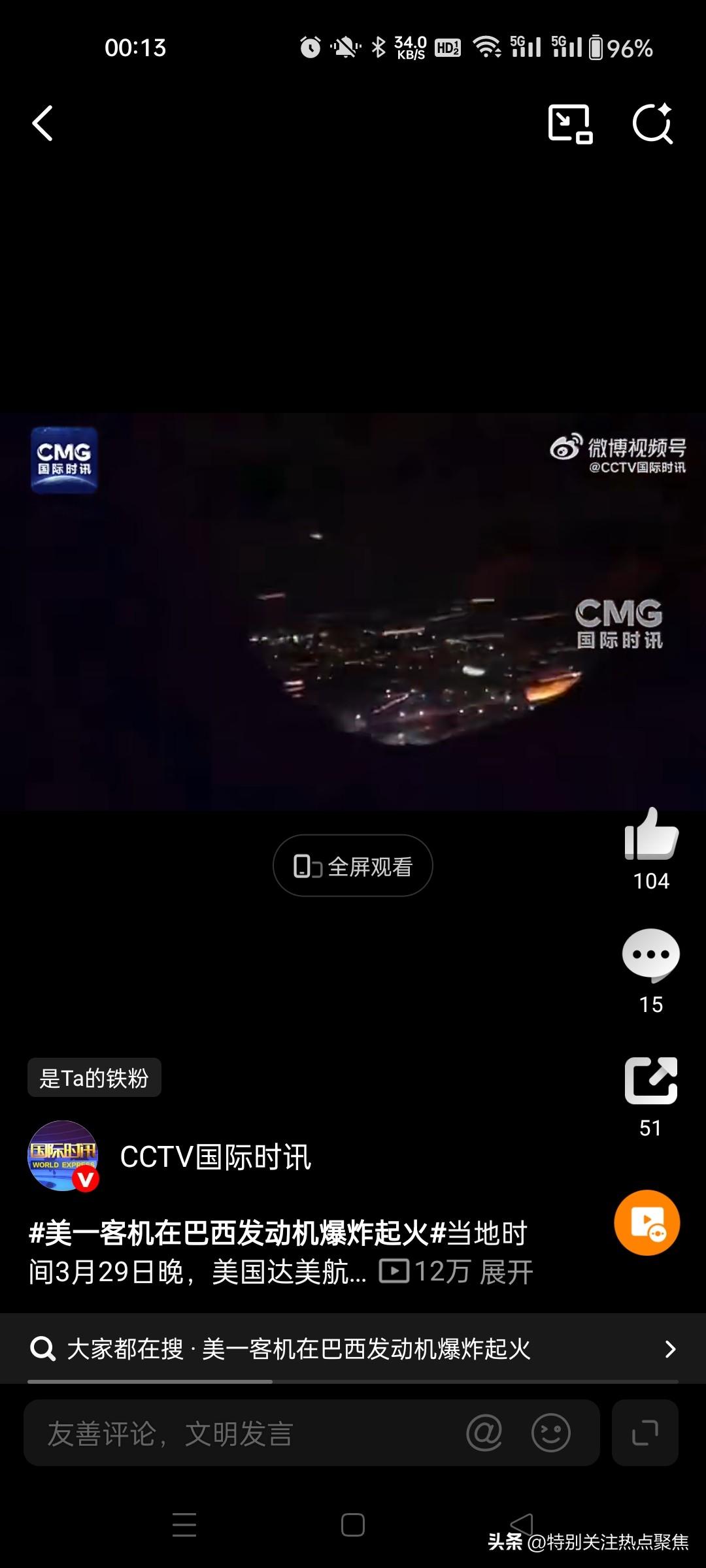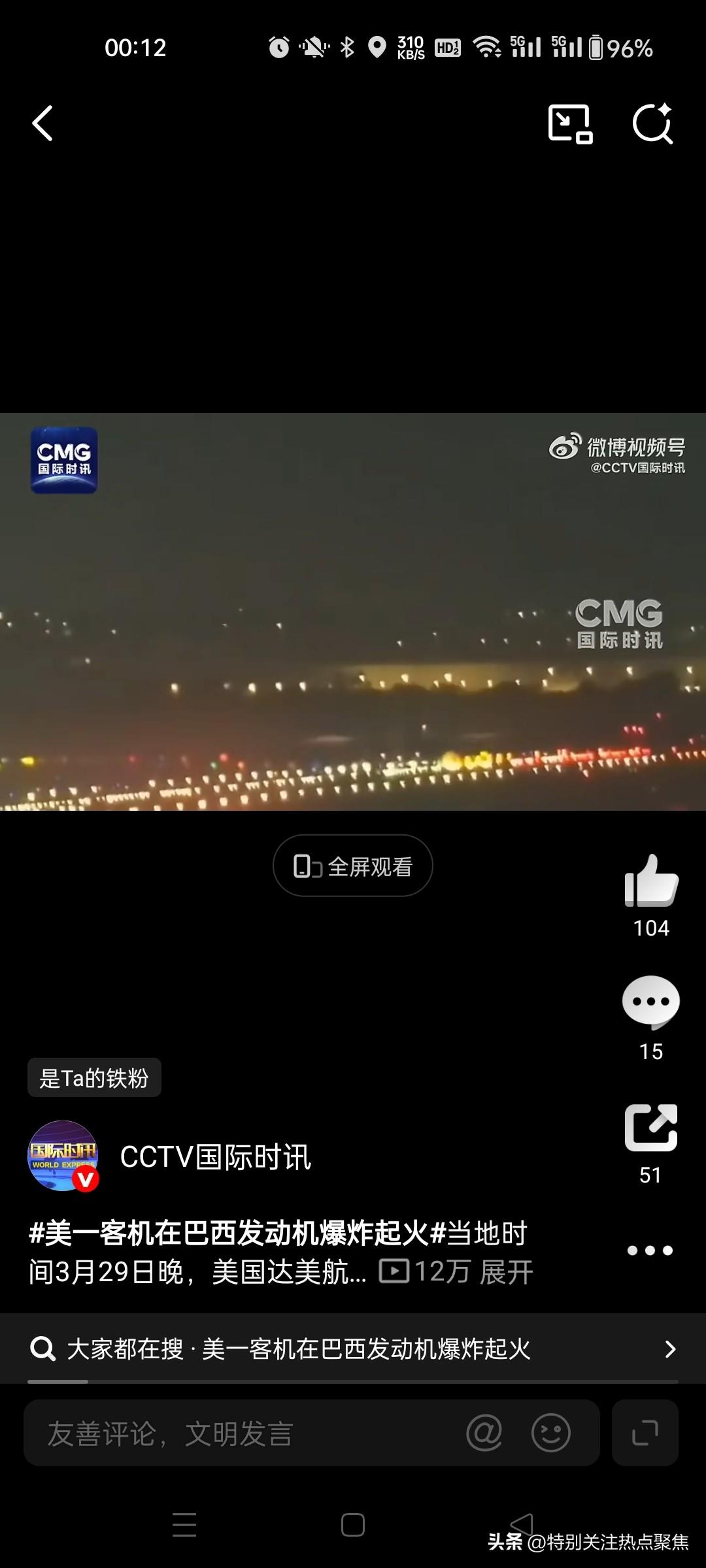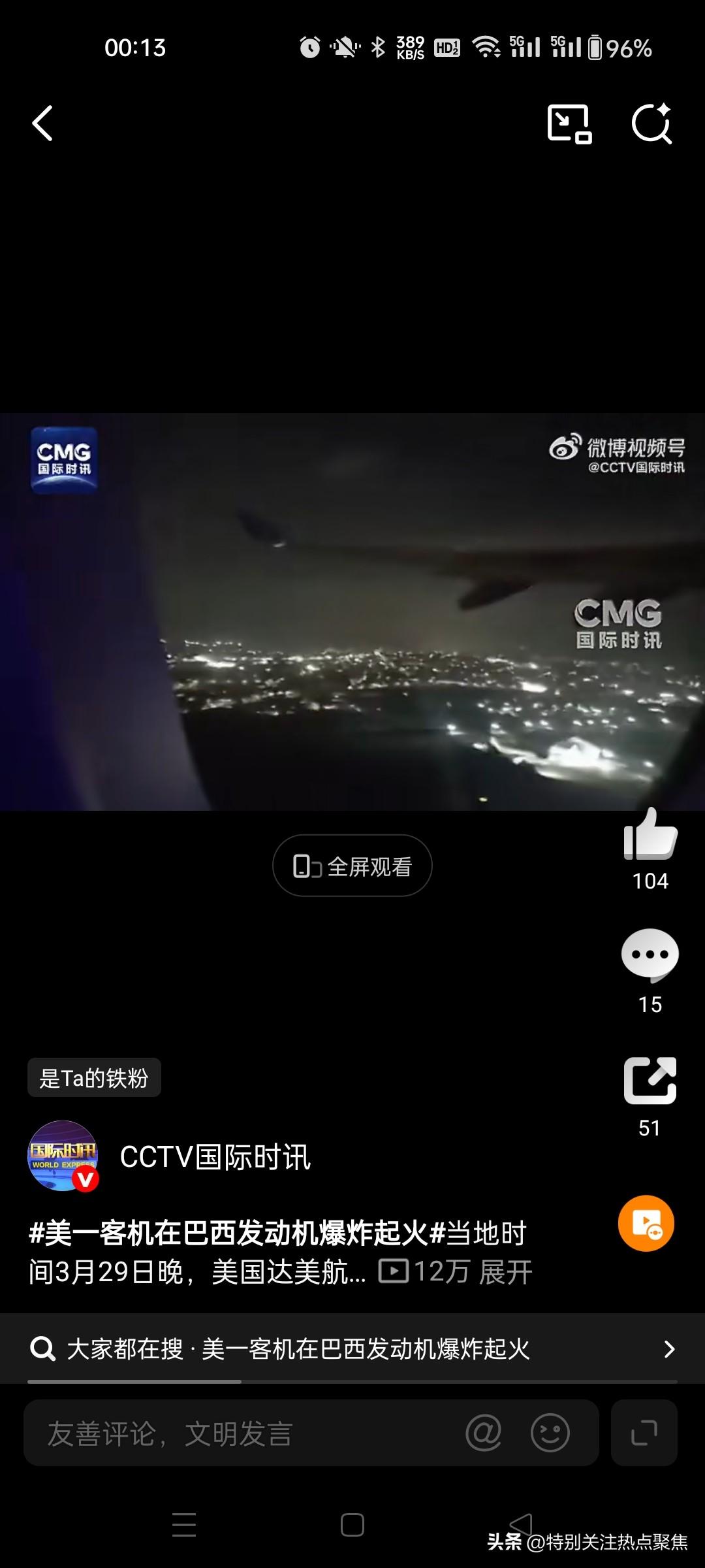 达美航空空客A330客机起飞后不久左侧发动机发生爆炸。飞行员随即返航并实施紧急迫降,飞机最终安全降落,机上人员无人伤亡。 事件概要:当地时间2026年3月29日晚,达美航空一架空客A330-300客机(航班号DL104,注册号N813NW)从巴西圣保罗瓜鲁柳斯国际机场起飞后不久,左侧发动机发生爆炸并起火,伴随多声巨响和持续火光。 机组处置:飞行员立即中断起飞程序,返航并于约9分钟后安全紧急迫降,未造成人员伤亡。 机上情况:航班原计划飞往美国亚特兰大,机上共286人(含乘客与机组),事故发生时刚完成抬轮阶段,后排乘客目击了发动机着火全过程,客舱一度陷入恐慌。 地面影响:部分发动机碎片坠落至机场草坪区域,引发地面火情,已被消防部门迅速控制。 后续安排:航班已取消,所有乘客被安置在圣保罗当地酒店,行程将重新安排。 飞机信息:涉事飞机为A330-300型,搭载普惠PW4168A发动机,机龄约19.3年。 事故原因:目前仍在调查中,初步猜测可能与鸟击或异物吸入有关,但尚未有官方结论。