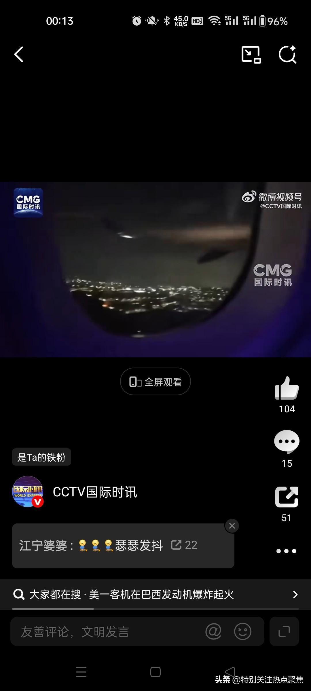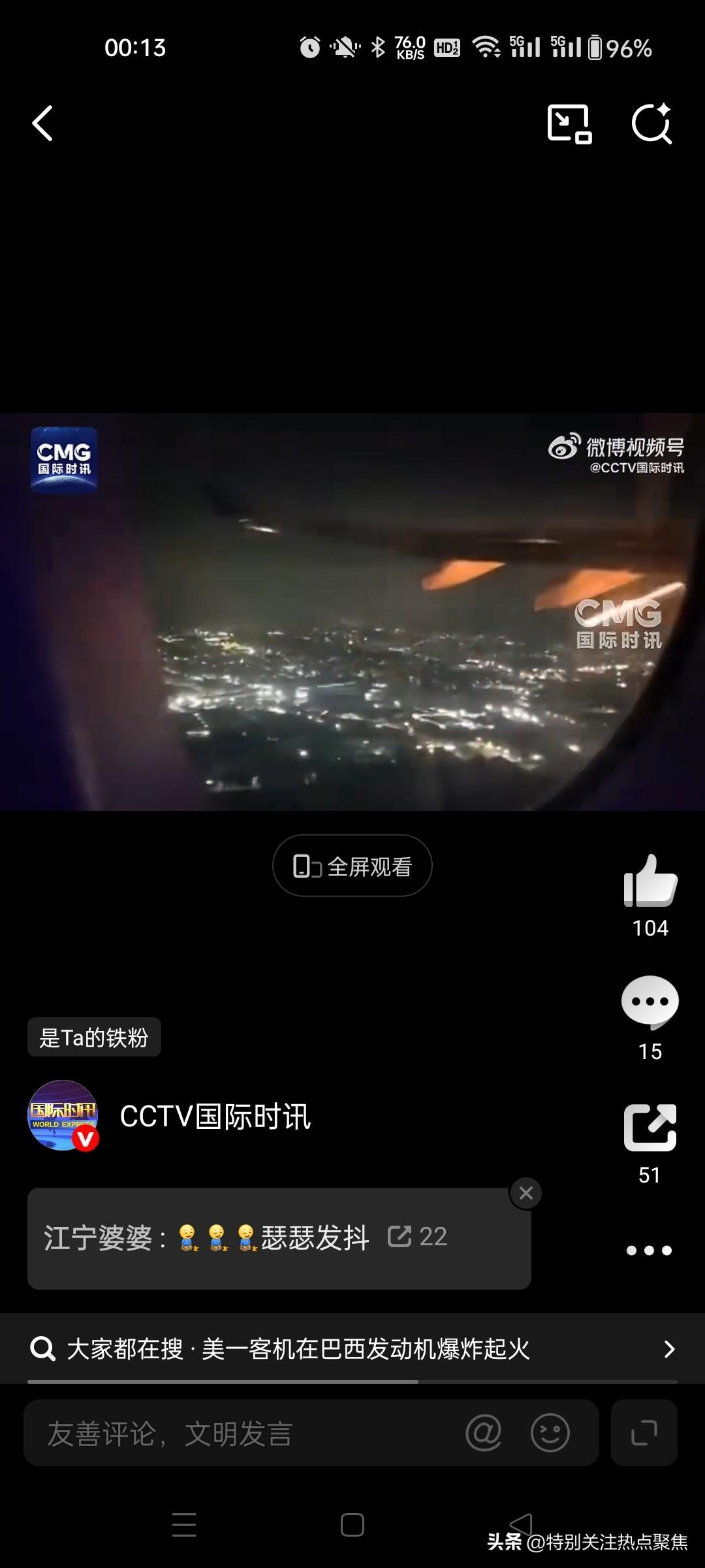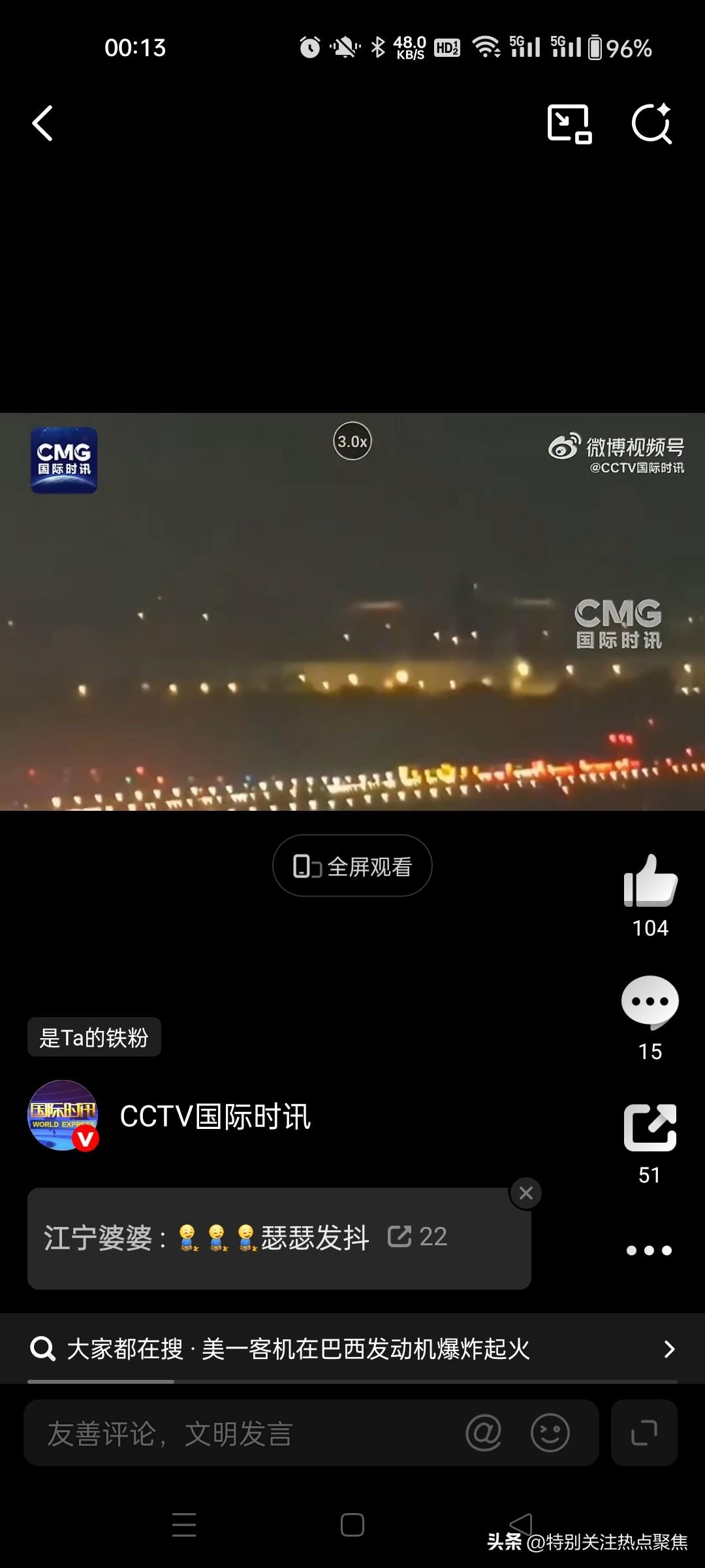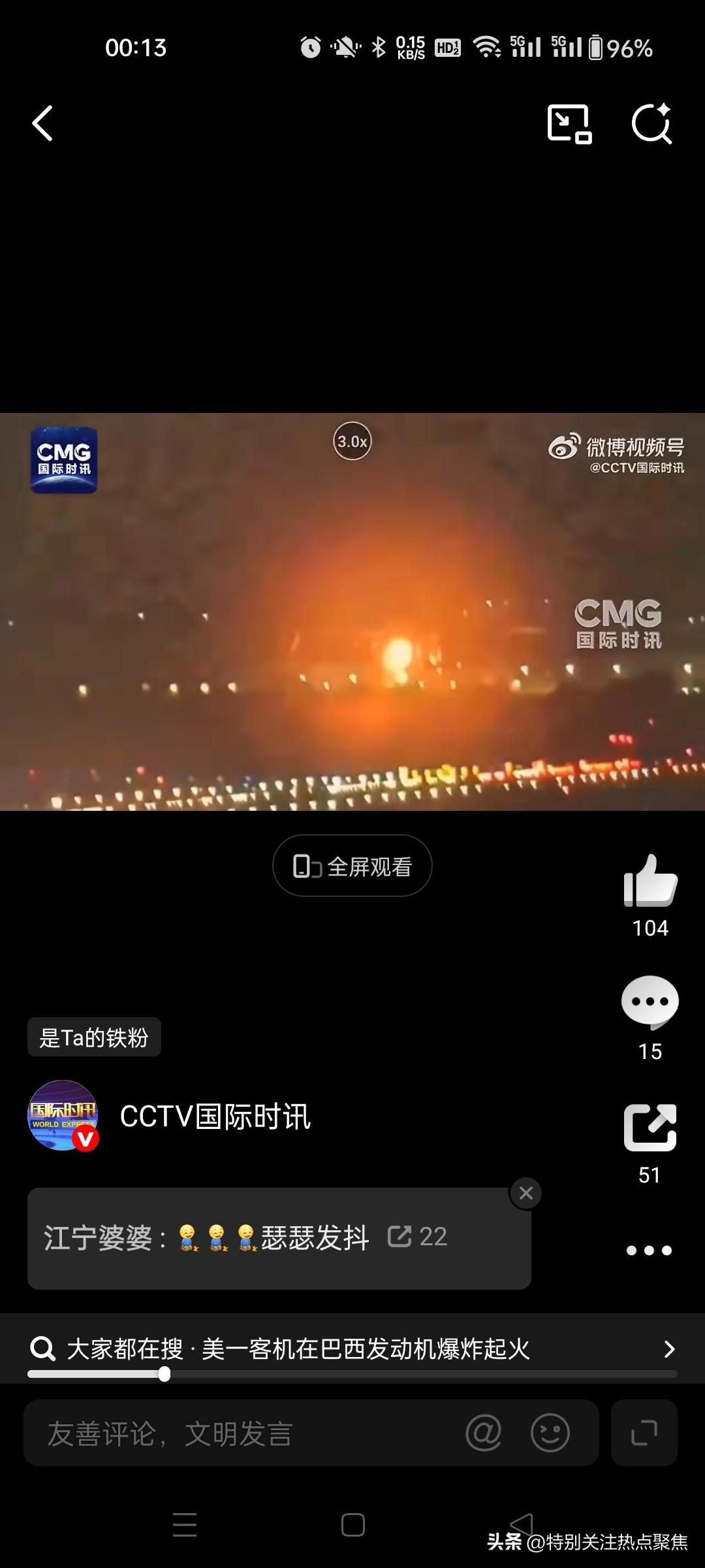 达美航空空客A330客机起飞后不久左侧发动机发生爆炸。飞行员随即返航并实施紧急迫降,飞机最终安全降落,机上人员无人伤亡。 事件概要:当地时间2026年3月29日晚,达美航空一架空客A330-300客机(航班号DL104,注册号N813NW)从巴西圣保罗瓜鲁柳斯国际机场起飞后不久,左侧发动机发生爆炸并起火,伴随多声巨响和持续火光。 机组处置:飞行员立即中断起飞程序,返航并于约9分钟后安全紧急迫降,未造成人员伤亡。 机上情况:航班原计划飞往美国亚特兰大,机上共286人(含乘客与机组),事故发生时刚完成抬轮阶段,后排乘客目击了发动机着火全过程,客舱一度陷入恐慌。 地面影响:部分发动机碎片坠落至机场草坪区域,引发地面火情,已被消防部门迅速控制。 后续安排:航班已取消,所有乘客被安置在圣保罗当地酒店,行程将重新安排。 飞机信息:涉事飞机为A330-300型,搭载普惠PW4168A发动机,机龄约19.3年。 事故原因:目前仍在调查中,初步猜测可能与鸟击或异物吸入有关,但尚未有官方结论。