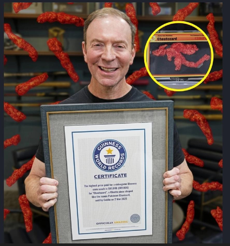 一块外形酷似日本著名游戏动漫《宝可梦》(Pokémon)中角色「喷火龙」的粟米条,近日不仅以87,840美元(折合约68.5万港元)的天价在美国拍卖网站上成交,更正式获得健力士世界纪录认证,成为「史上最昂贵的电玩角色造型粟米零食」,引发网民热议。 这条被暱称为「奇多龙」(Cheetozard)的粟米条长约8厘米,其外形奇特,清晰可见喷火龙标志性的双翼与尾巴轮廓。据悉,这块本身为香辣芝士口味的零食,由一位收藏店东主早前以350美元(约2,730港元)的价格购入,其后因在社交平台上分享而声名大噪,身价在数年间暴涨超过250倍。Goldin拍卖行托管部主管艾默曼(Dave Amerman)指出,此物品的独特之处在于它成功跨越了《宝可梦》与零食文化两大收藏群体,是极为罕见的收藏媒介。为妥善保存,卖家特意将这块珍贵的粟米条镶嵌于特制的宝可梦卡牌底座上,并以透明展示盒封装,以防被人误食。 事实上,收藏市场对稀有食品的追捧并非首次。过去亦曾有重达81.75公斤的西瓜,以及西班牙的卡夫拉莱斯蓝干酪(Cabrales blue cheese)等,均以高价拍卖成交,足见特殊食品在收藏界亦有其独特的价值。